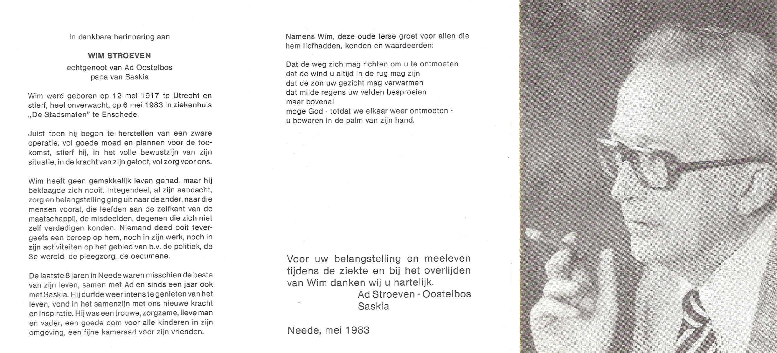STROEVEN, Wim, geboren op 12-5-1917 te Utrecht, overleden op 6-5-1983 te Enschede op 65-jarige leeftijd.