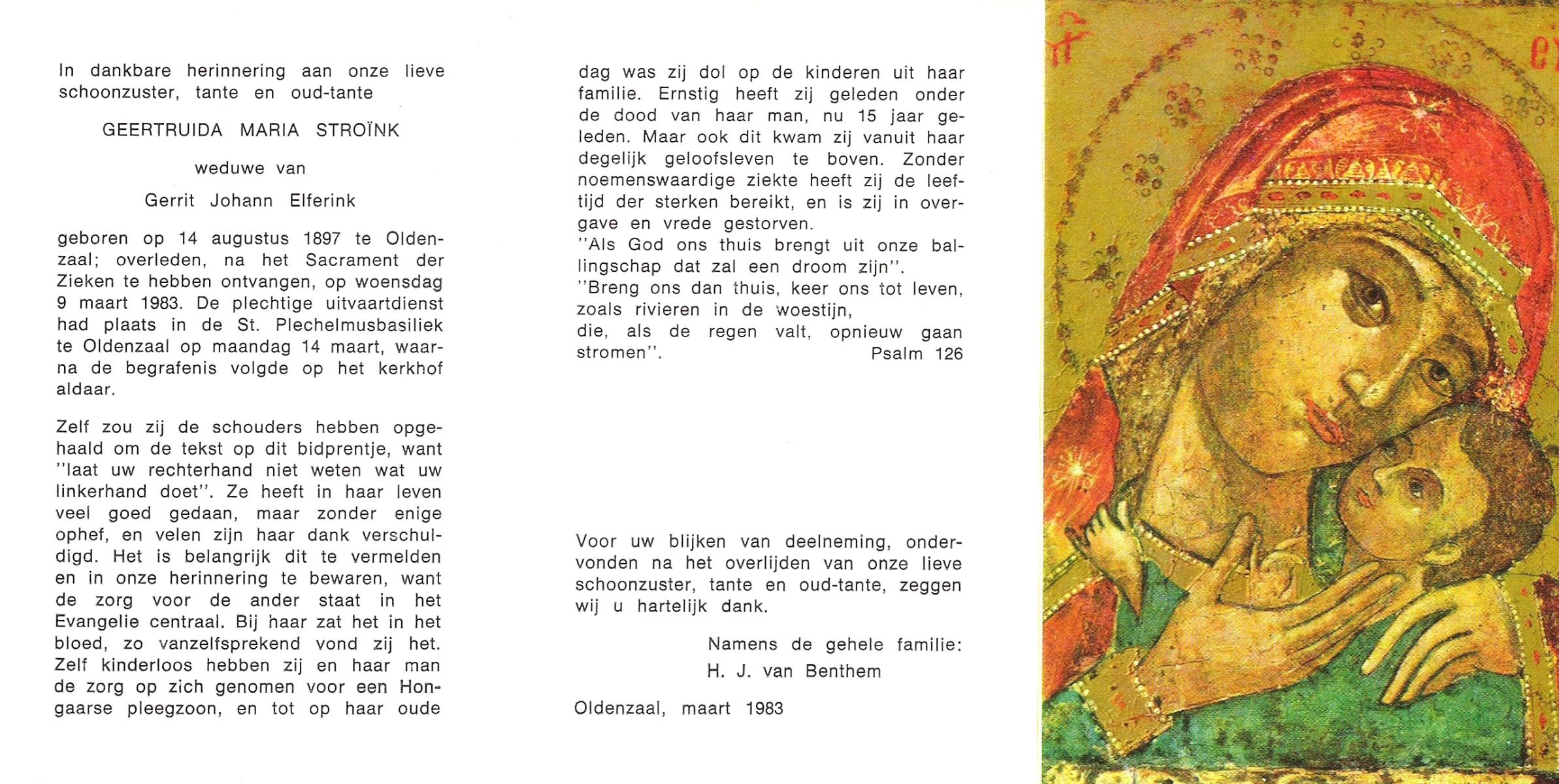 STROINK, Geertruida Maria, geboren op 14-08-1897 te Oldenzaal, overleden op 9-3-1983 te Oldenzaal op 85-jarige leeftijd, begraven op 14-3-1983 te Oldenzaal.