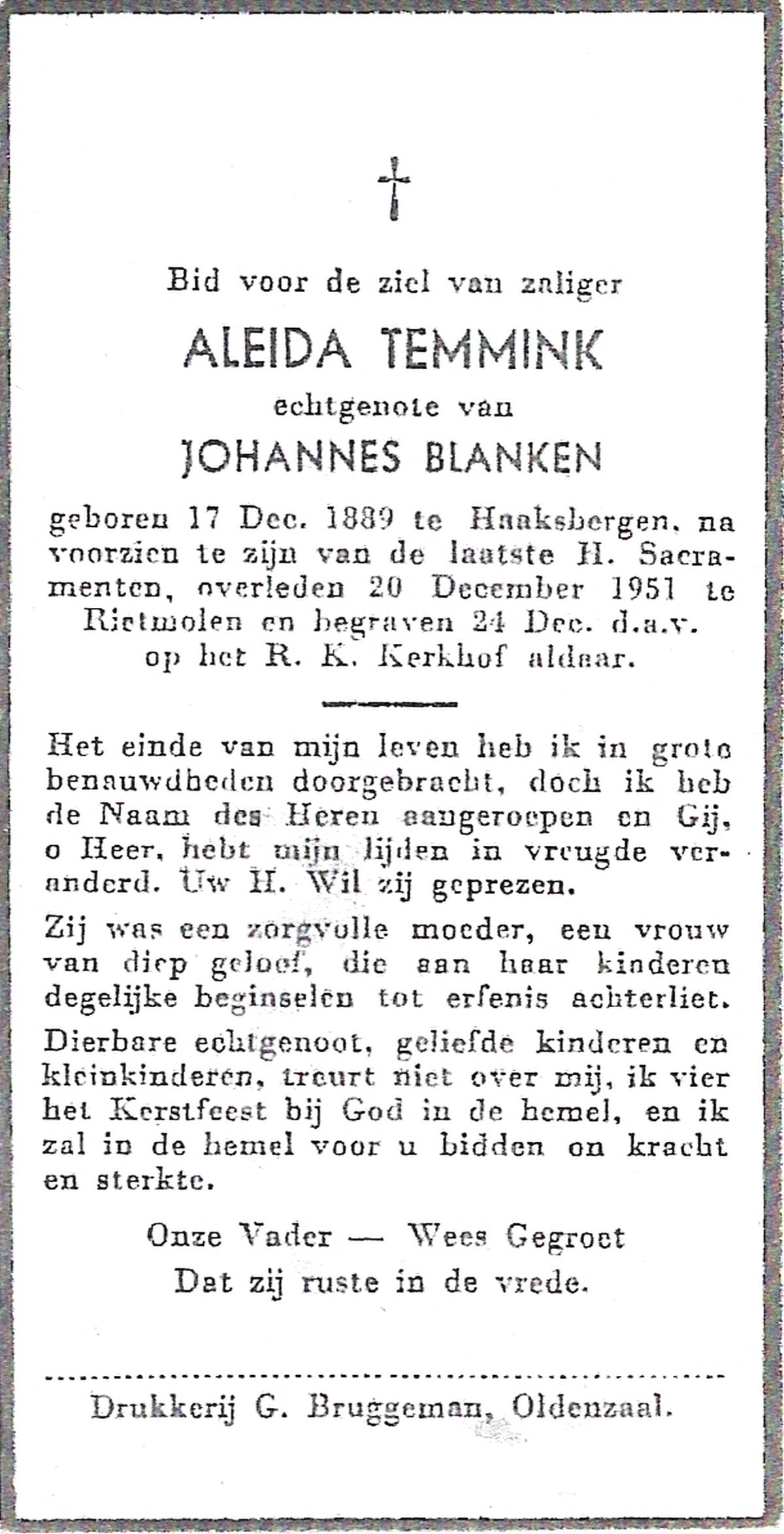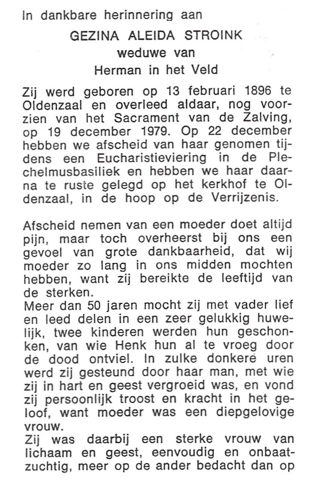 STROINK, Gezina Aleida, geboren op 13-02-1896 te Oldenzaal, overleden op 19-12-1979 te Oldenzaal op 83-jarige leeftijd, begraven op 22-12-1979 te Oldenzaal.