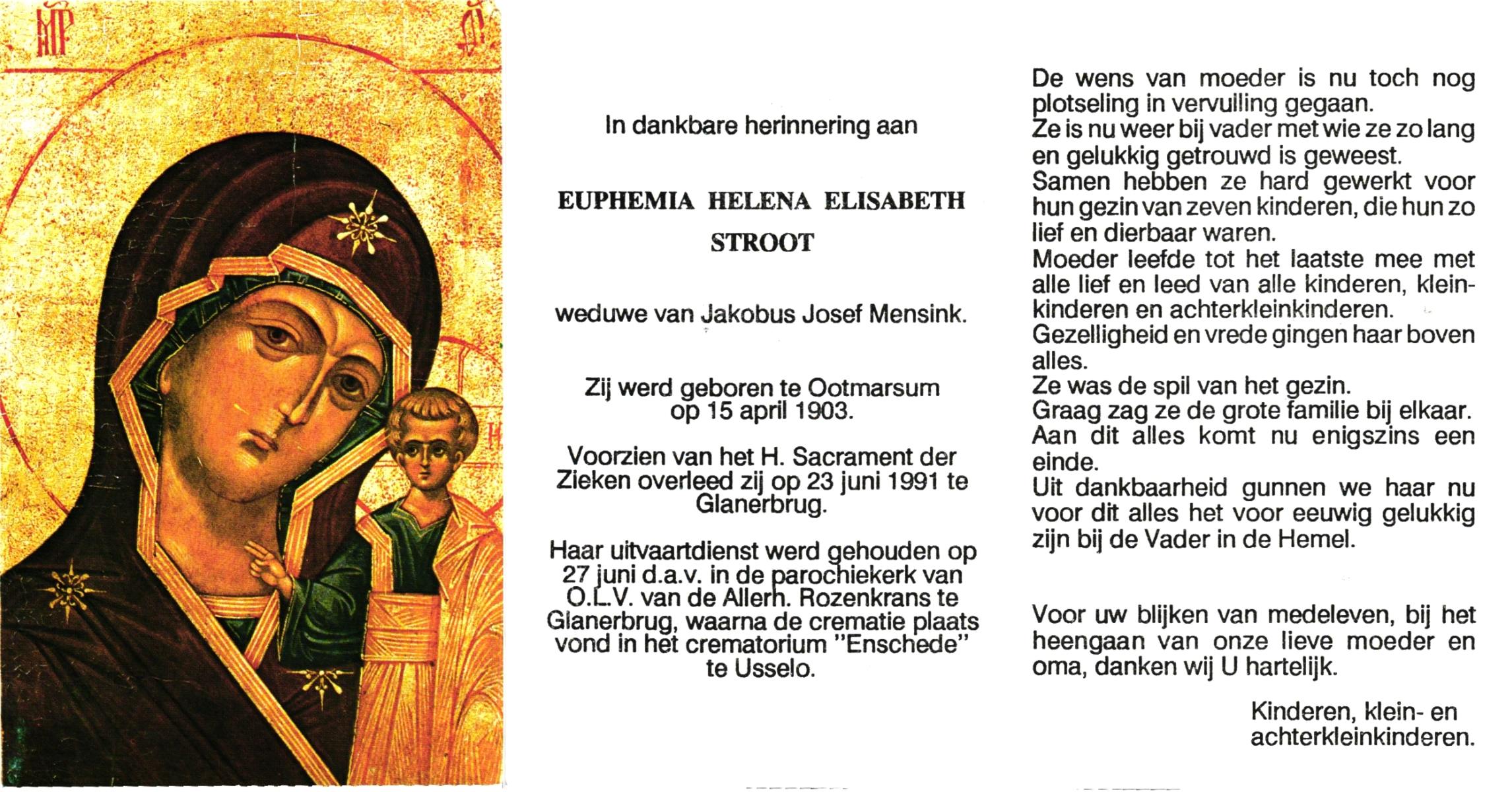 STROOT, Euphemia Helena Elisabeth, geboren op 15-4-1903 te Ootmarsum, overleden op 23-6-1991 te Glanerbrug op 88-jarige leeftijd, gecremeerd op 27-6-1991 te Usselo.