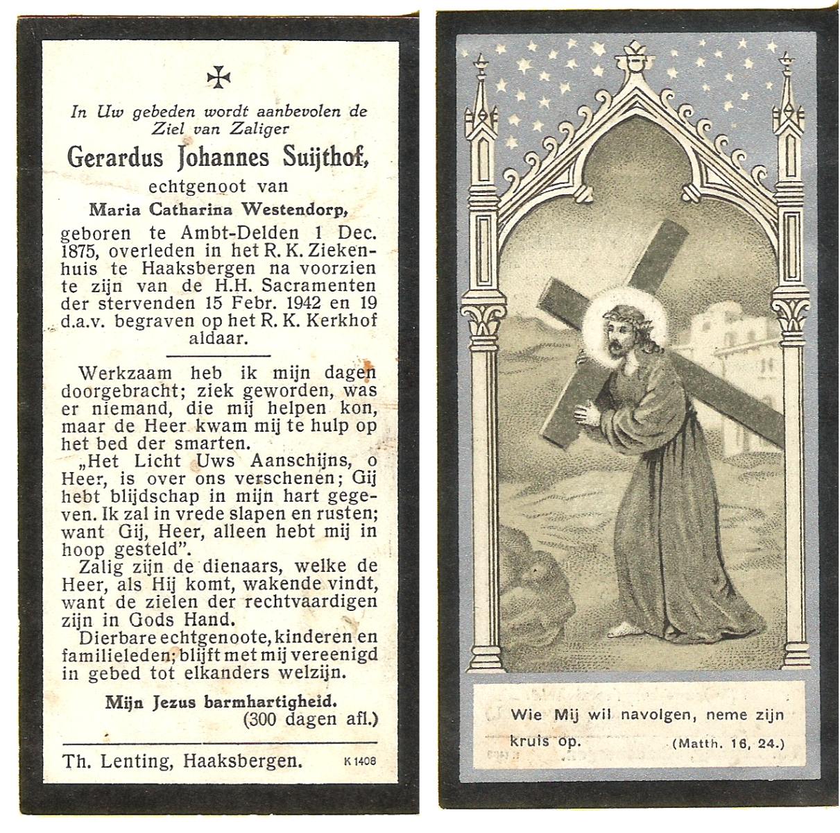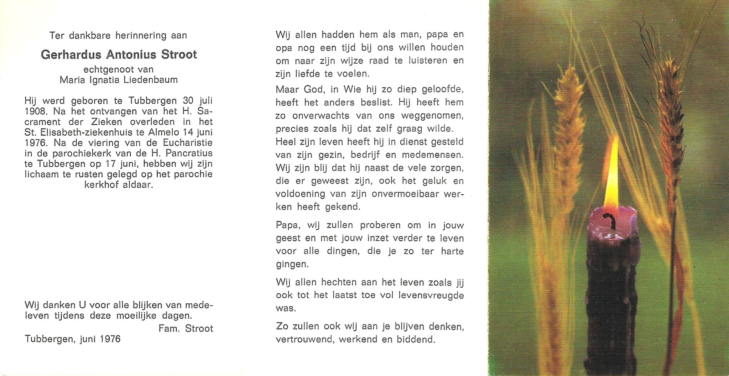 STROOT, Gerhardus Antonius, geboren op 30-7-1908 te Tubbergen, overleden op 14-6-1976 te Almelo op 67-jarige leeftijd, begraven op 17-6-1976 te Tubbergen.