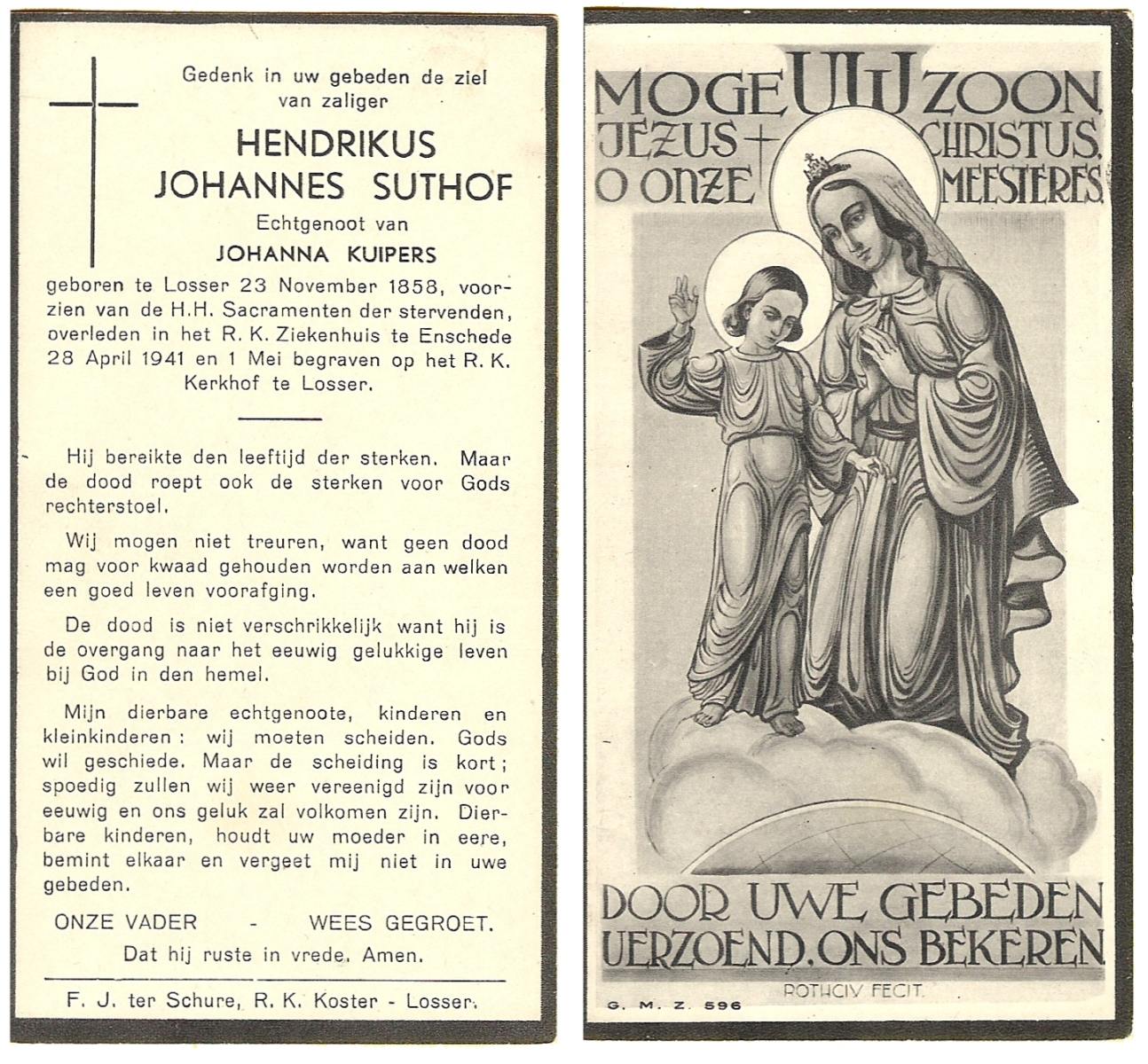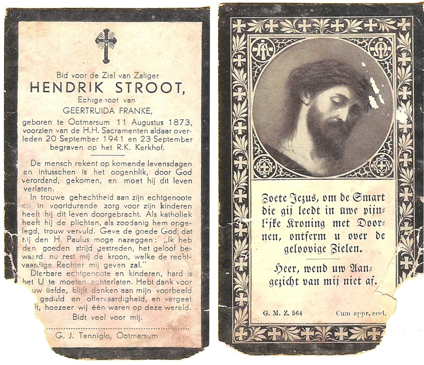 STROOT, Hendrik, geboren op 11-08-1873 te Ootmarsum, overleden op 20-9-1941 te Ootmarsum op 68-jarige leeftijd, begraven op 23-9-1941 te Ootmarsum R.K.kerkhof.