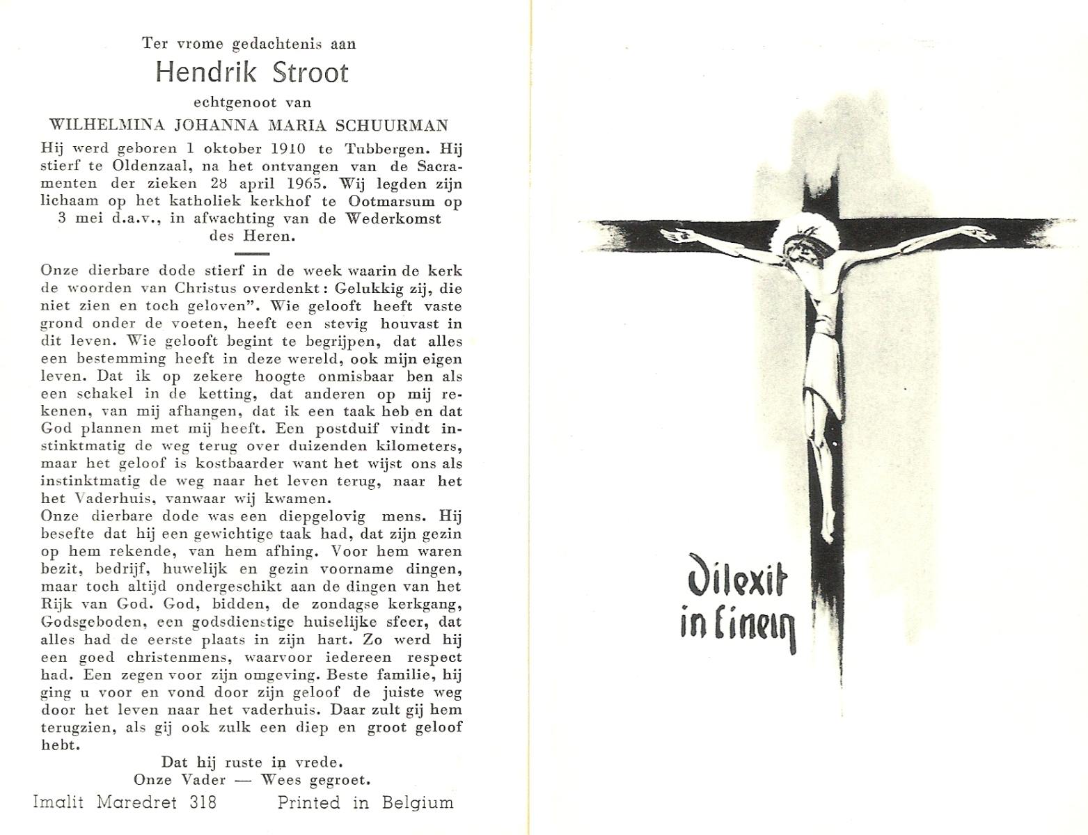 STROOT, Hendrik, geboren op 1-10-1910 te Tubbergen, overleden op 28-4-1965 te Oldenzaal op 54-jarige leeftijd, begraven op 3-5-1965 te Ootmarsum.