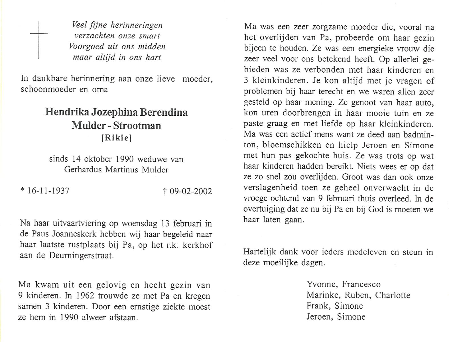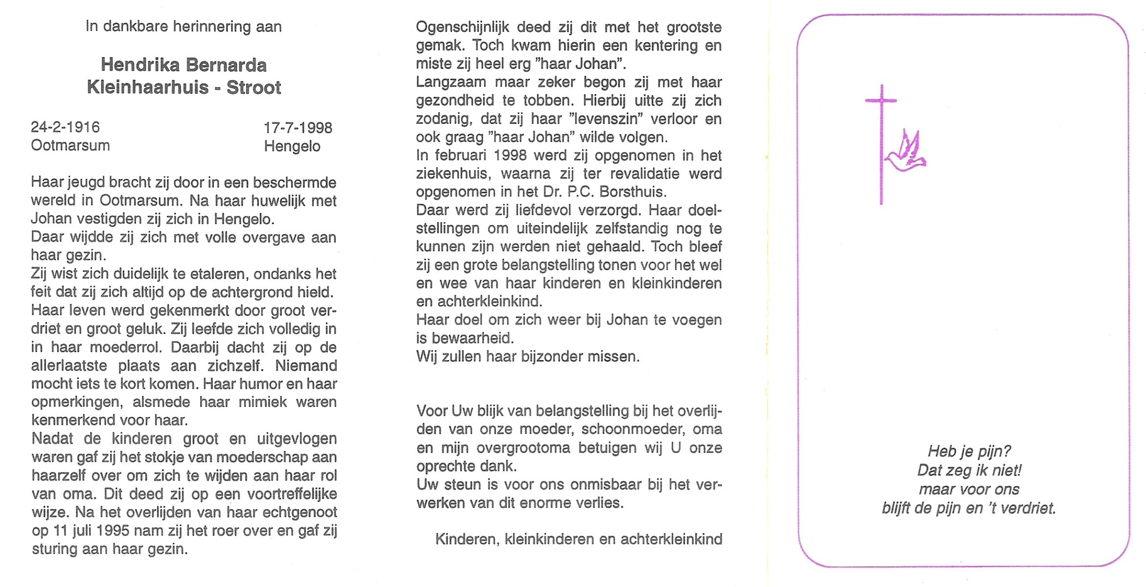 STROOT, Hendrika Bernarda, geboren op 24-2-1916 te Ootmarsum, overleden op 17-7-1998 te Hengelo (Ov.) op 82-jarige leeftijd.