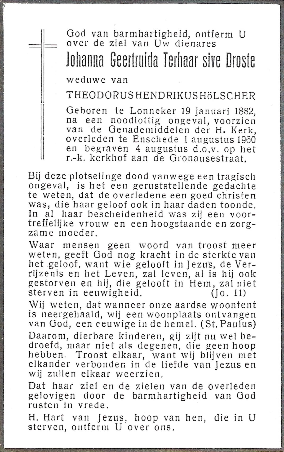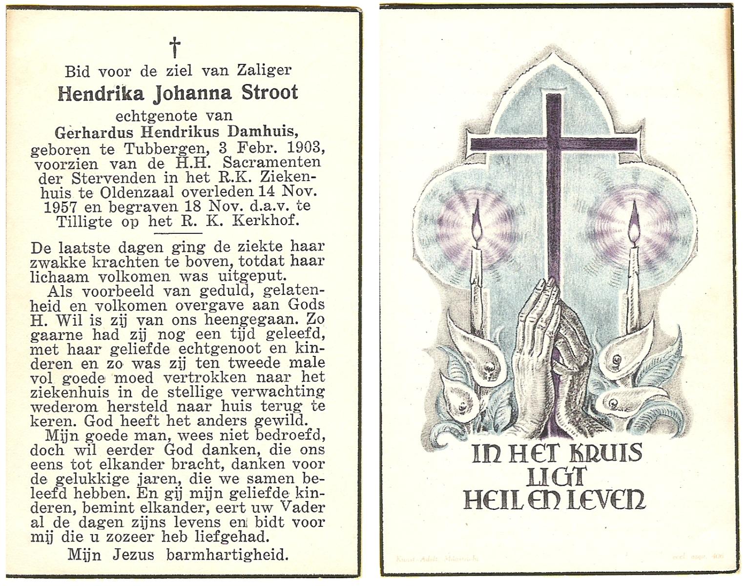 STROOT, Hendrika Johanna, geboren op 3-2-1903 te Tubbergen, overleden op 14-11-1957 te Oldenzaal op 54-jarige leeftijd, begraven op 18-11-1957 te Tilligte R.K.kerhof.