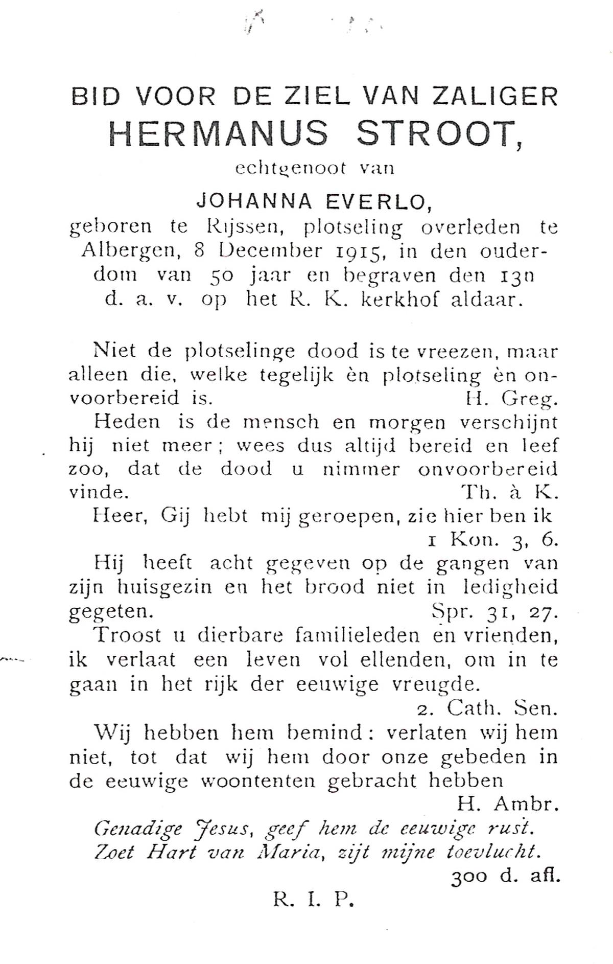 STROOT, Hermanus, geboren te Rijssen, overleden op 8-12-1915 te Albergen op 50-jarige leeftijd, begraven op 13-12-1915 te Albergen.