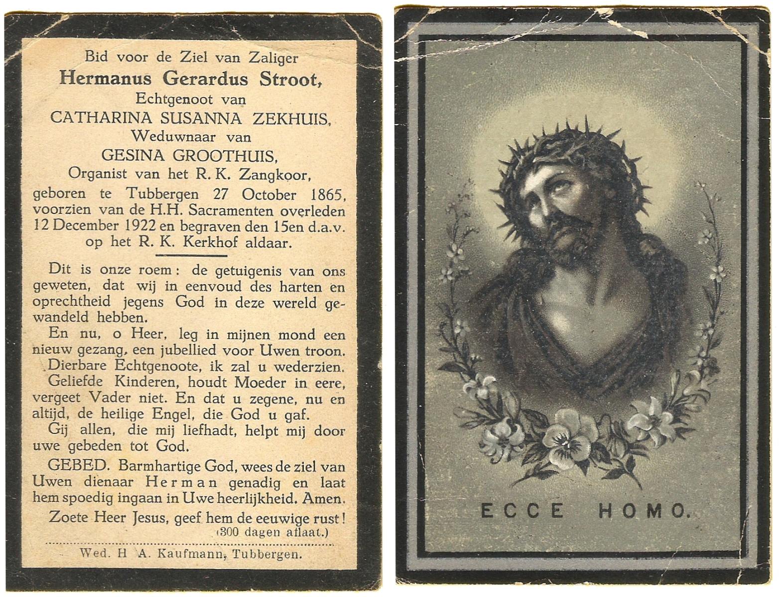 STROOT, Hermanus Gerardus, geboren op 27-10-1865 te Tubbergen, overleden op 12-12-1922 te Tubbergen op 57-jarige leeftijd, begraven op 15-12-1922 te Tubbergen.