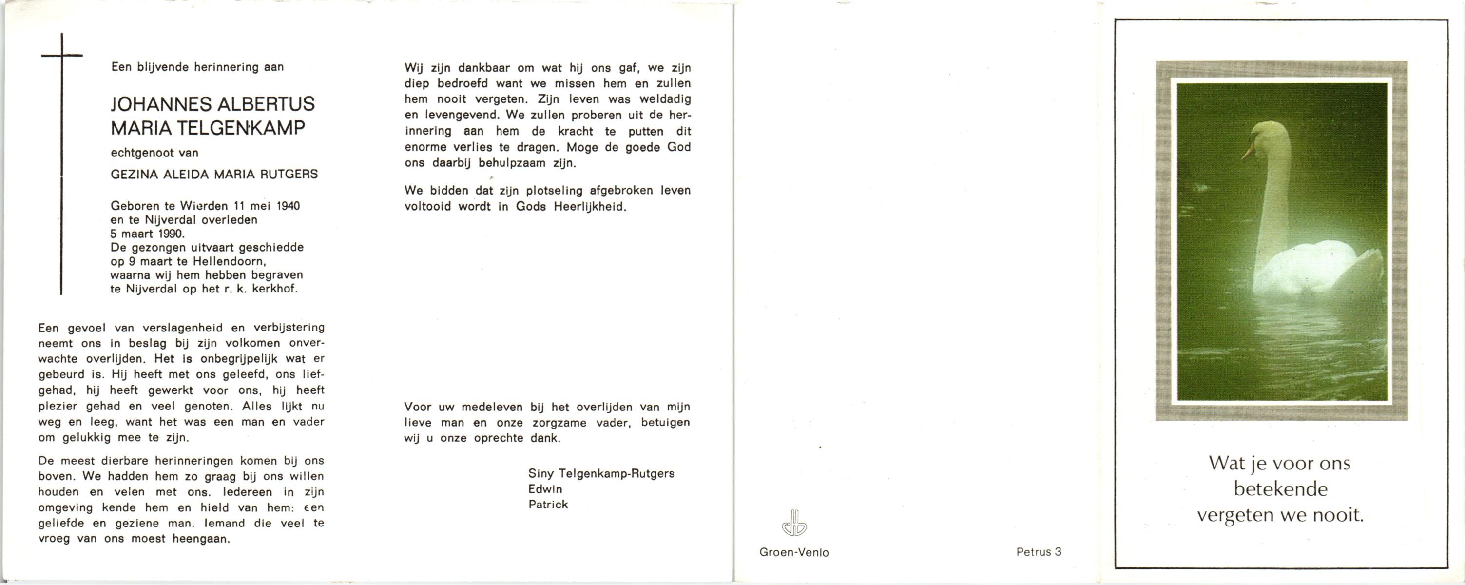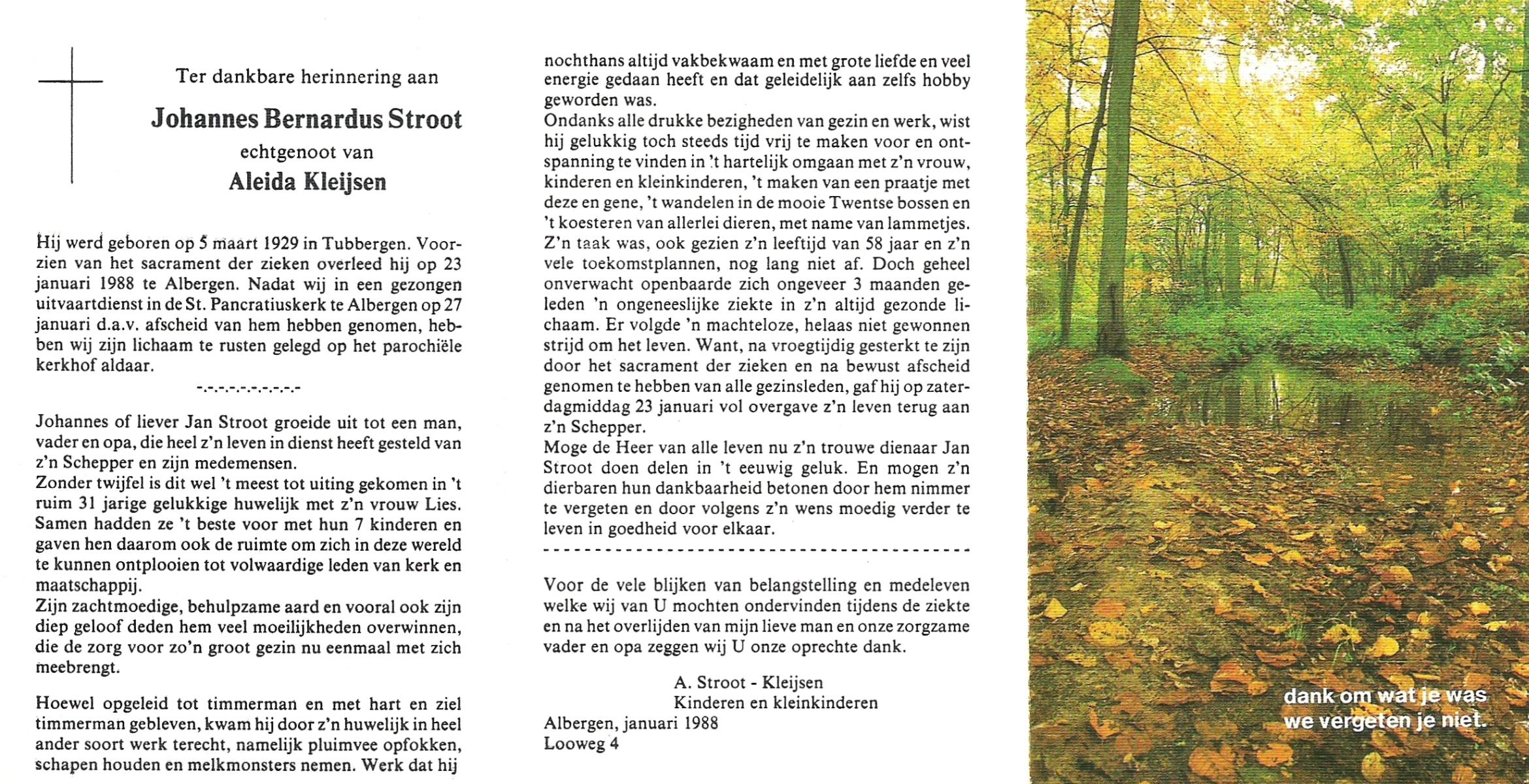 STROOT, Johannes Bernardus, geboren op 5-3-1929 te Tubbergen, overleden op 23-1-1988 te Albergen op 58-jarige leeftijd, begraven op 27-1-1988 te Albergen.