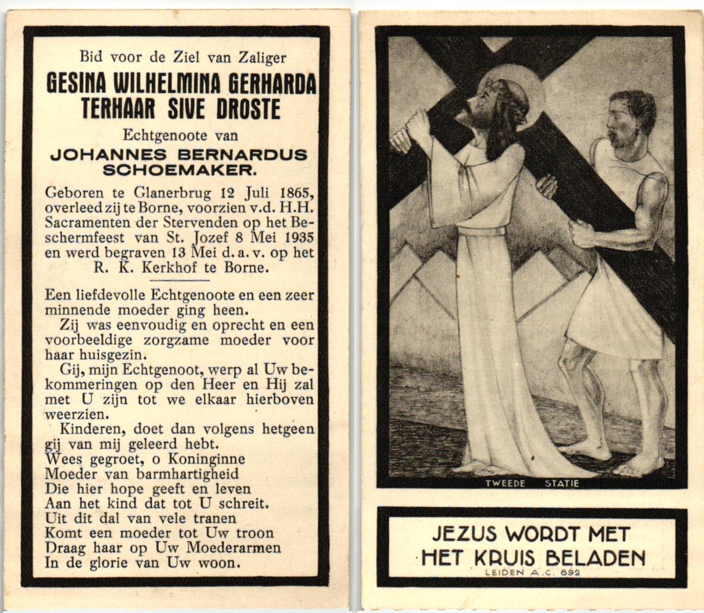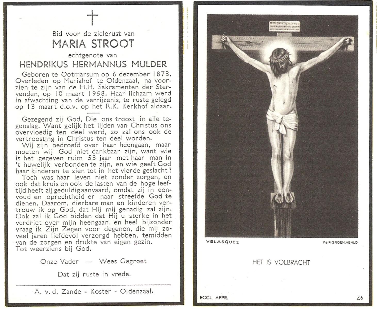 STROOT, Maria, geboren op 06-12-1873 te Ootmarsum, overleden op 10-3-1958 te Oldenzaal op 84-jarige leeftijd, begraven op 13-3-1958 te Oldenzaal.