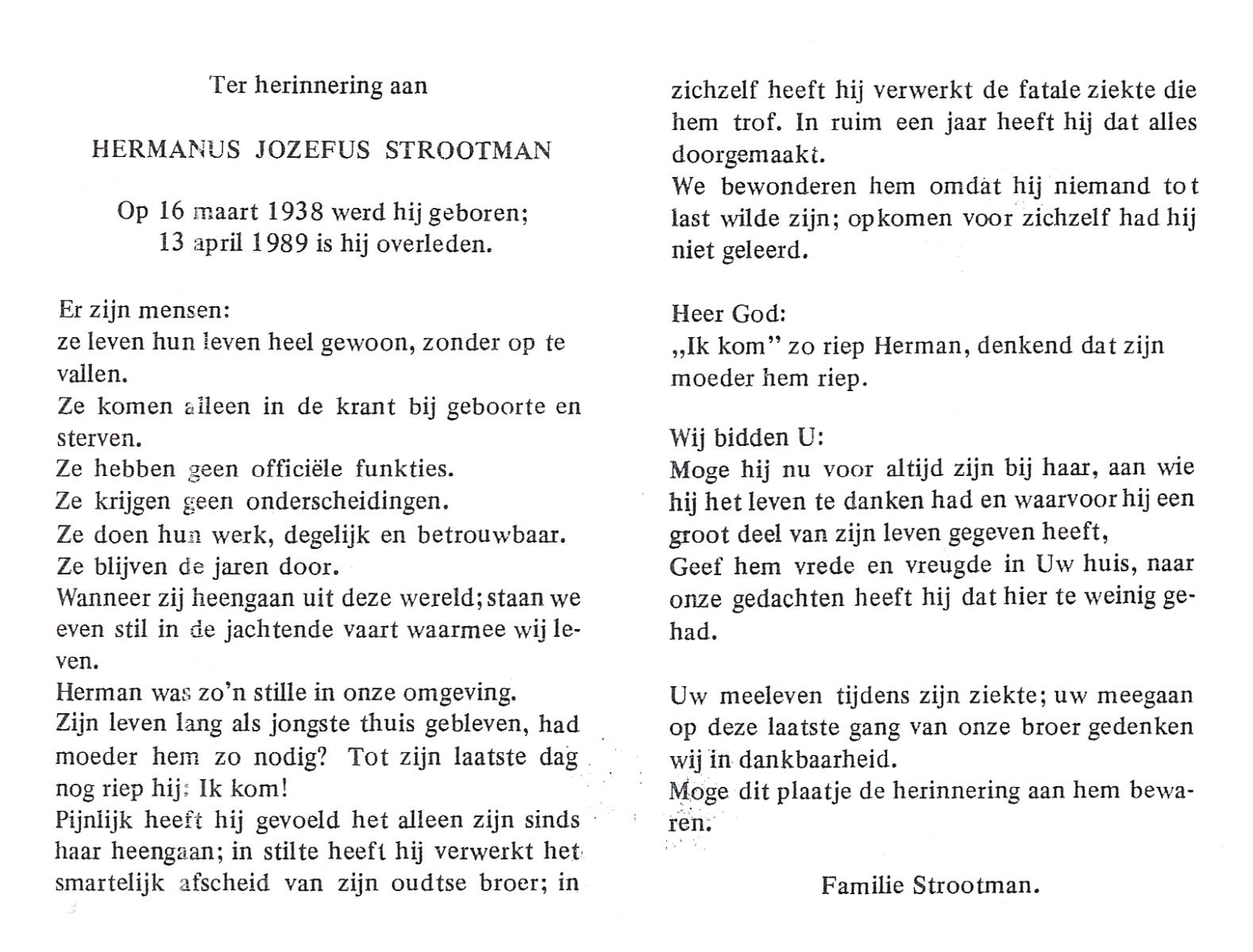 STROOTMAN, Johannes Gerhardus, geboren op 15-2-1929 te Lonneker, overleden op 9-7-1988 te Enschede op 59-jarige leeftijd, gecremeerd op 13-7-1988 te Usselo.