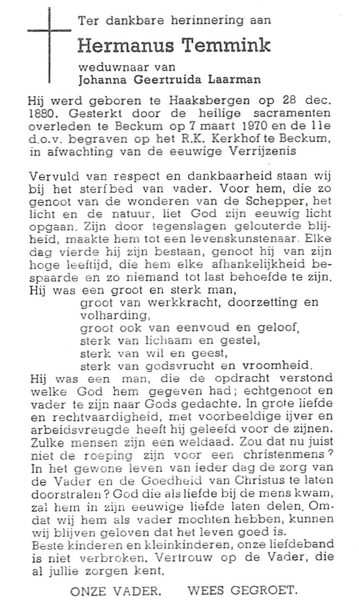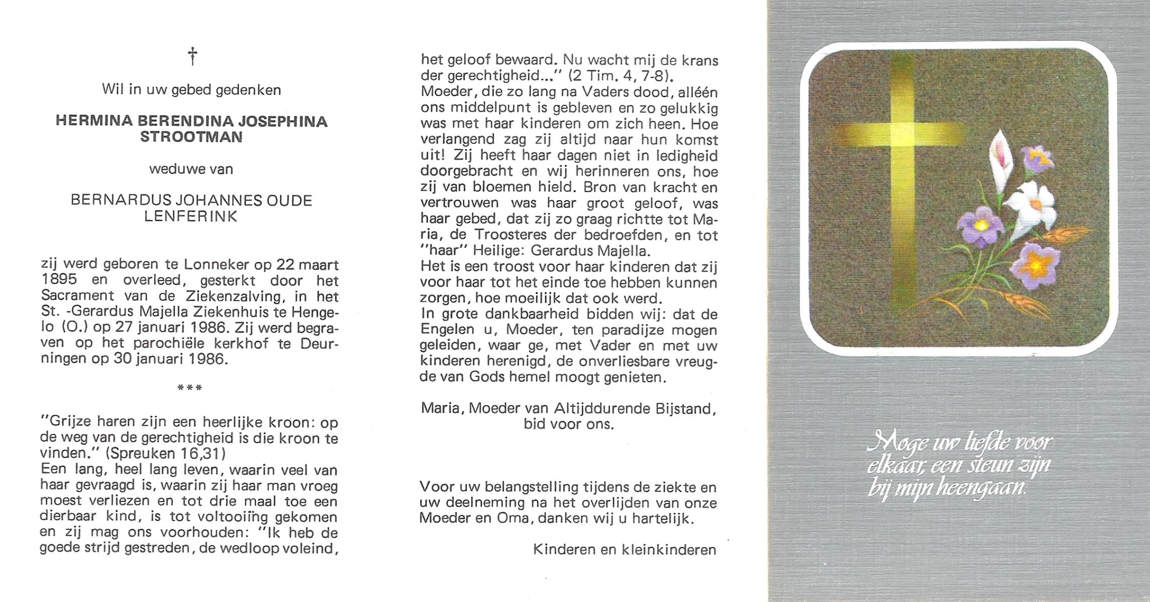 STROOTMAN, Hermina Berendina Josephina, geboren op 22-03-1895 te Lonneker, overleden op 27-1-1986 te Hengelo (Ov.) op 90-jarige leeftijd, begraven op 30-1-1986 te Deurningen.
