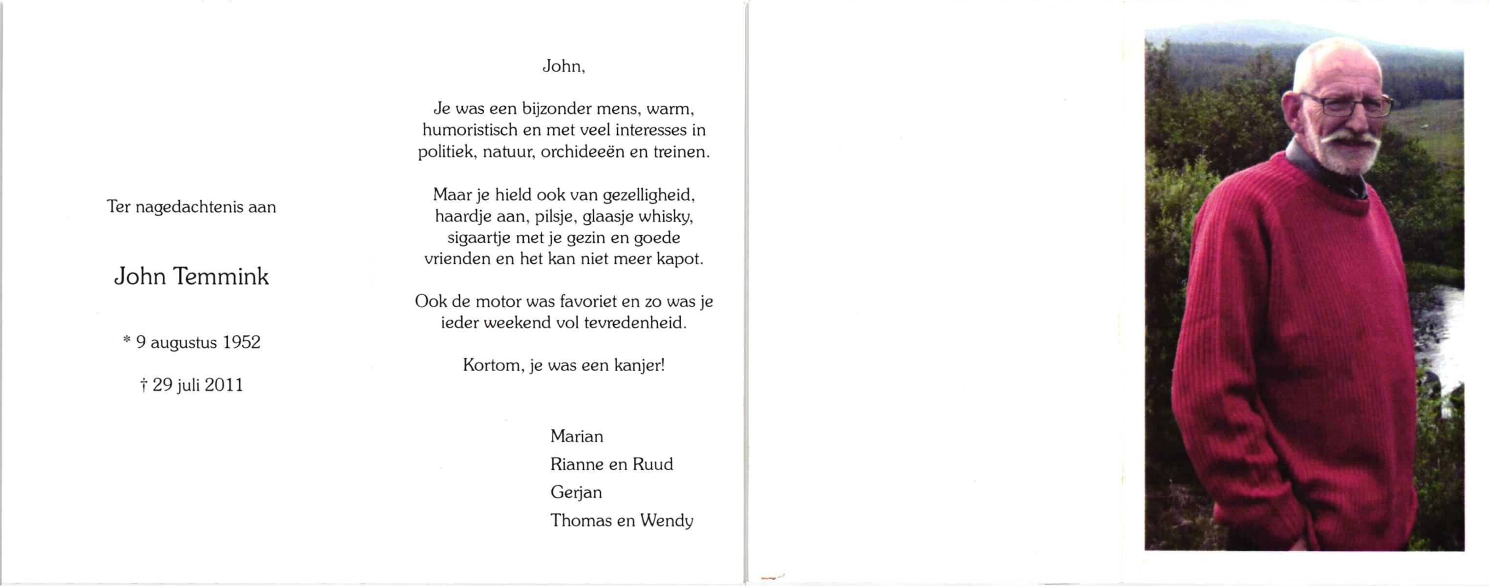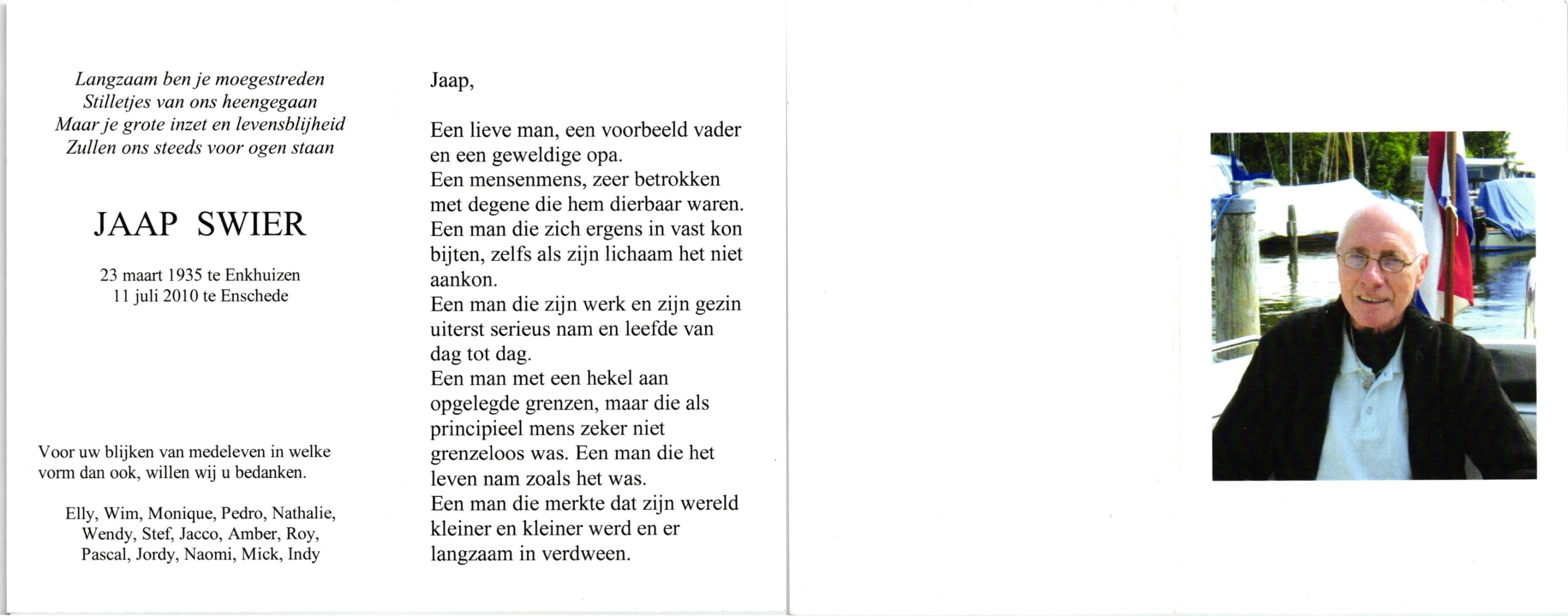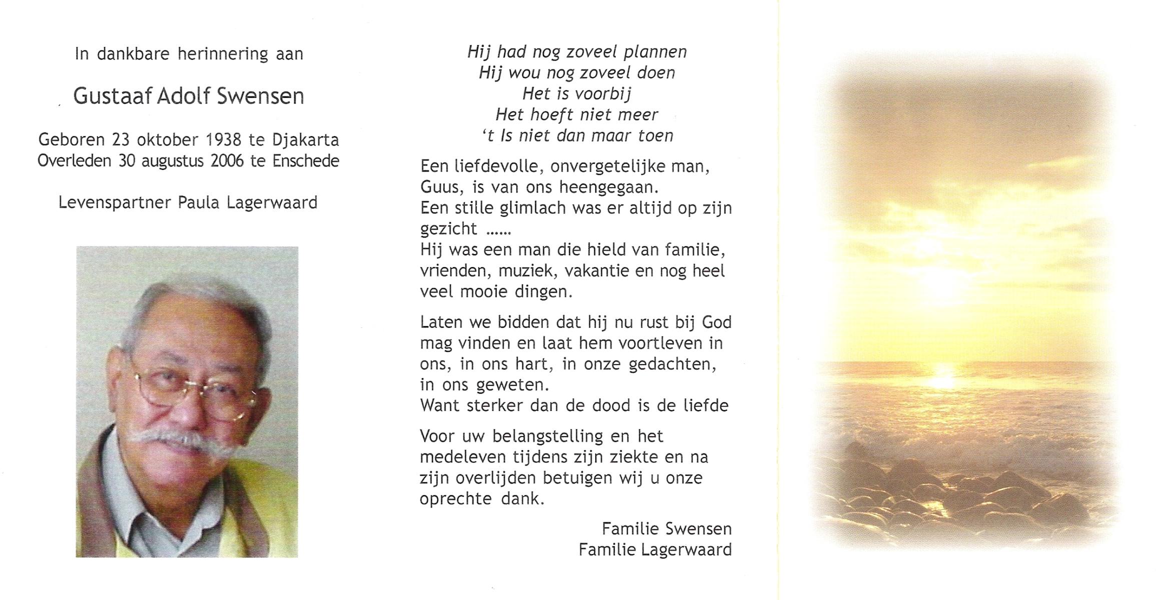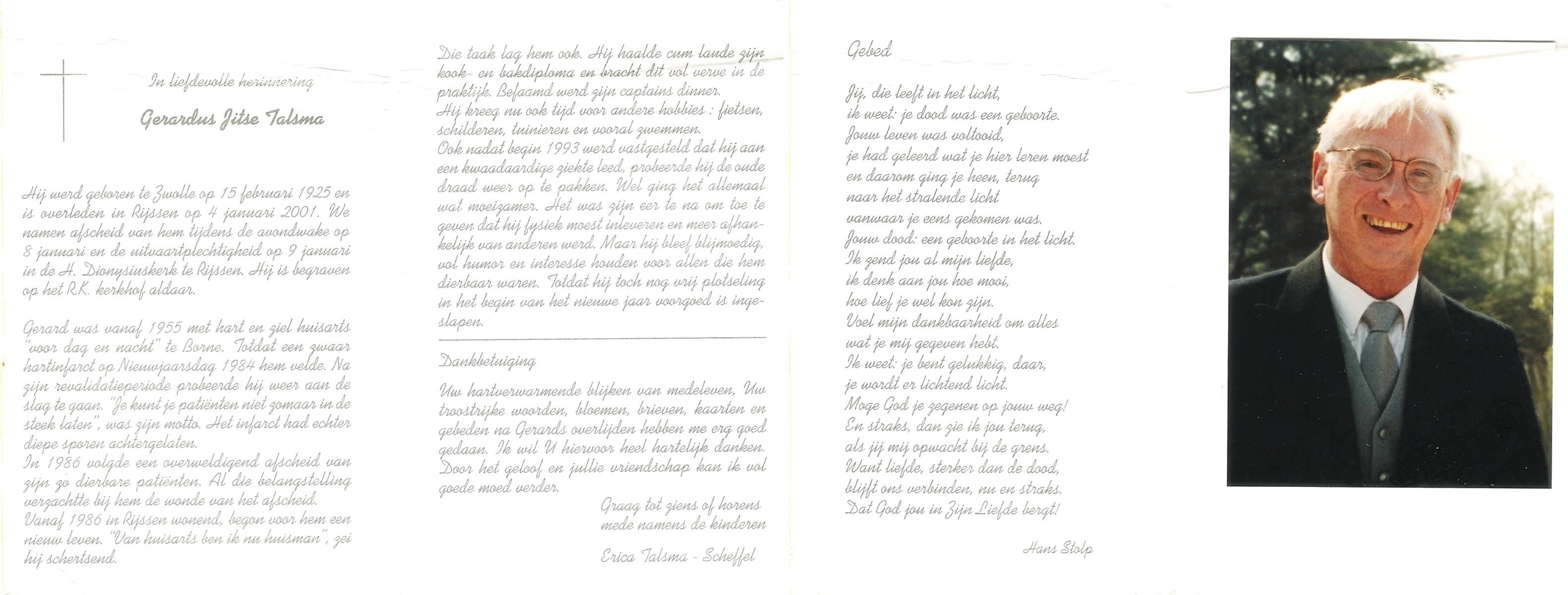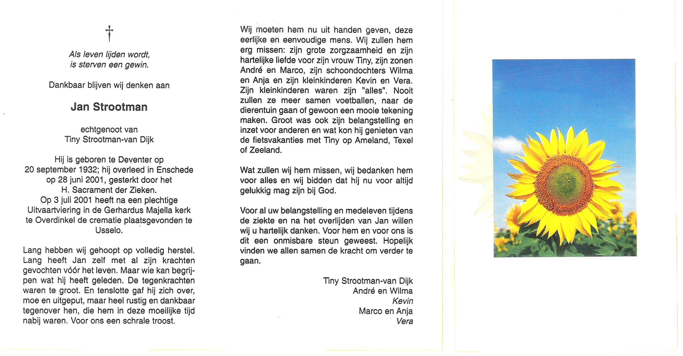 STROOTMAN, Jan, geboren op 20-9-1932 te Deventer, overleden op 28-6-2001 te Enschede op 68-jarige leeftijd, gecremeerd op 3-7-2001 te Usselo.