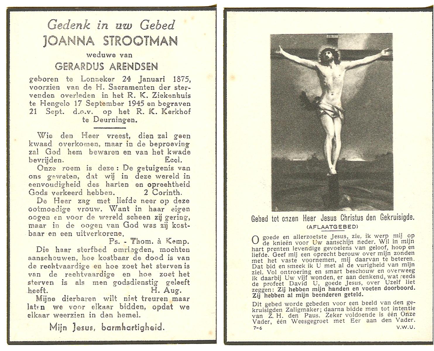 STROOTMAN, Joanna, geboren op 24-01-1875 te Lonneker, overleden op 17-9-1945 te Hengelo (Ov.) op 70-jarige leeftijd, begraven op 21-9-1945 te Deurningen.