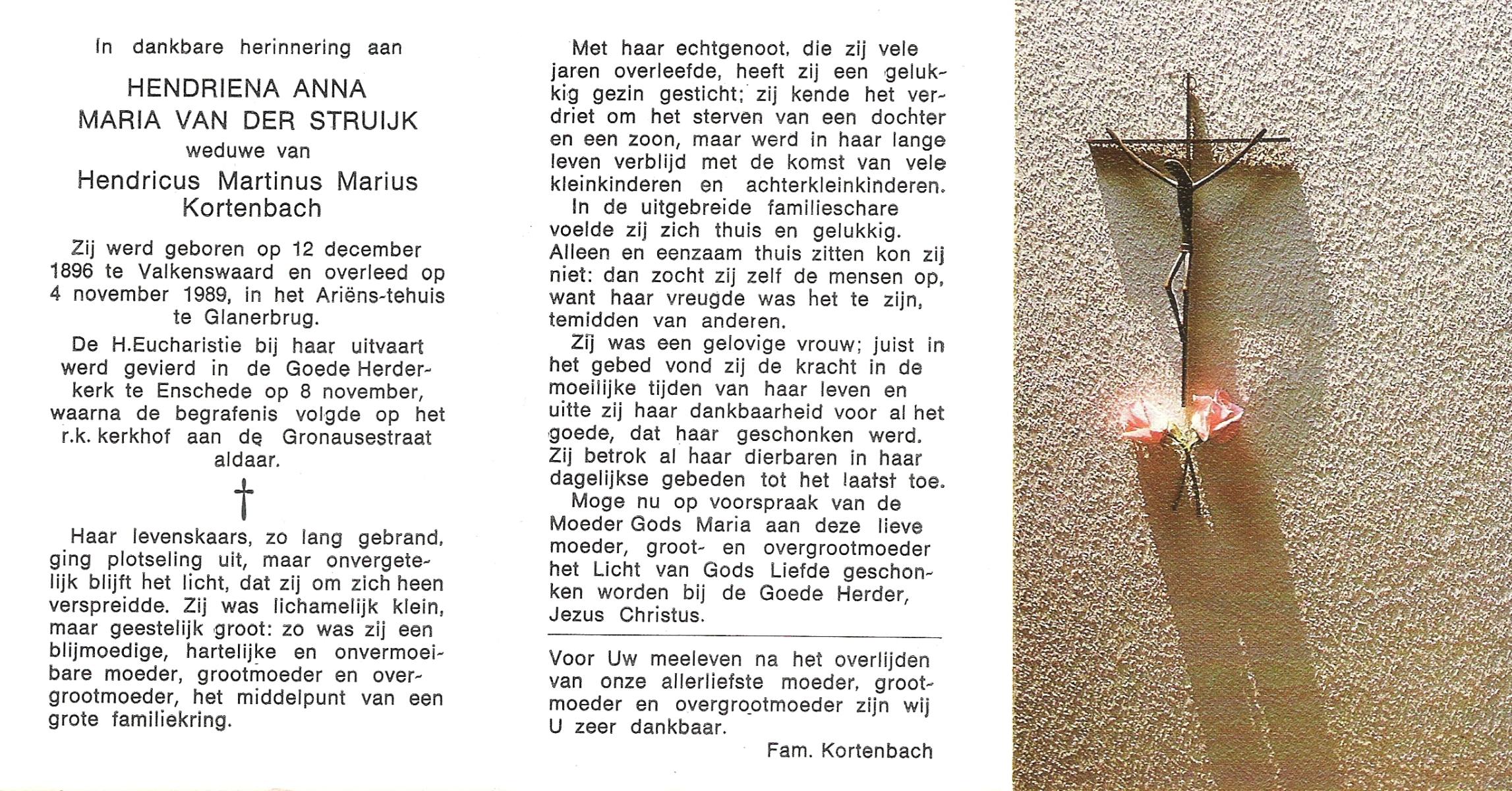 STRUIJK, van der, Hendriena Anna Maria, geboren op 12-12-1896 te Valkenswaard, overleden op 4-11-1989 te Glanerbrug op 92-jarige leeftijd, begraven op 8-11-1989 te Enschede.