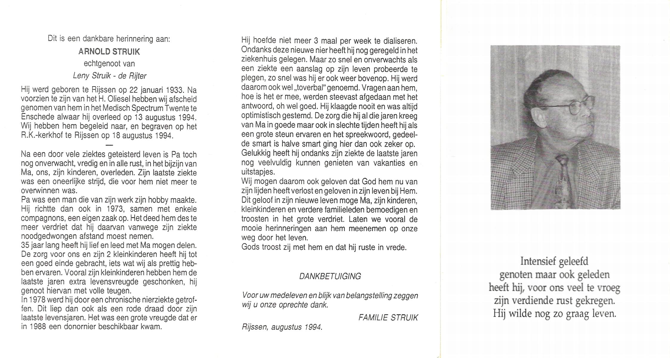 STRUIK, Arnold, geboren op 22-1-1933 te Rijssen, overleden op 13-8-1994 te Enschede op 61-jarige leeftijd, begraven op 18-8-1994 te Rijssen.