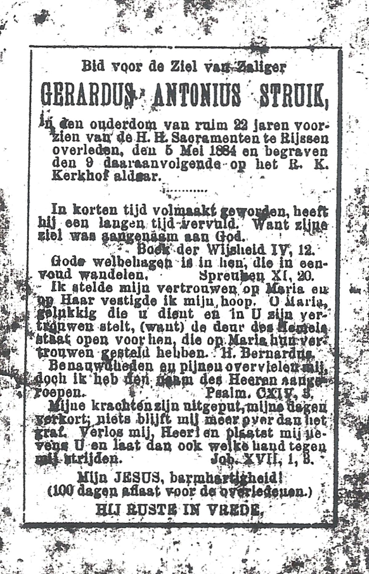 STRUIK, Gerardus Antonius, overleden op 05-05-1884 te Rijssen op 22-jarige leeftijd, begraven op 09-05-1884 te Rijssen.