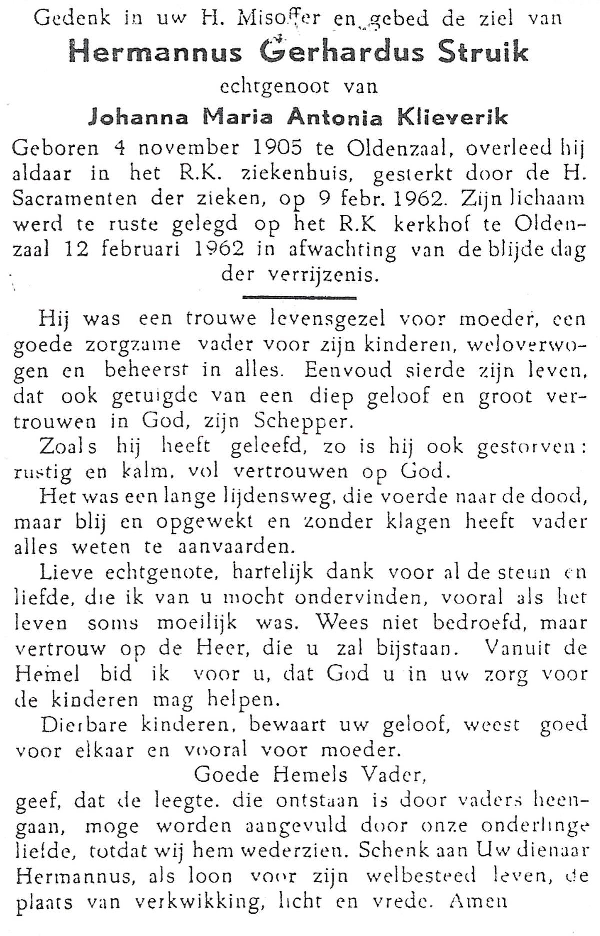 STRUIK, Hermannus Gerhardus, geboren op 4-11-1905 te Oldenzaal, overleden op 9-2-1962 te Oldenzaal op 56-jarige leeftijd, begraven op 12-2-1962 te Oldenzaal.