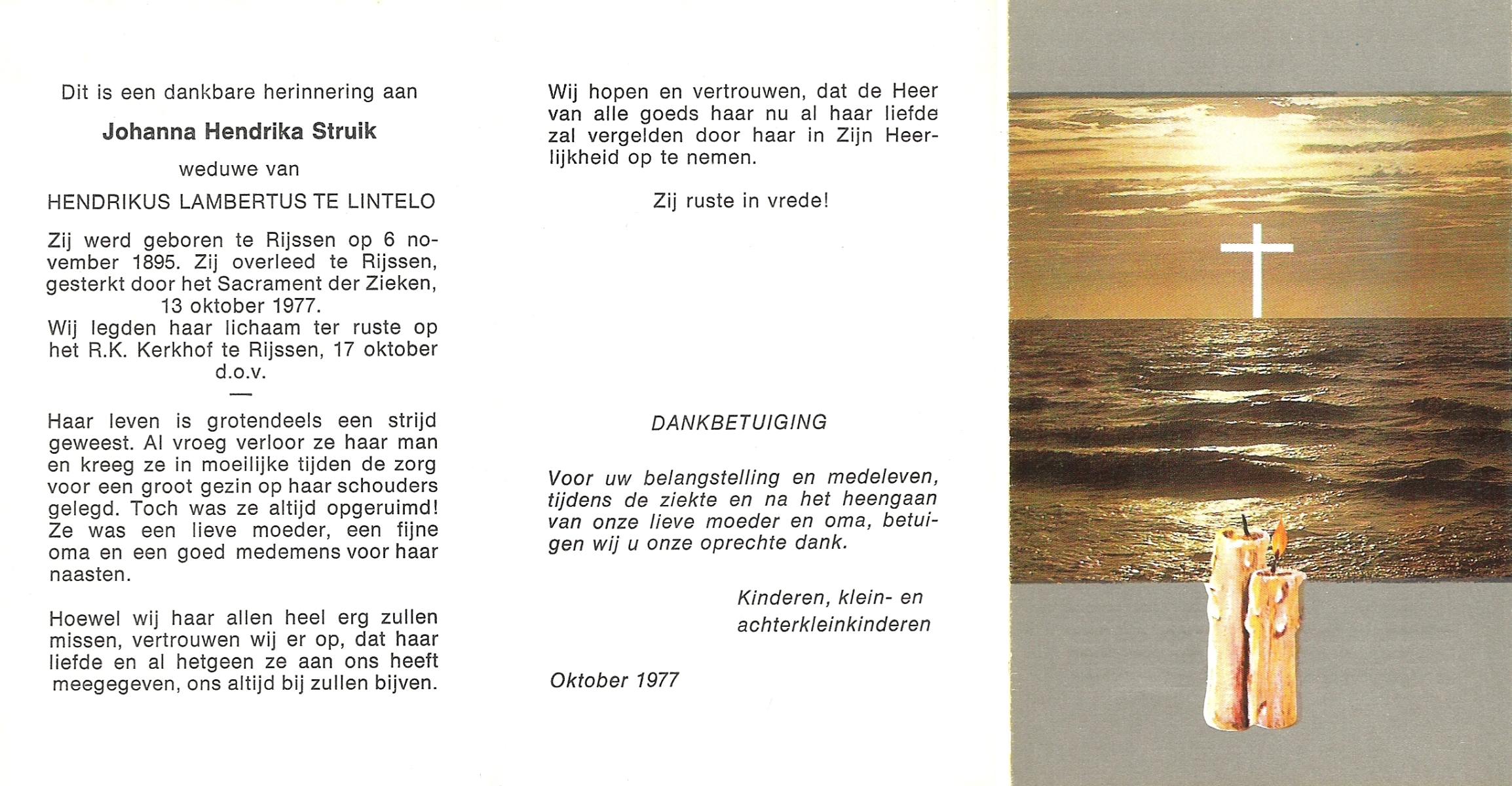 STRUIK, Johanna Hendrika, geboren op 06-11-1895 te Rijssen, overleden op 13-10-1977 te Rijssen op 81-jarige leeftijd, begraven op 17-10-1977 te Rijssen.