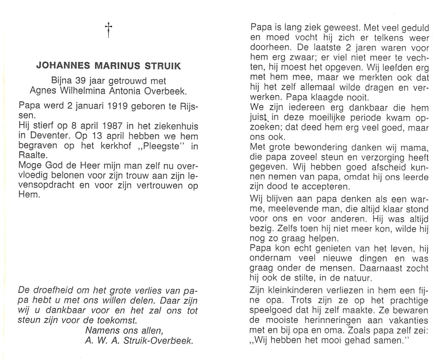 STRUIK, Gerardus Johannes, geboren op 08-03-1894 te Rijssen, overleden op 26-5-1969 te Rijssen op 75-jarige leeftijd, begraven op 29-5-1969 te Rijssen.