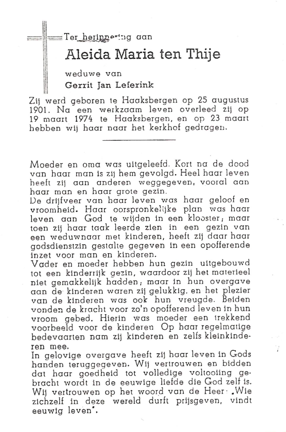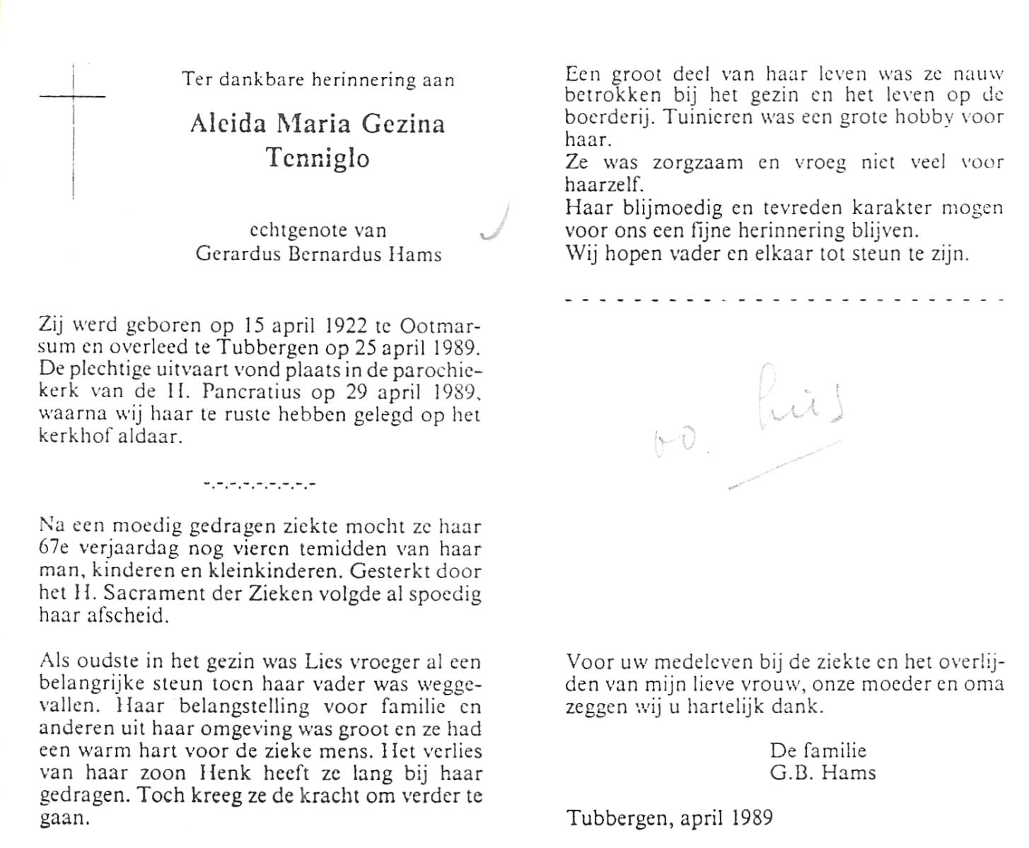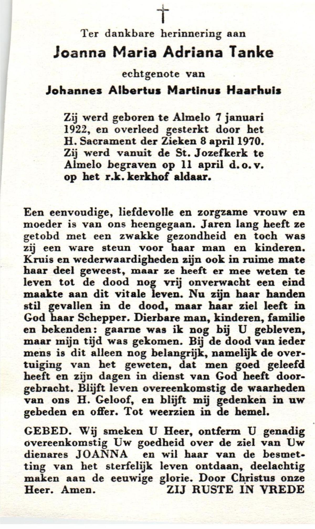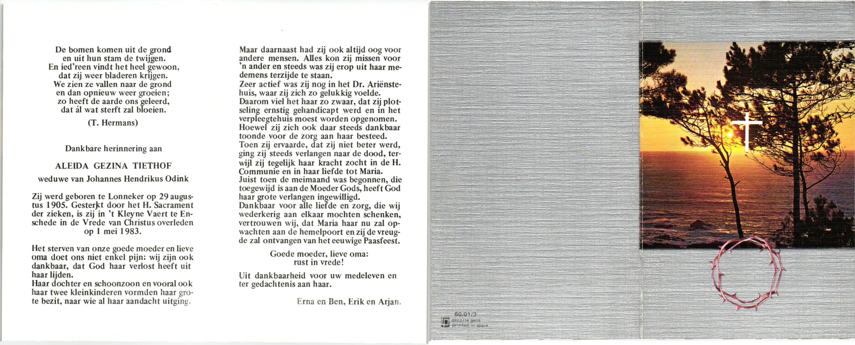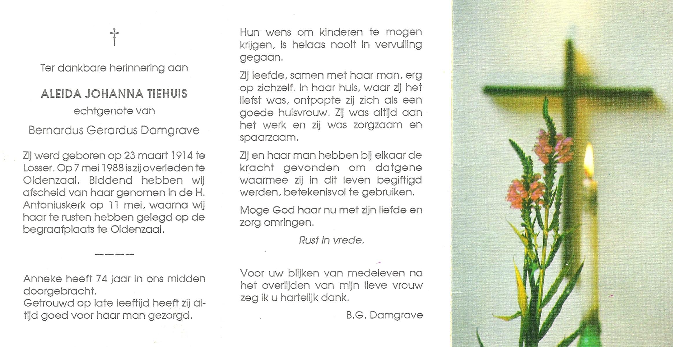 TIEHUIS, Aleida Johanna, geboren op 23-3-1914 te Losser, overleden op 7-5-1988 te Oldenzaal op 74-jarige leeftijd, begraven op 11-5-1988 te Oldenzaal.