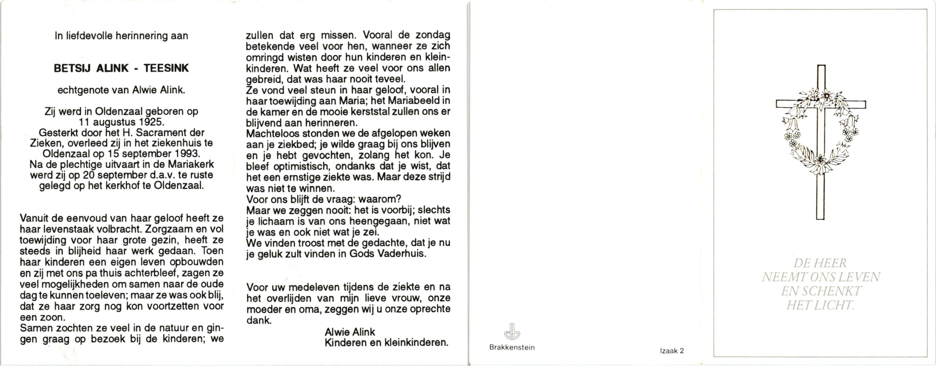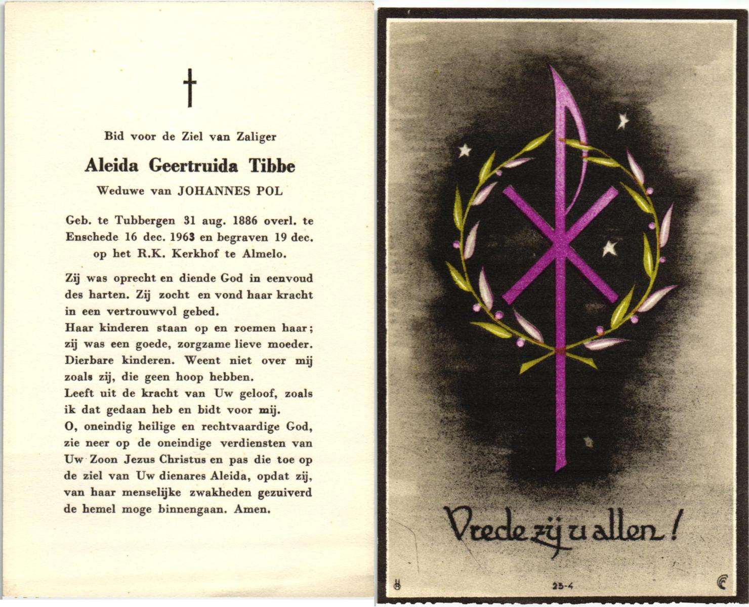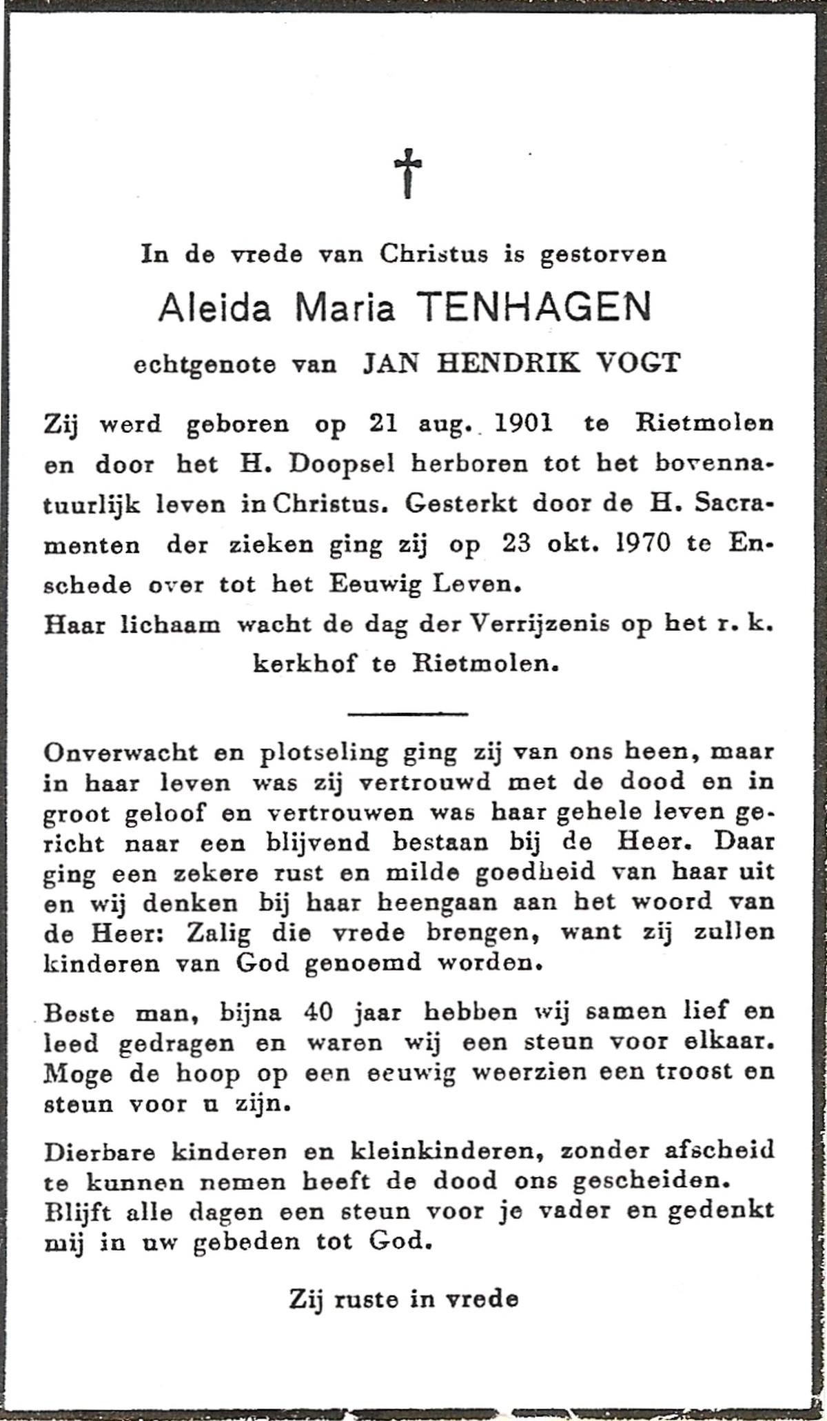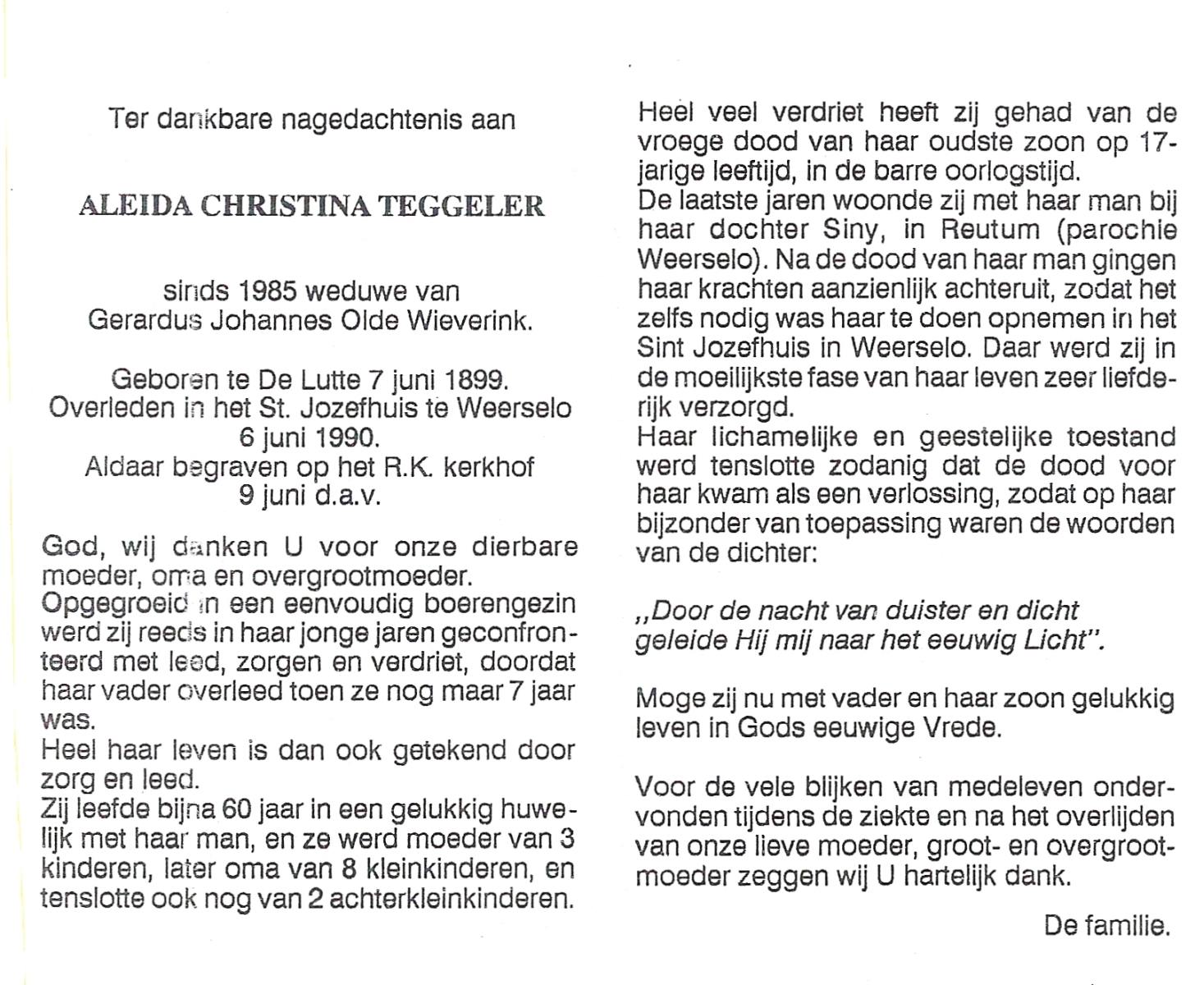 TIEHUIS, Aleida Johanna, geboren op 23-3-1914 te Losser, overleden op 7-5-1988 te Oldenzaal op 74-jarige leeftijd, begraven op 11-5-1988 te Oldenzaal.