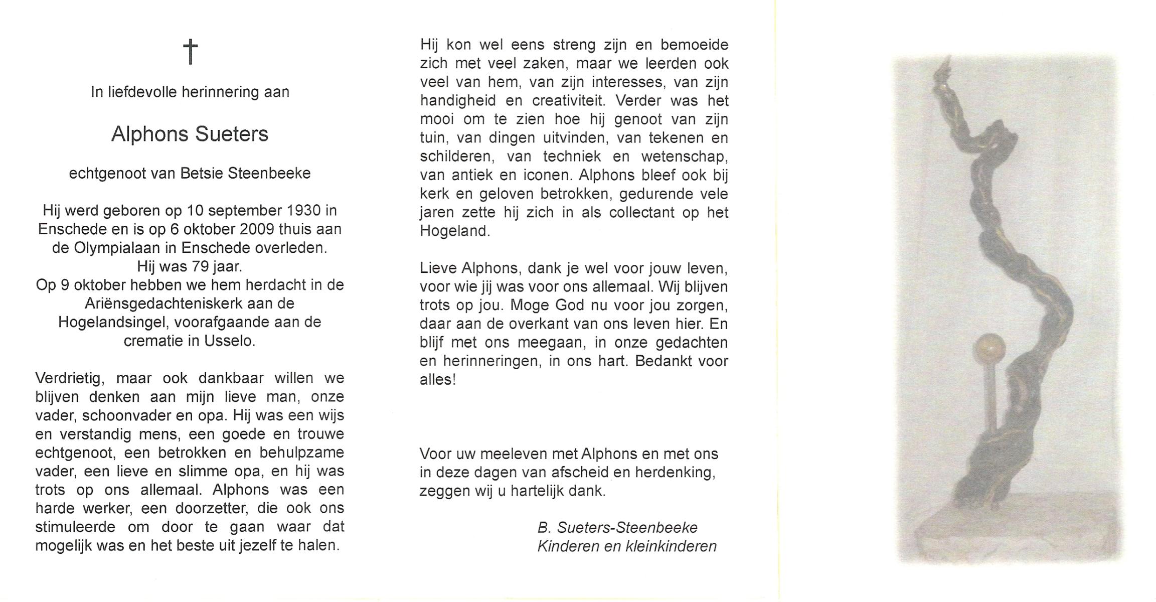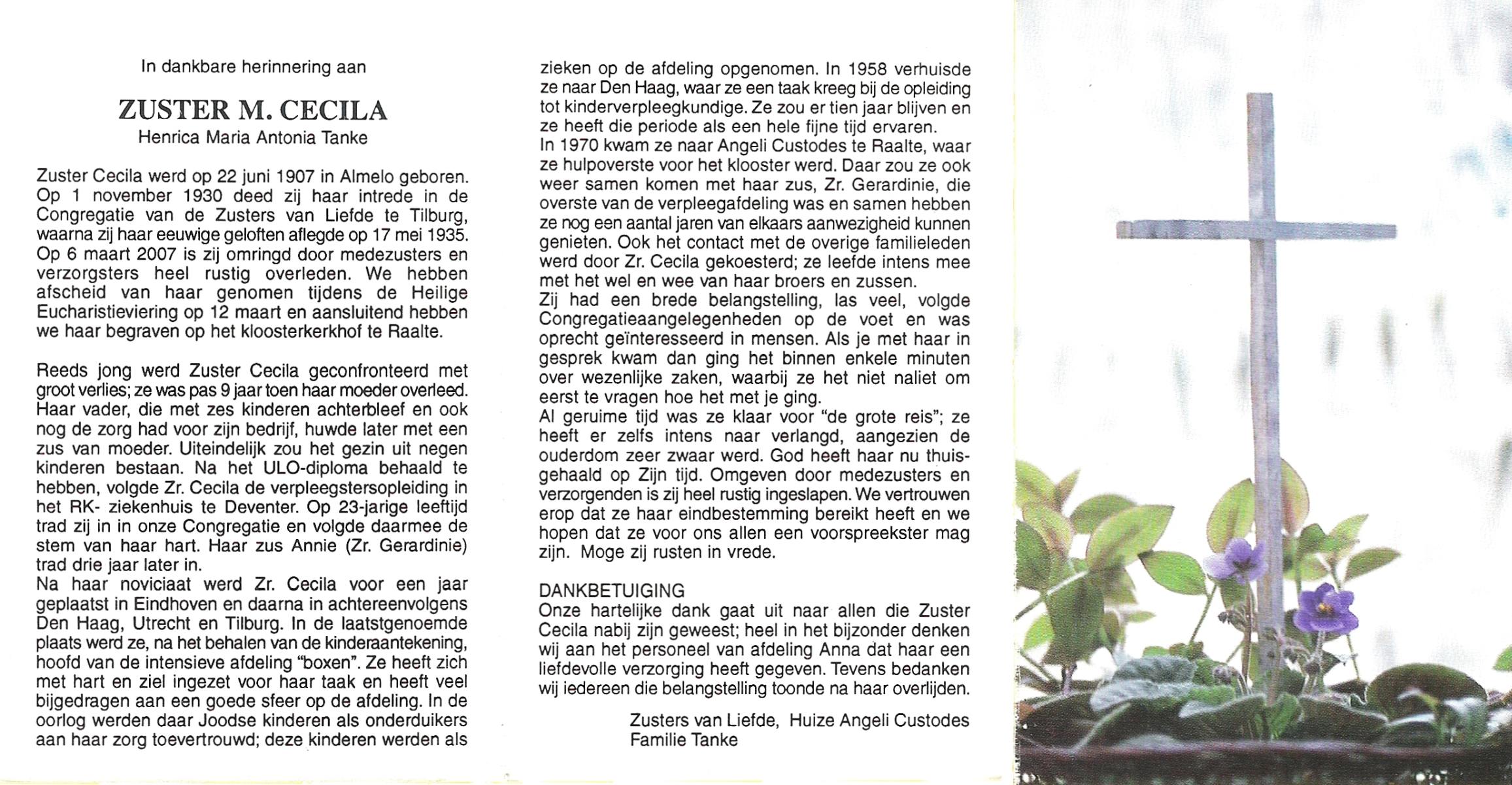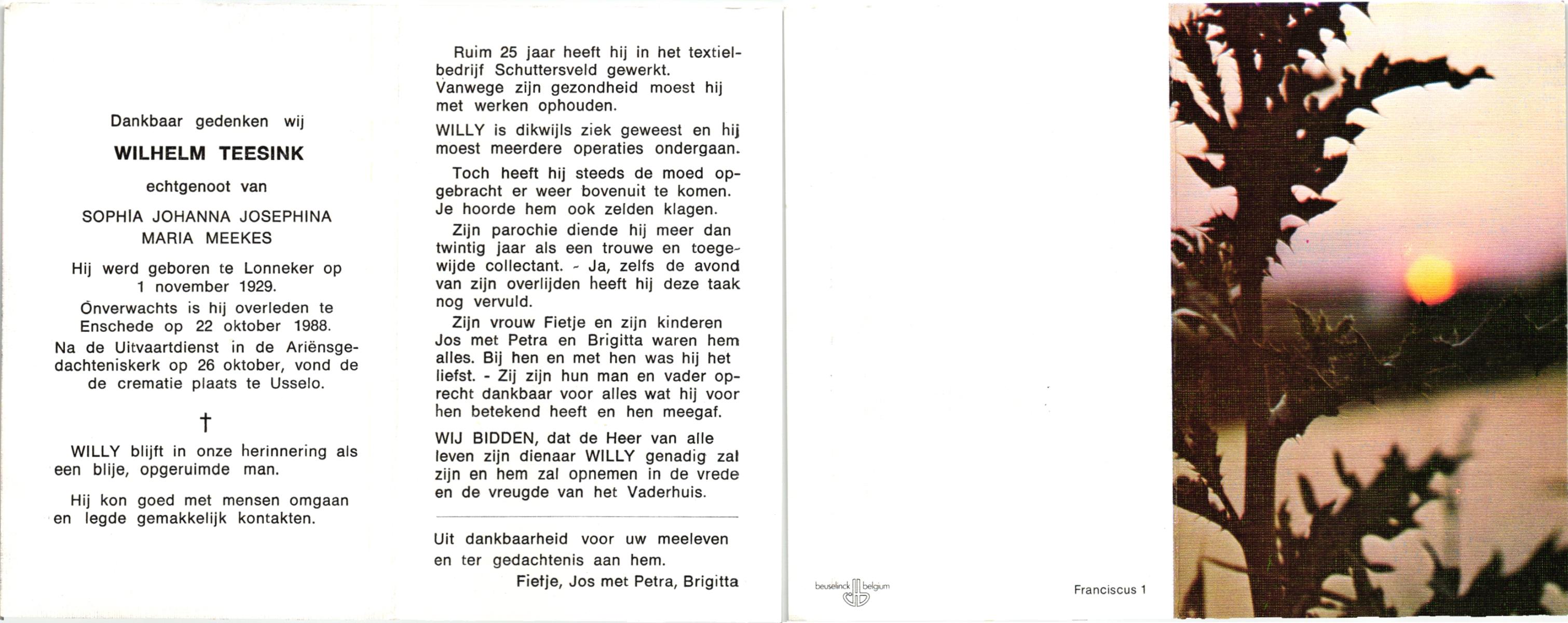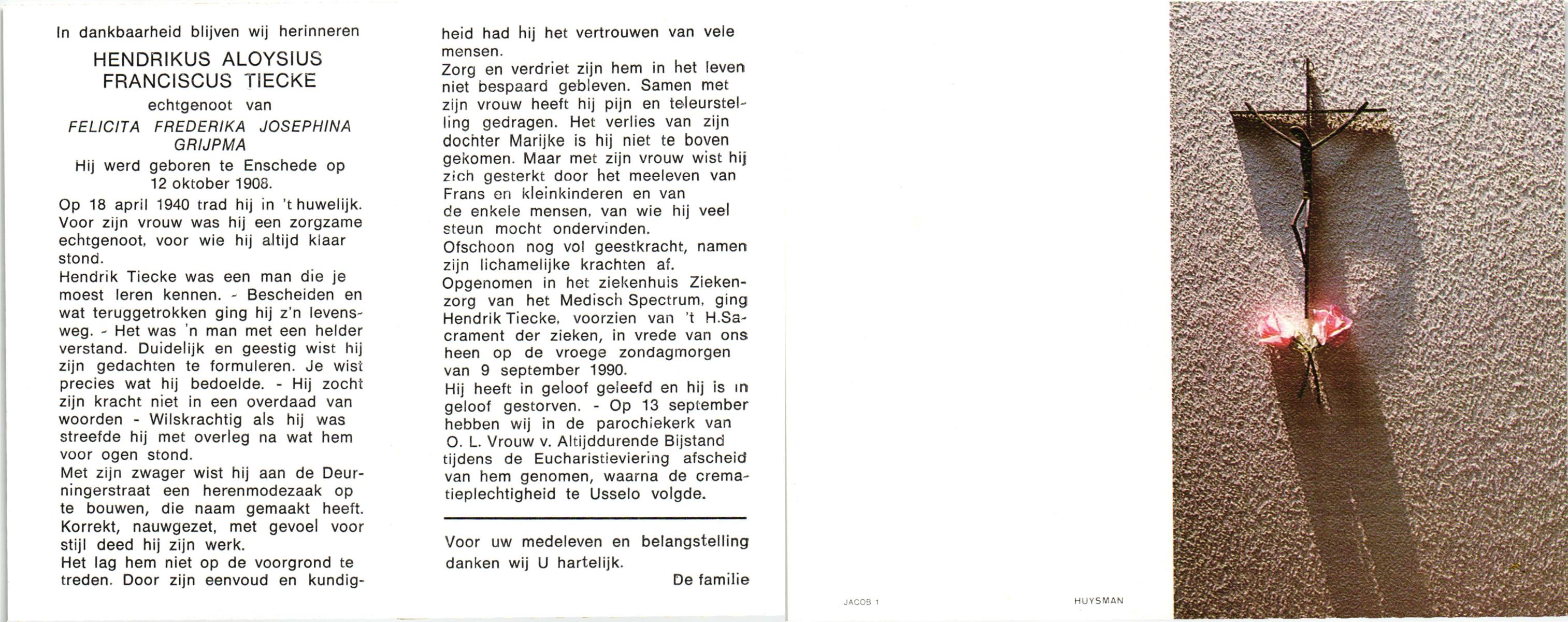 TIECKE, Hendrikus Aloysius Franciscus, geboren op 12-10-1908 te Enschede, overleden op 9-9-1990 te Enschede, ziekenhuis op 81-jarige leeftijd, gecremeerd op 13-9-1990 te Usselo.