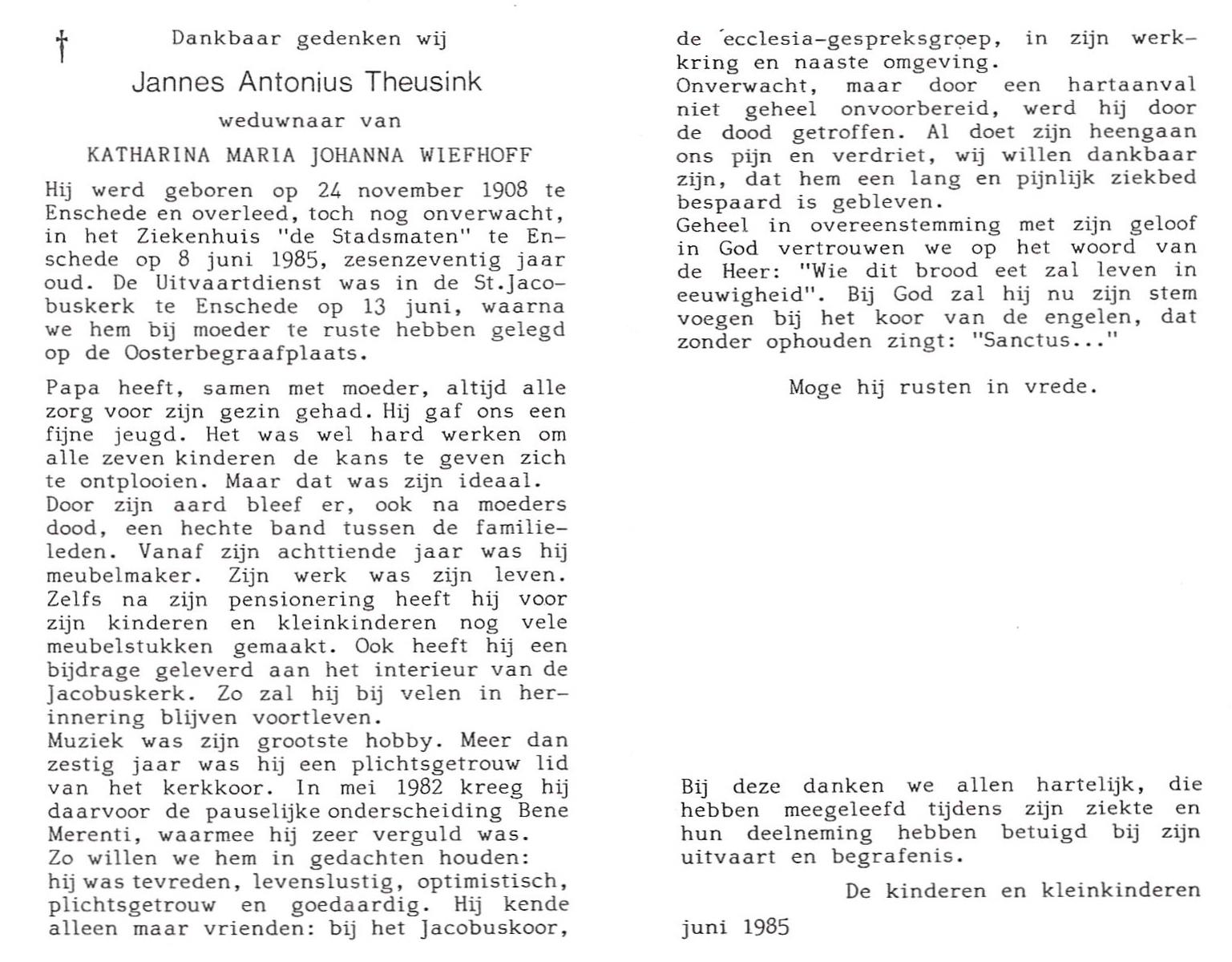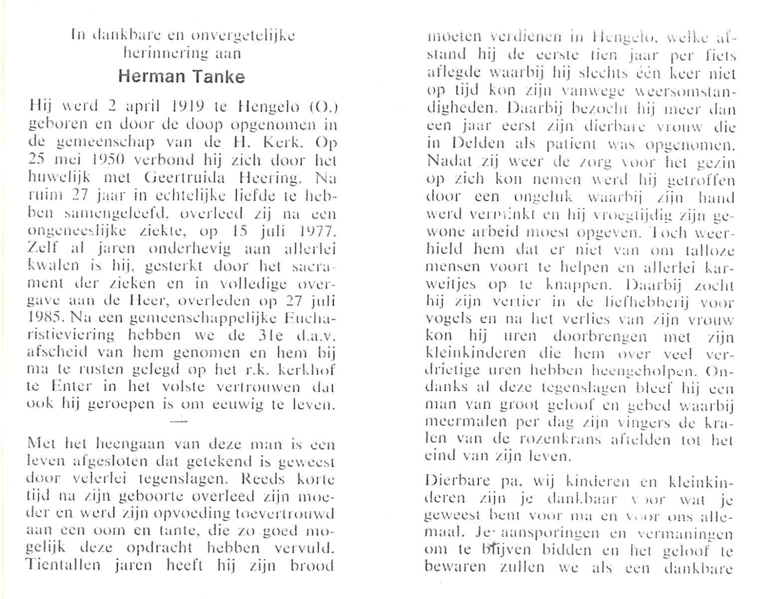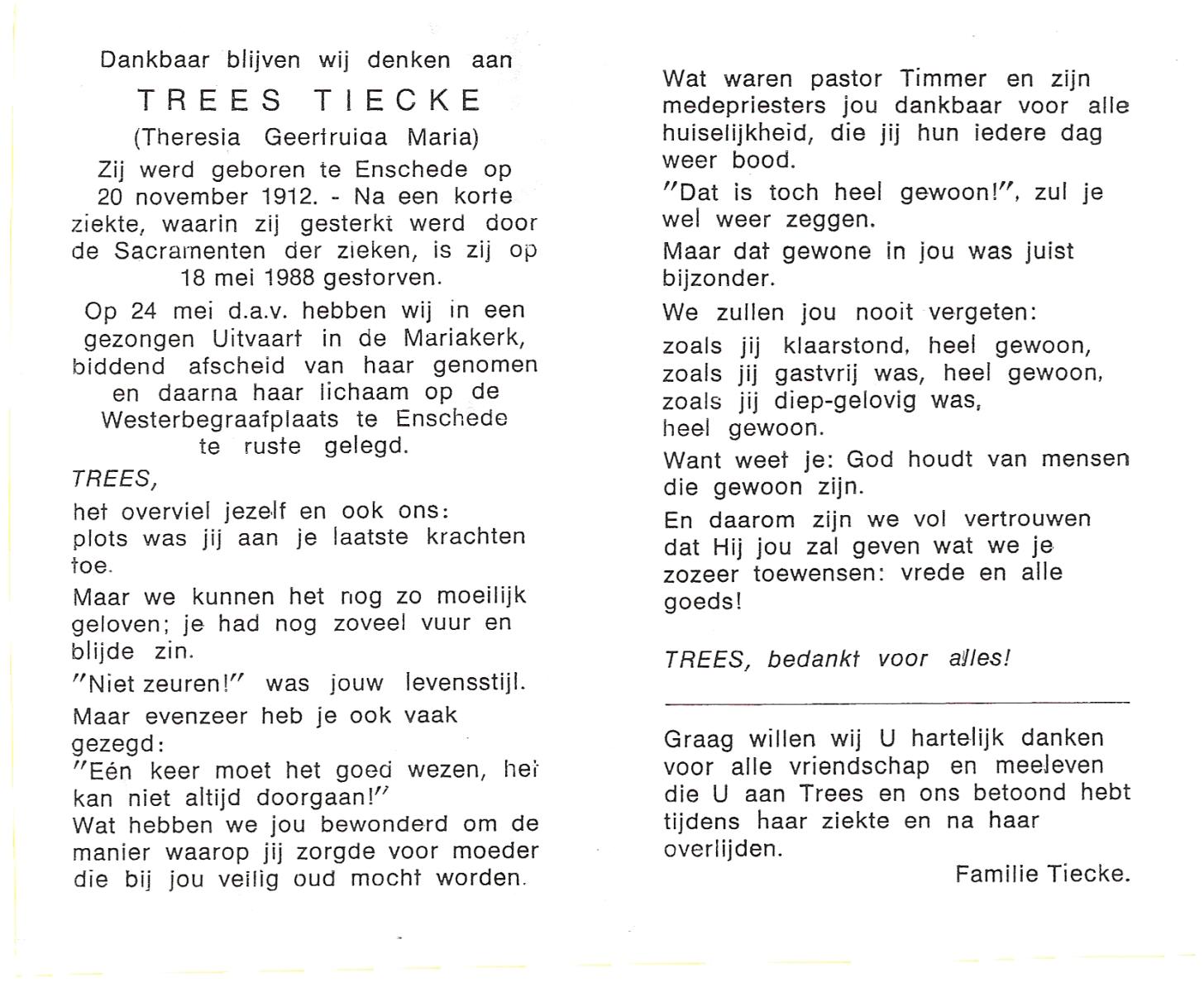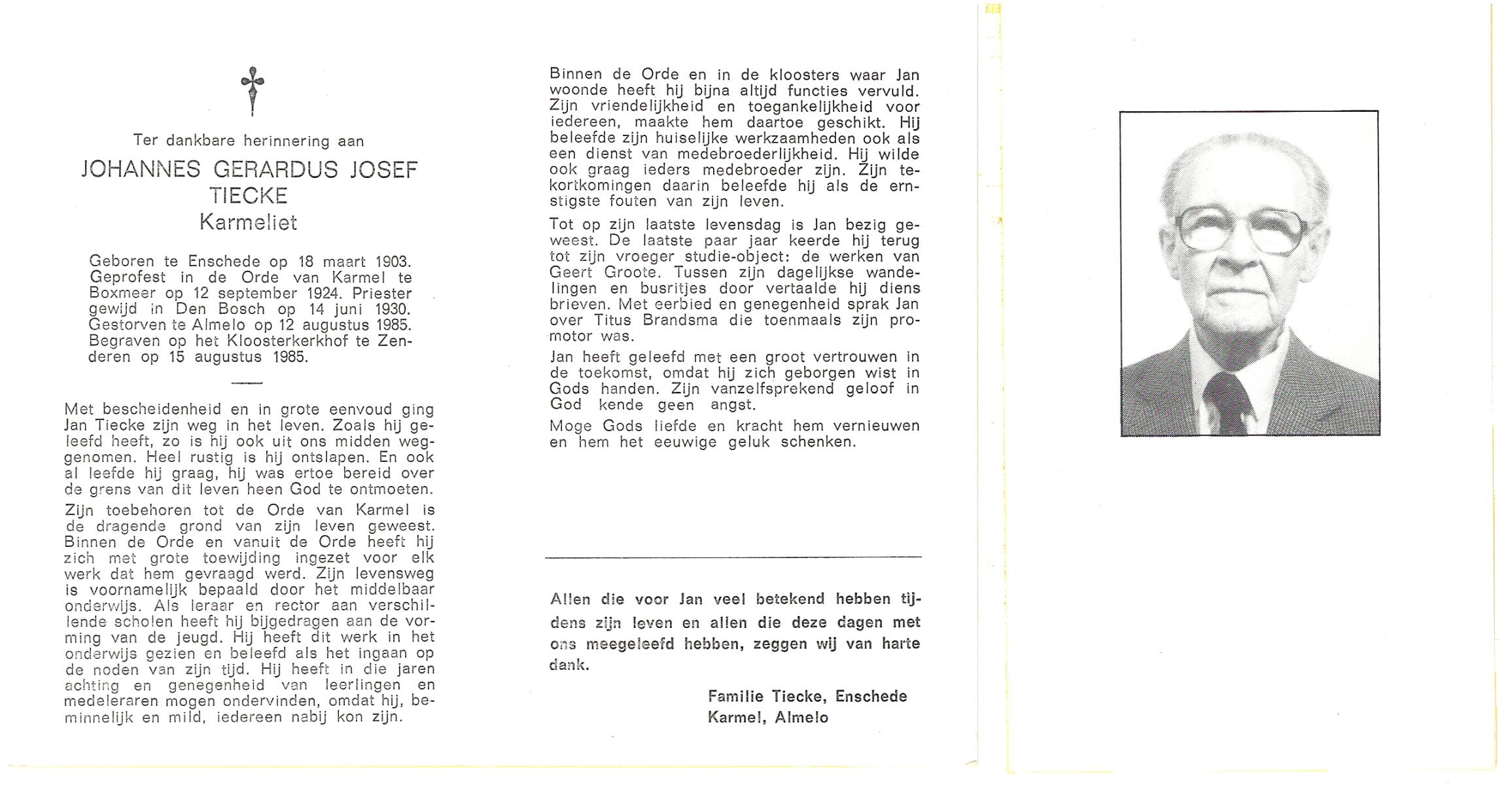 TIECKE, Johannes Gerardus Josef, geboren op 18-3-1903 te Enschede, overleden op 12-8-1985 te Almelo op 82-jarige leeftijd, begraven op 15-8-1985 te Zenderen.