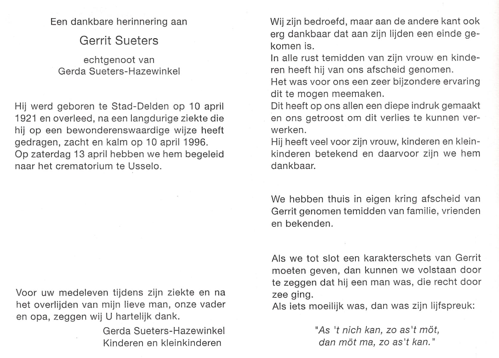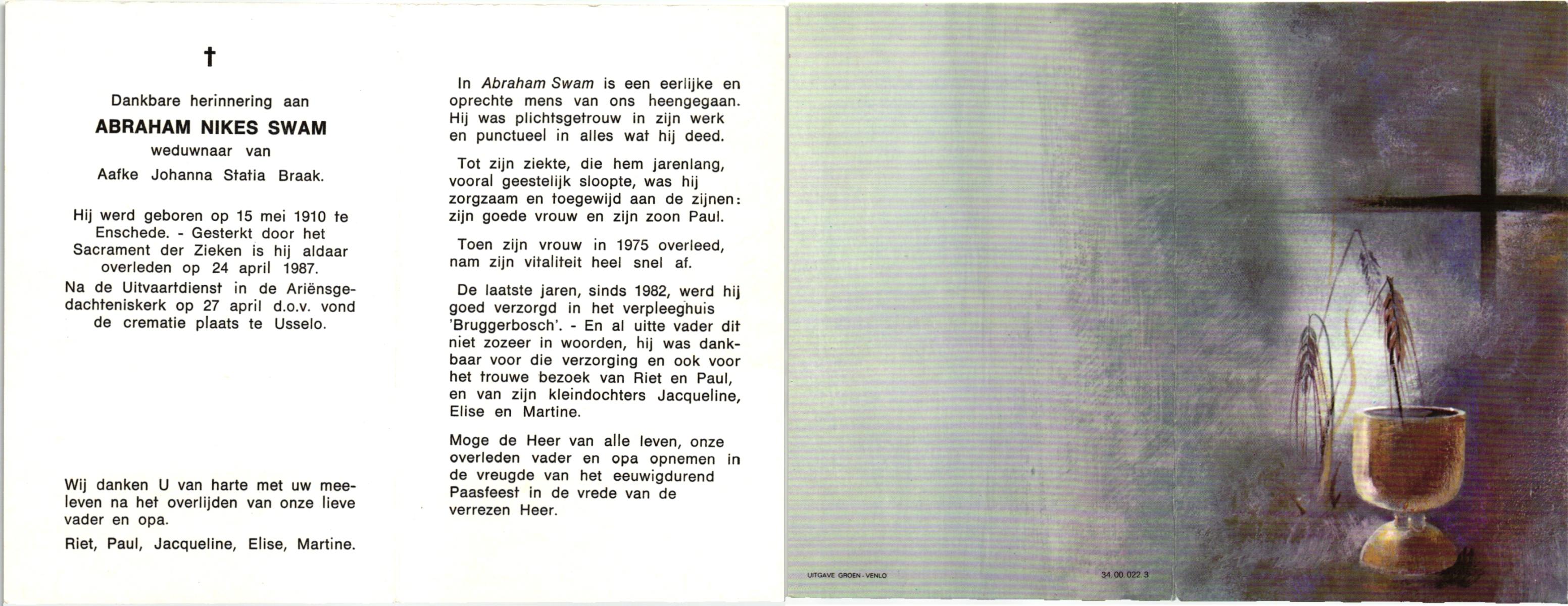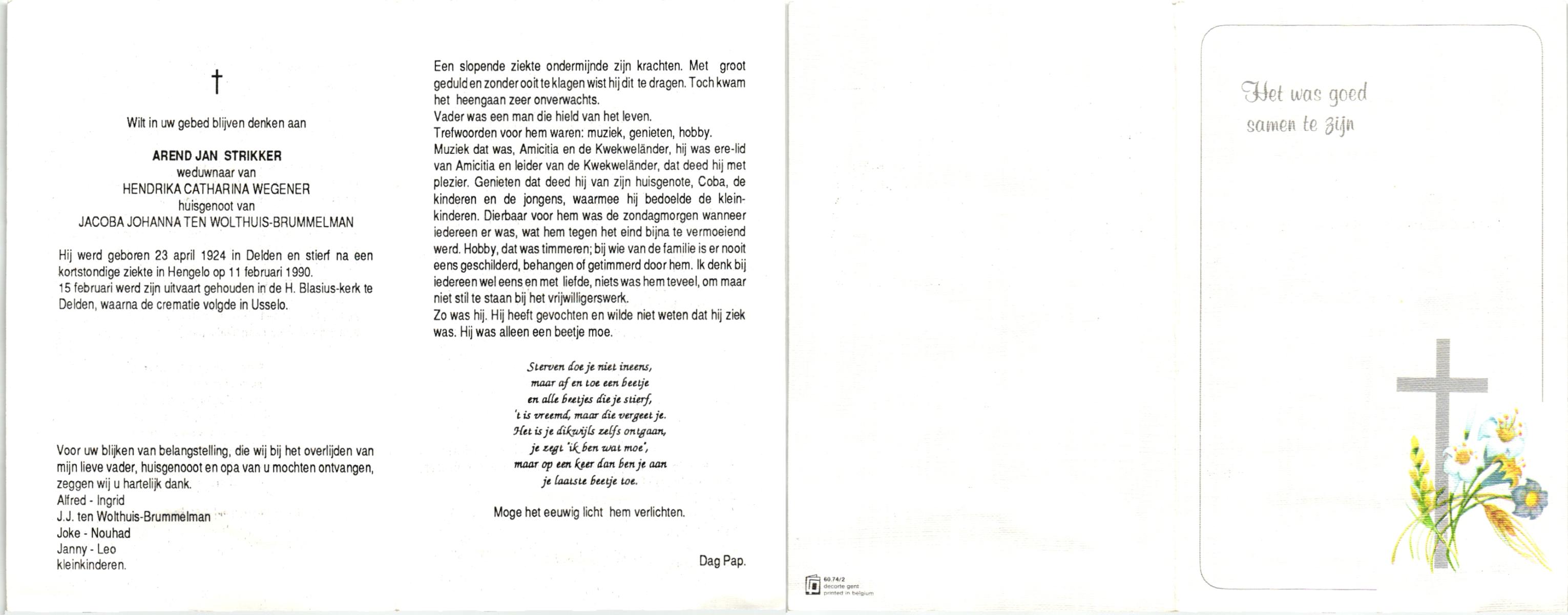 STRIKKER, , Arend Jan, geboren op 23-4-1924 te Delden, overleden op 11-2-1990 te Hengelo (O) op 65-jarige leeftijd, gecremeerd op 15-2-1990 te Usselo.