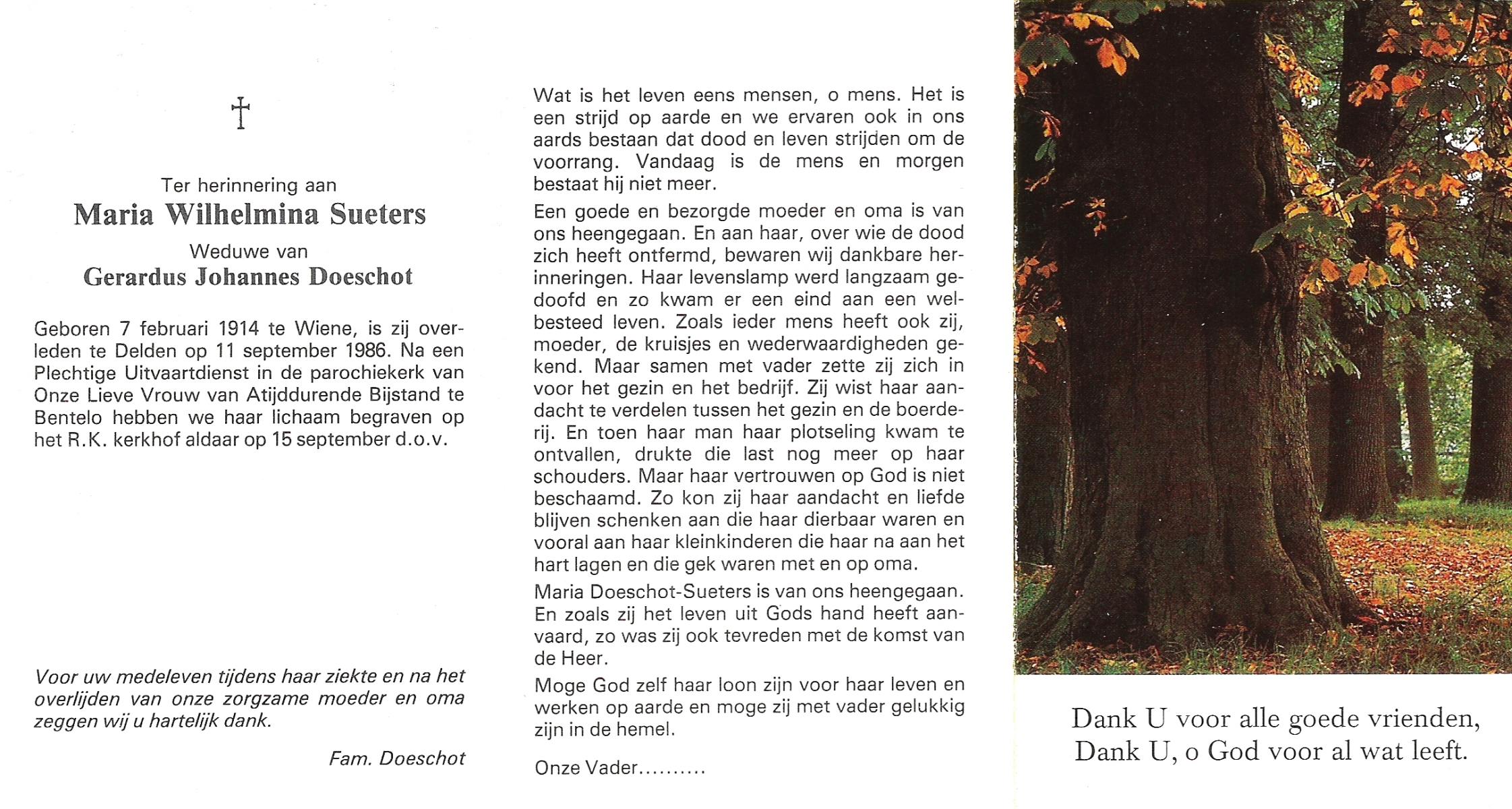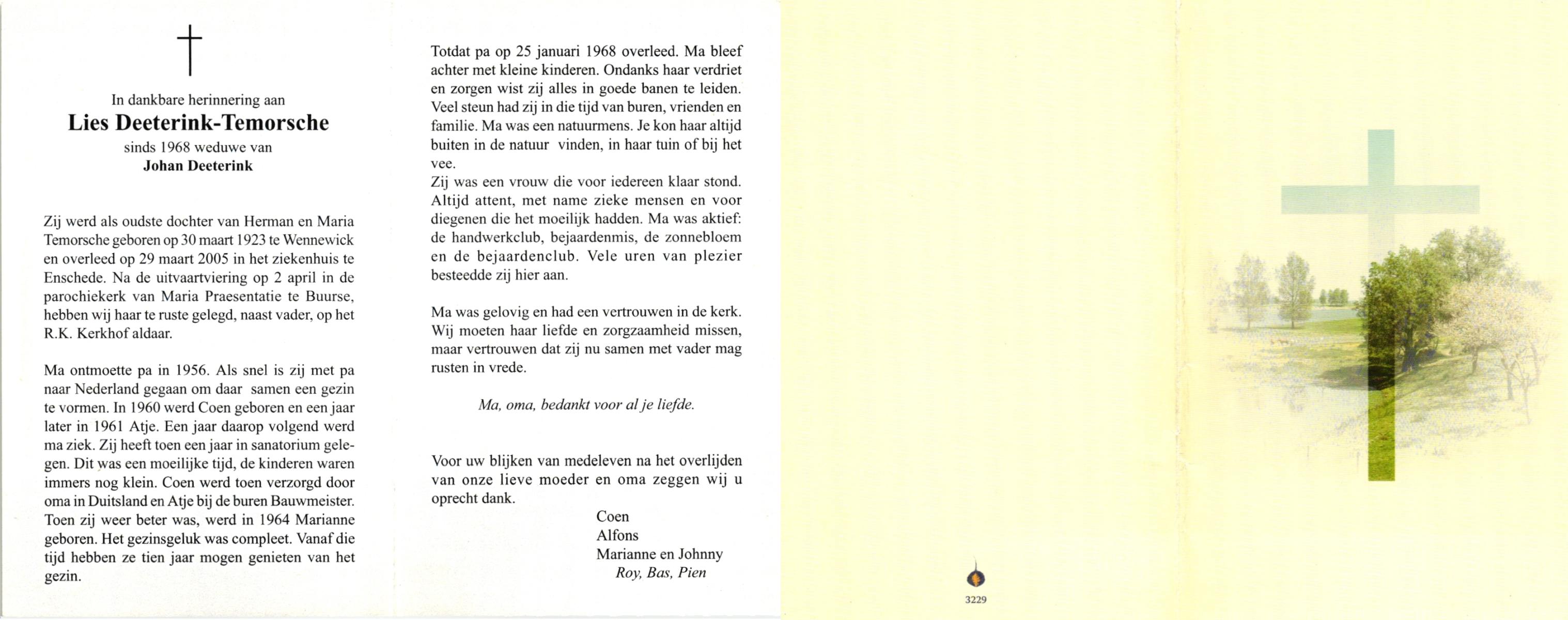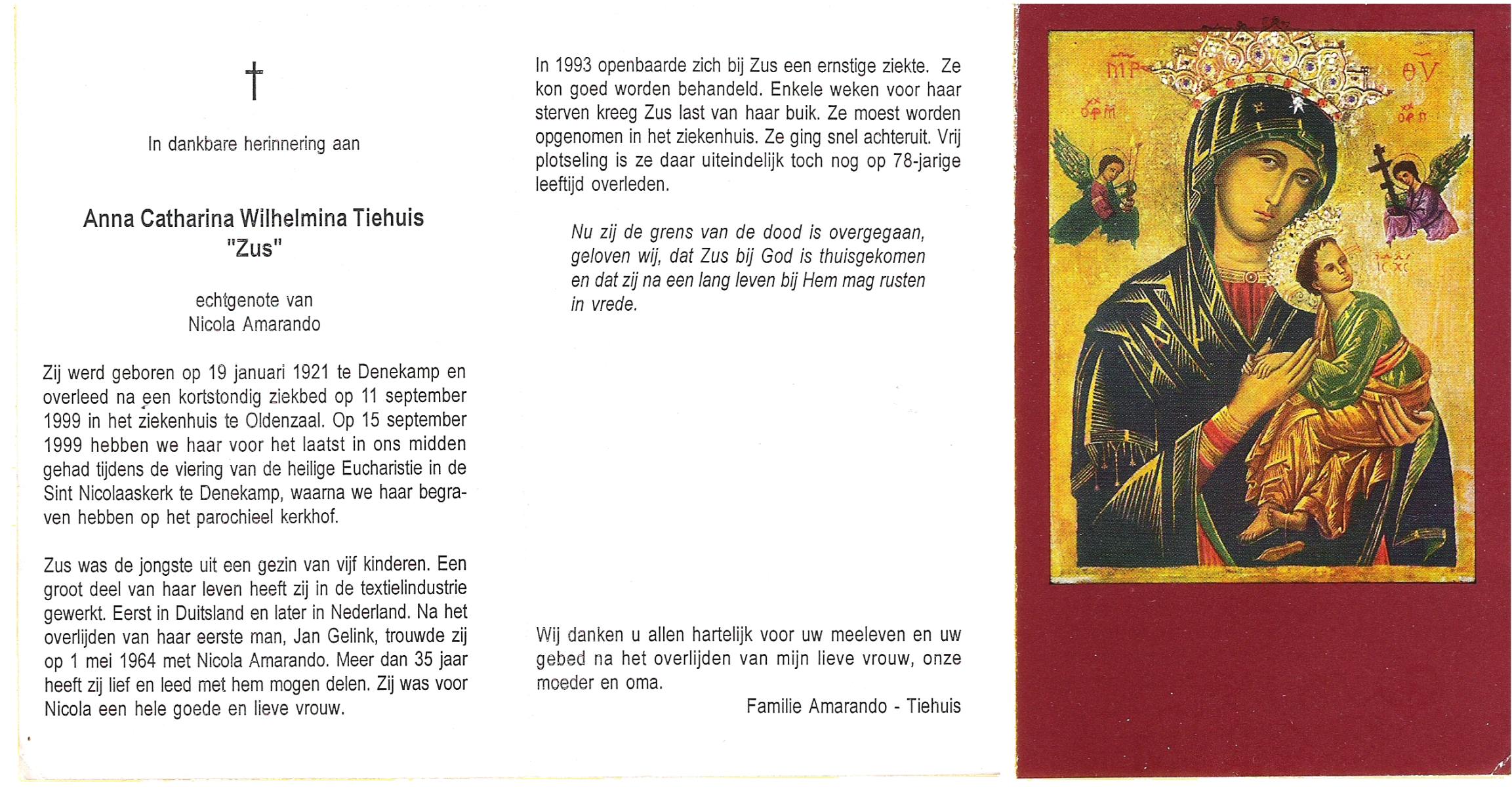 TIEHUIS, Anna Catharina Wilhelmina (Zus), geboren op 19-1-1921 te Denekamp, overleden op 11-9-1999 te Oldenzaal op 78-jarige leeftijd, begraven op 15-9-1999 te Denekamp.