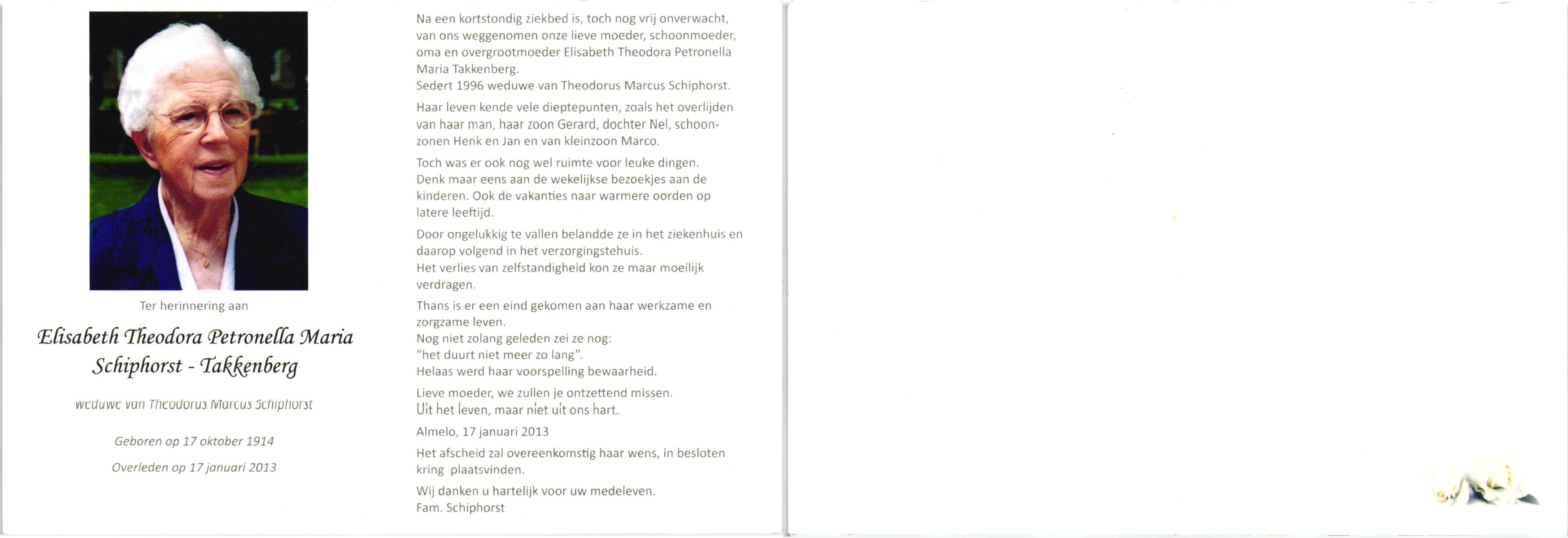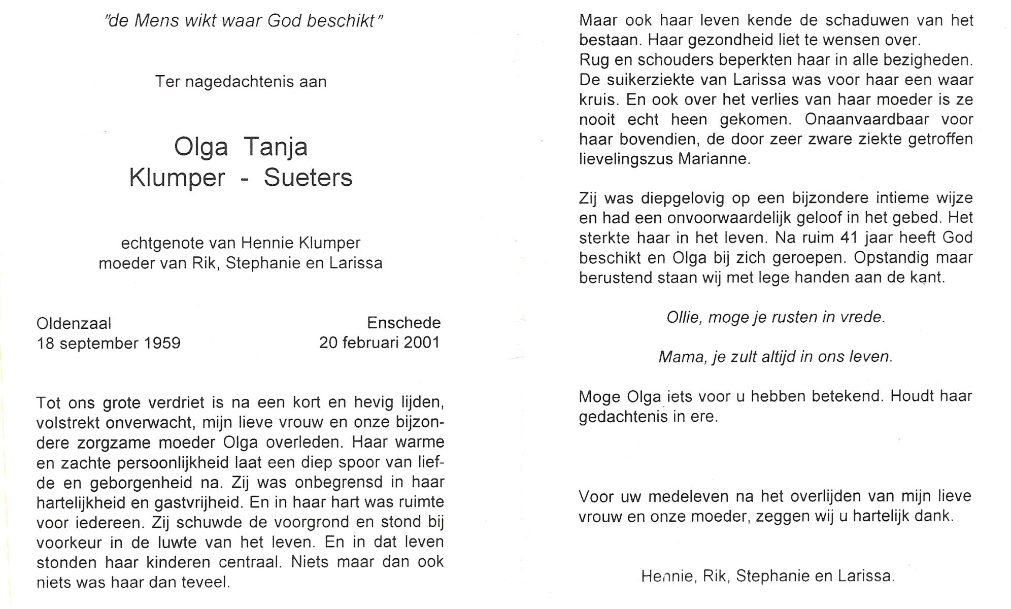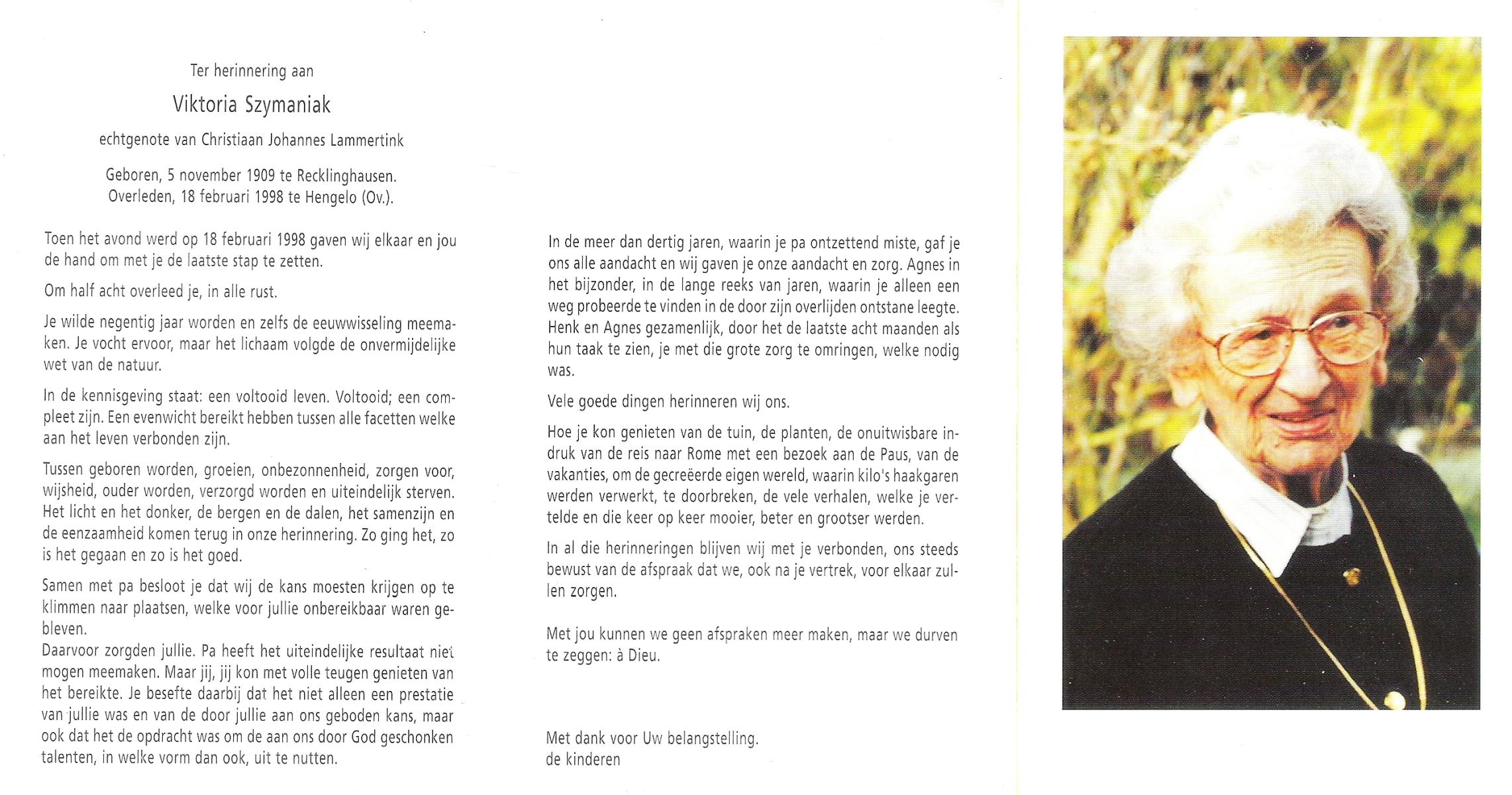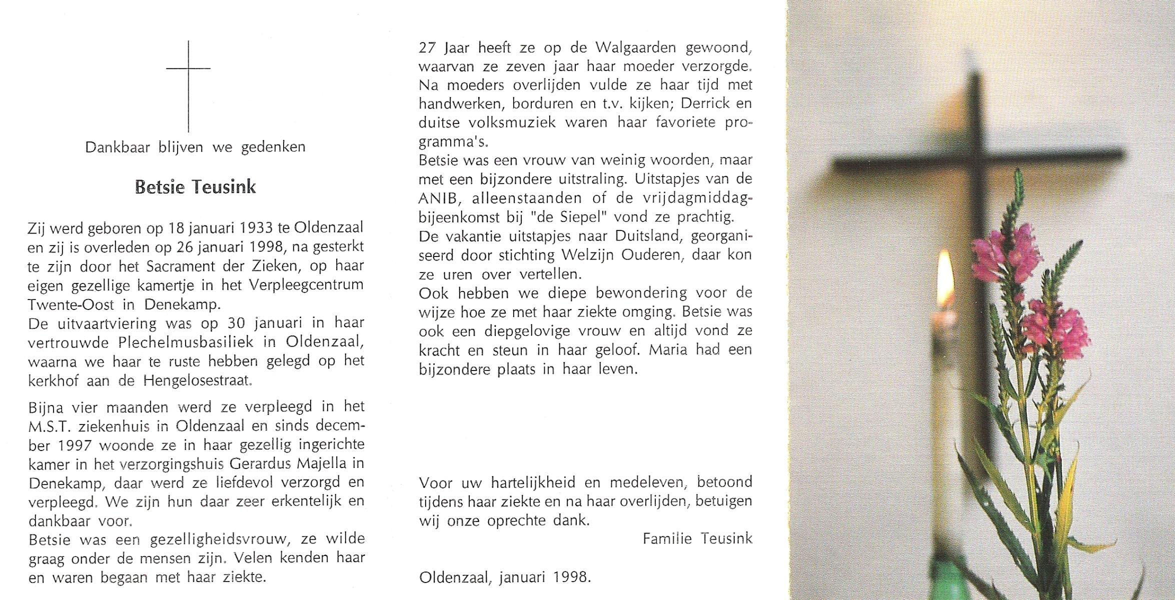 TIEHUIS, Anna Catharina Wilhelmina (Zus), geboren op 19-1-1921 te Denekamp, overleden op 11-9-1999 te Oldenzaal op 78-jarige leeftijd, begraven op 15-9-1999 te Denekamp.