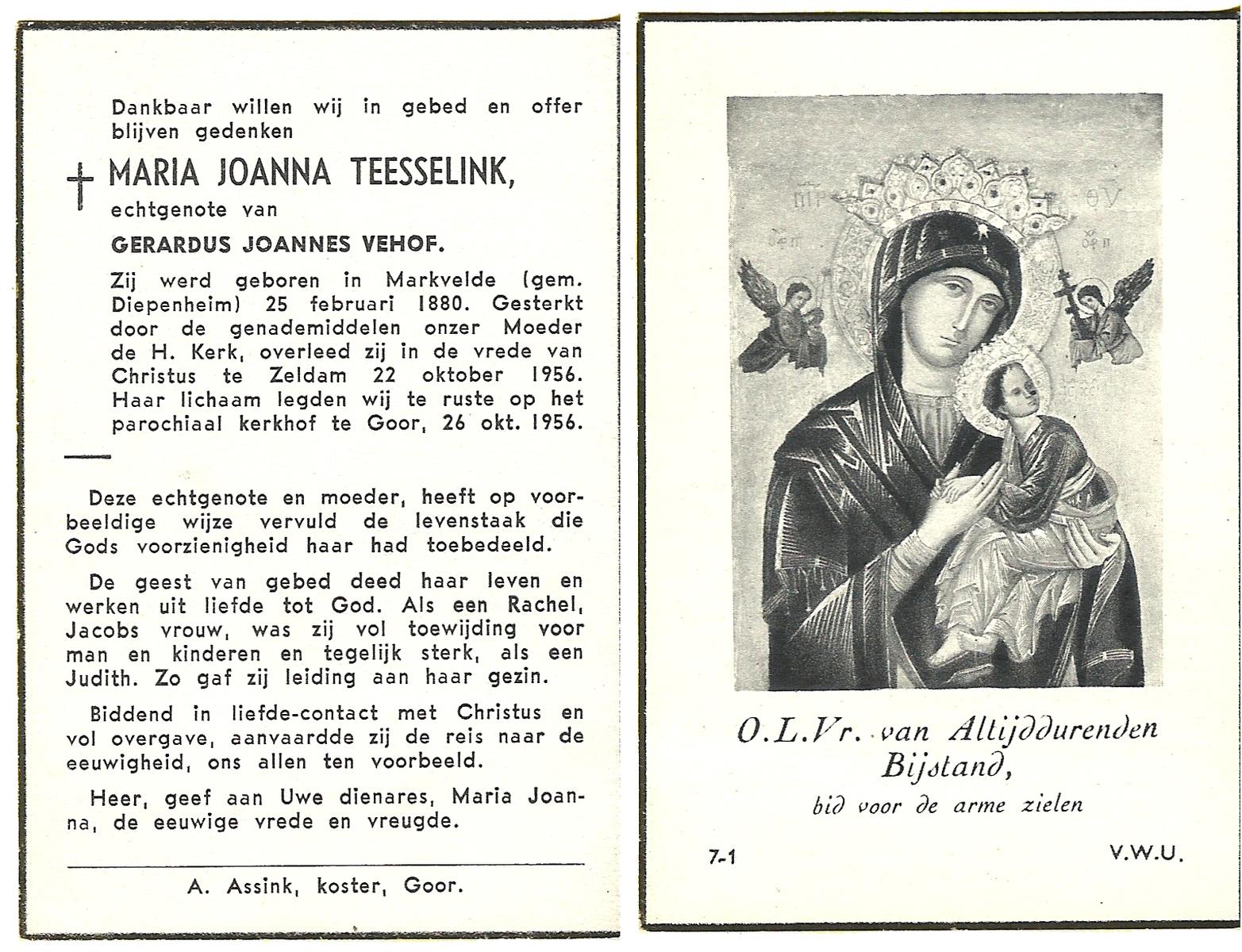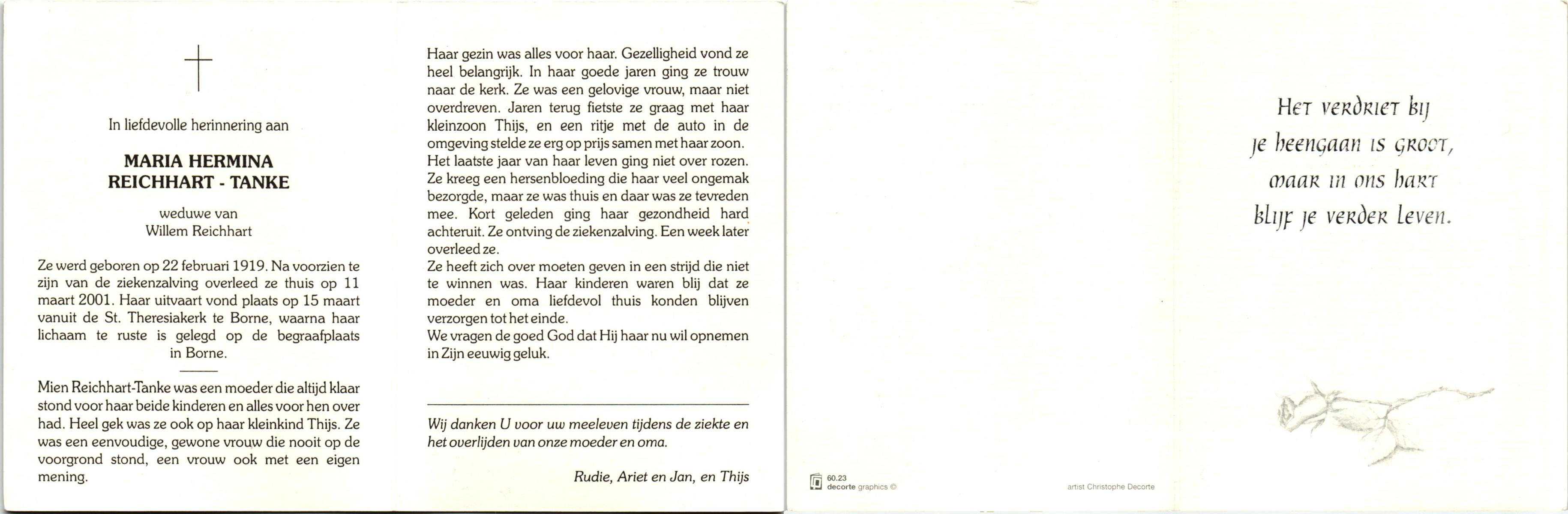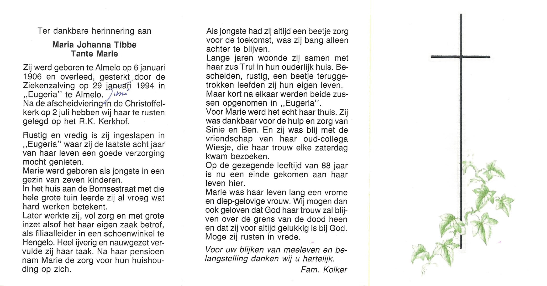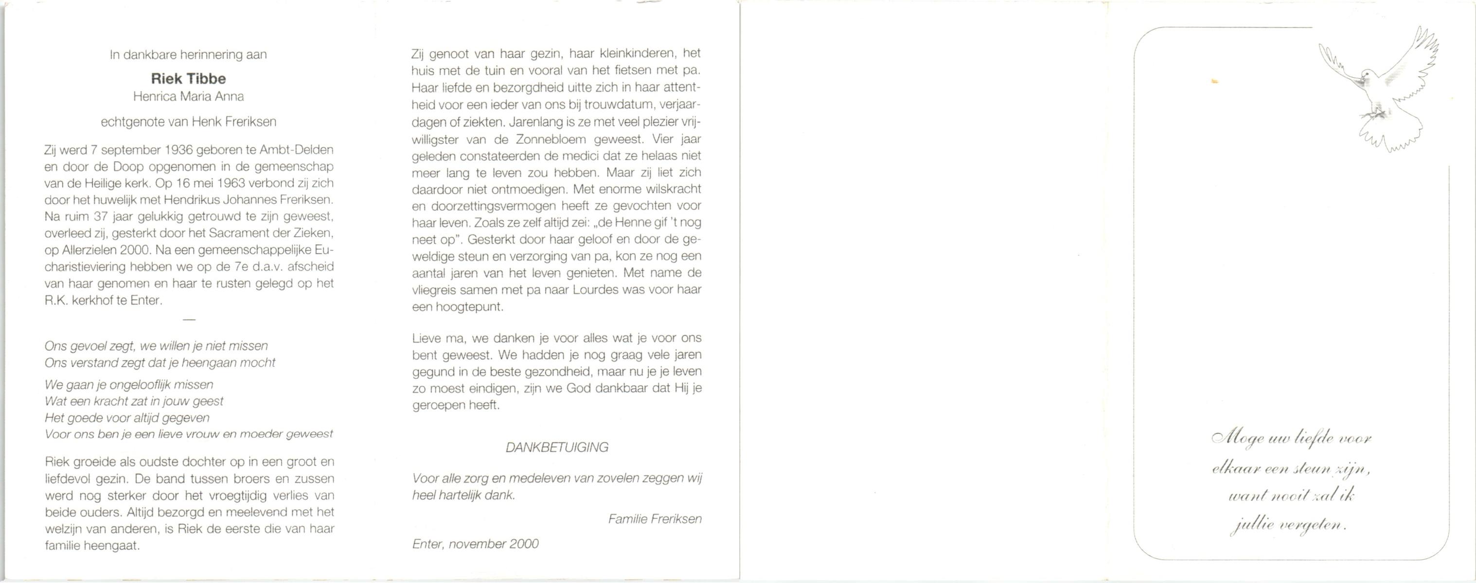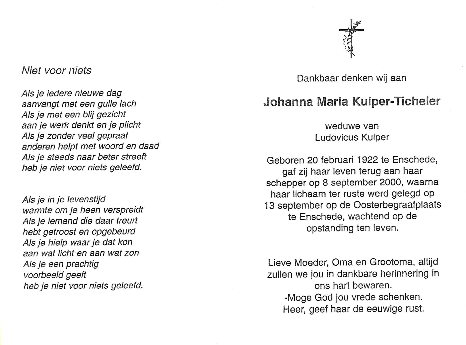TICHELER, Johanna Maria, geboren op 20-2-1922 te Enschede, overleden op 8-9-2000 op 78-jarige leeftijd, begraven op 13-9-2000 te Enschede.