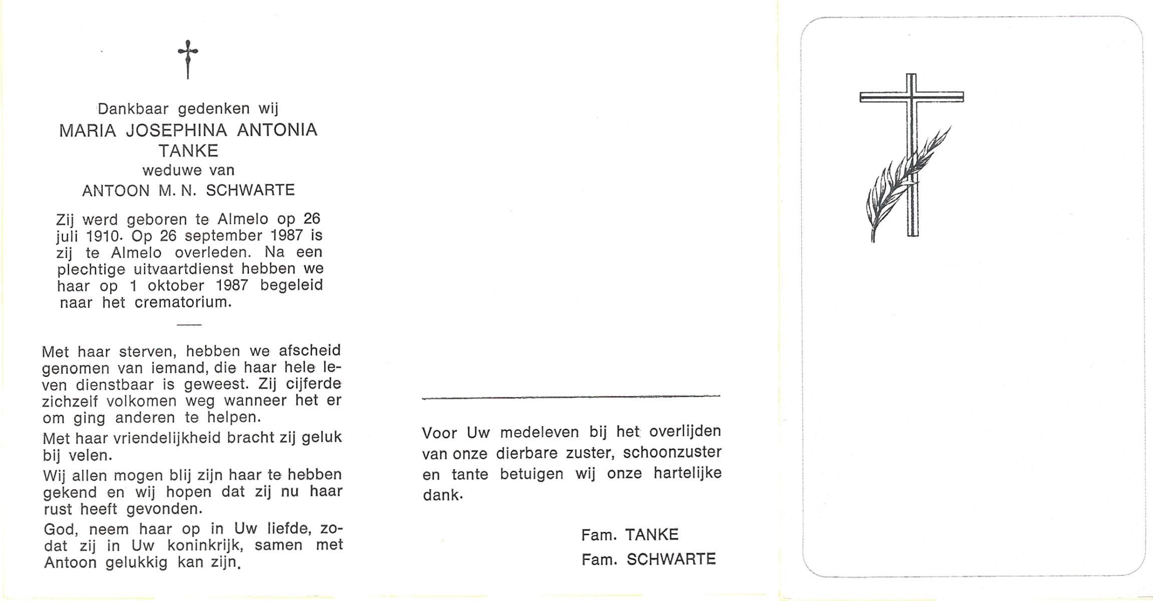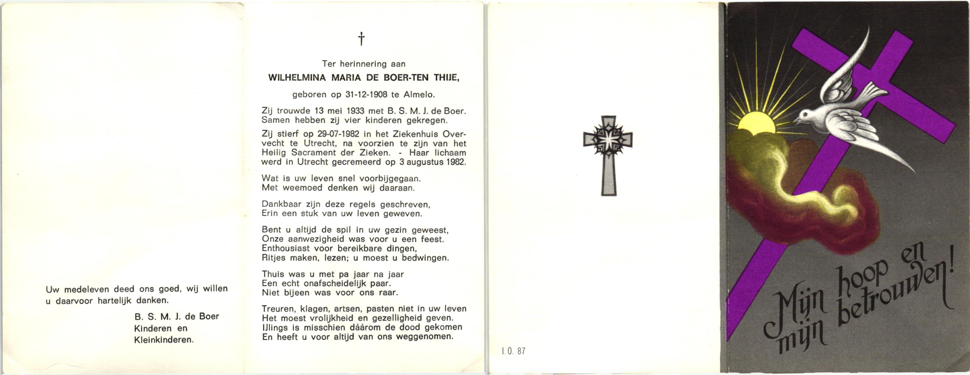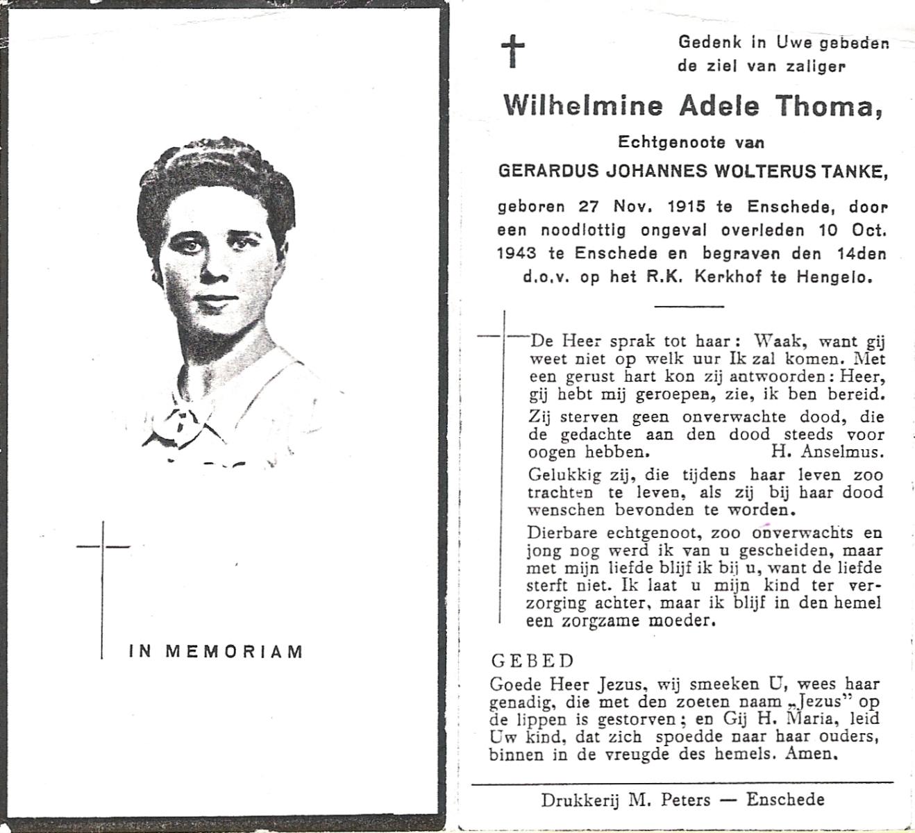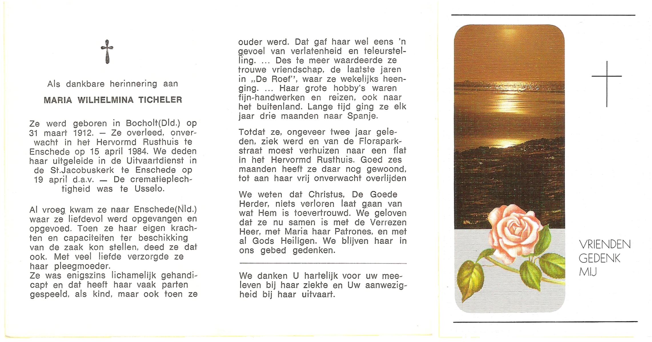 TICHELER, Maria Wilhelmina, geboren op 31-3-1912 te Bocholt (Dld), overleden op 15-4-1984 te Enschede op 72-jarige leeftijd, gecremeerd op 19-4-1984 te Usselo.