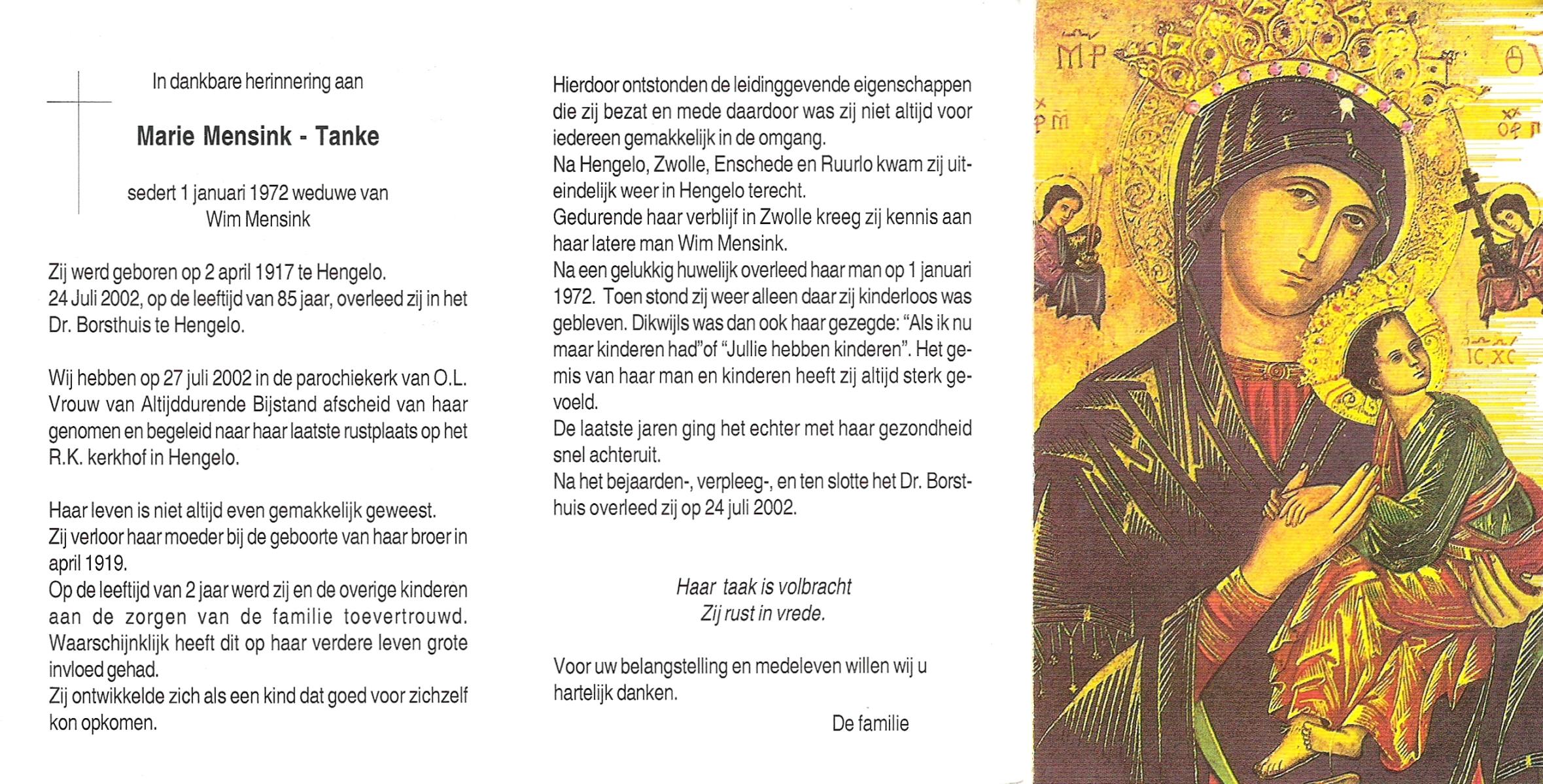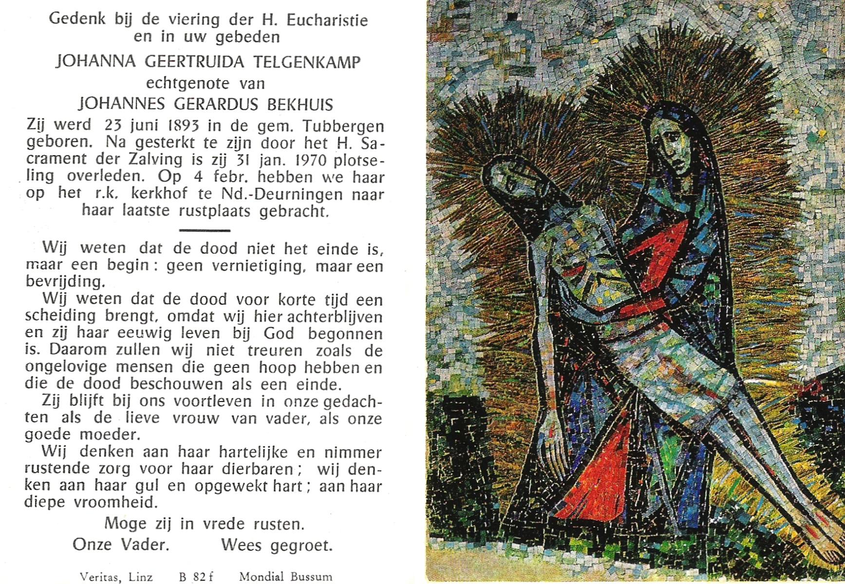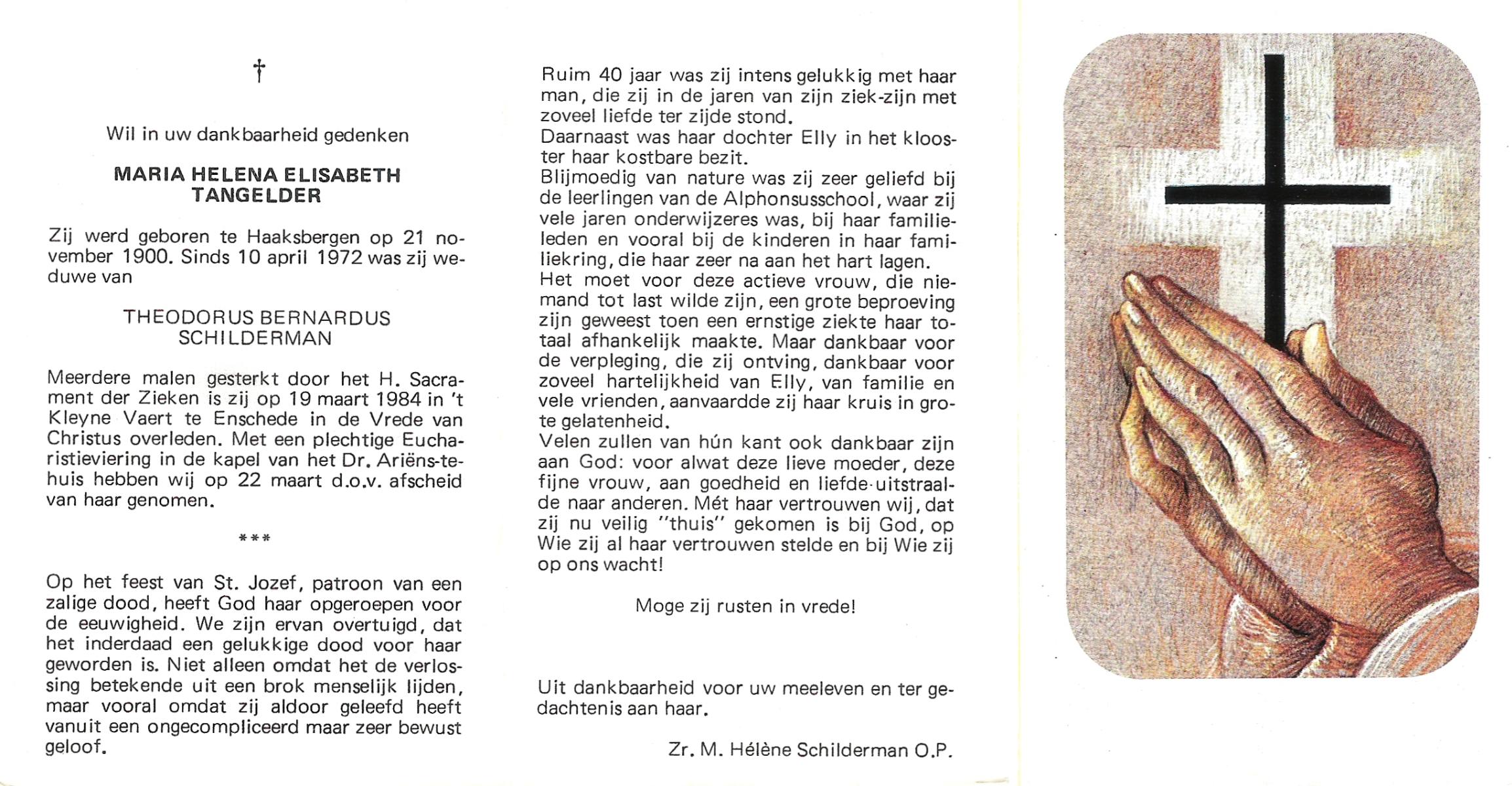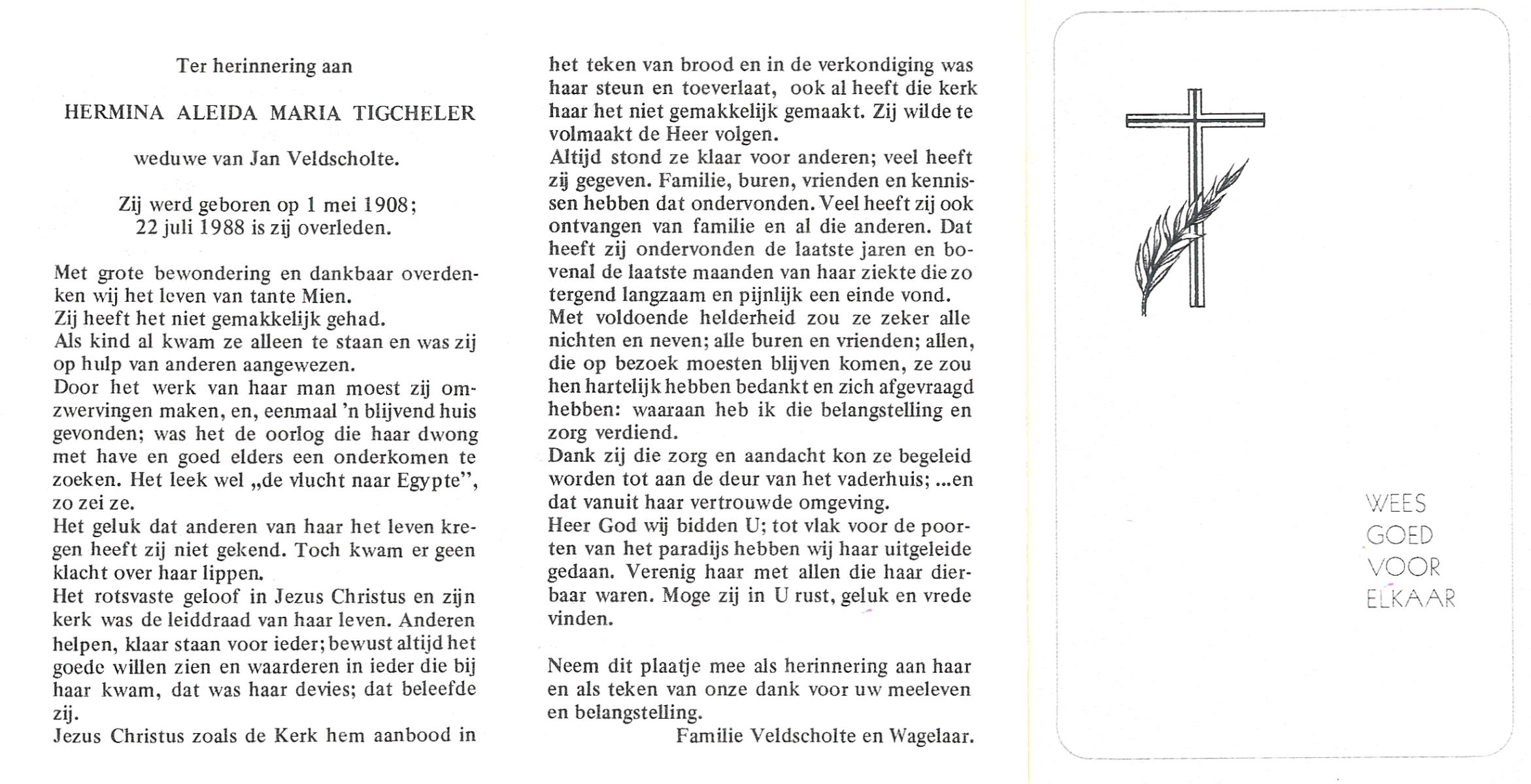 TICHELER, Maria Wilhelmina, geboren op 31-3-1912 te Bocholt (Dld), overleden op 15-4-1984 te Enschede op 72-jarige leeftijd, gecremeerd op 19-4-1984 te Usselo.