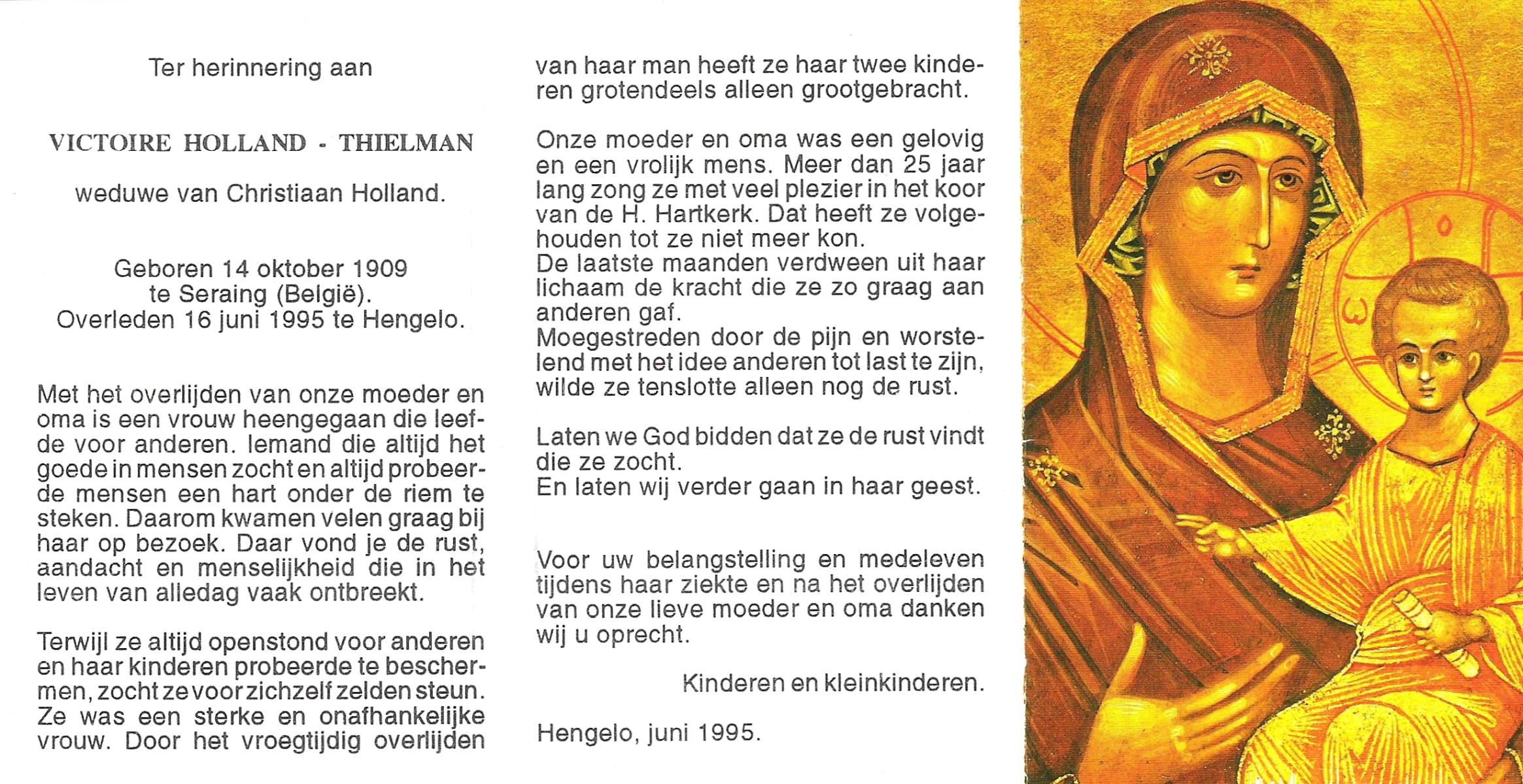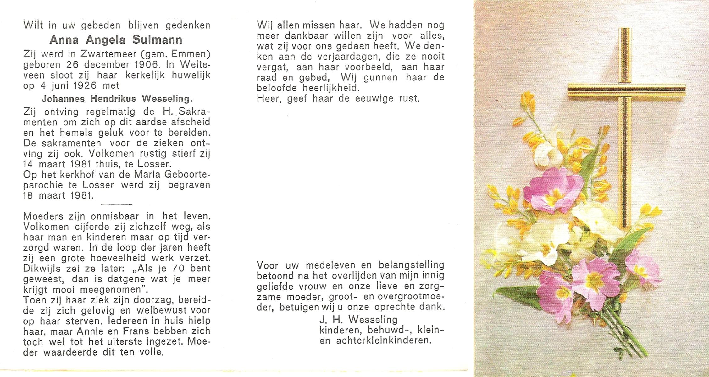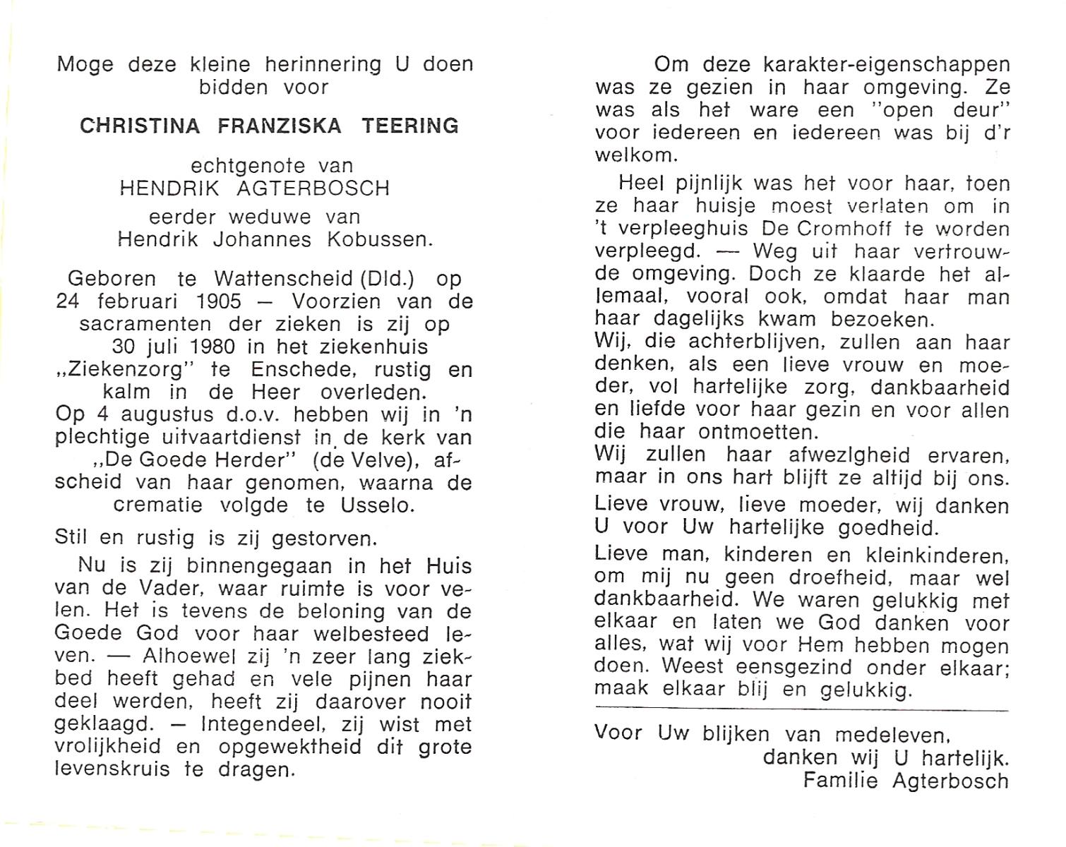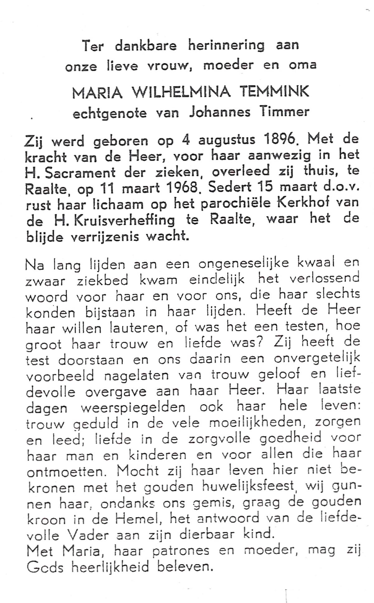 TICHELER, Maria Wilhelmina, geboren op 31-3-1912 te Bocholt (Dld), overleden op 15-4-1984 te Enschede op 72-jarige leeftijd, gecremeerd op 19-4-1984 te Usselo.