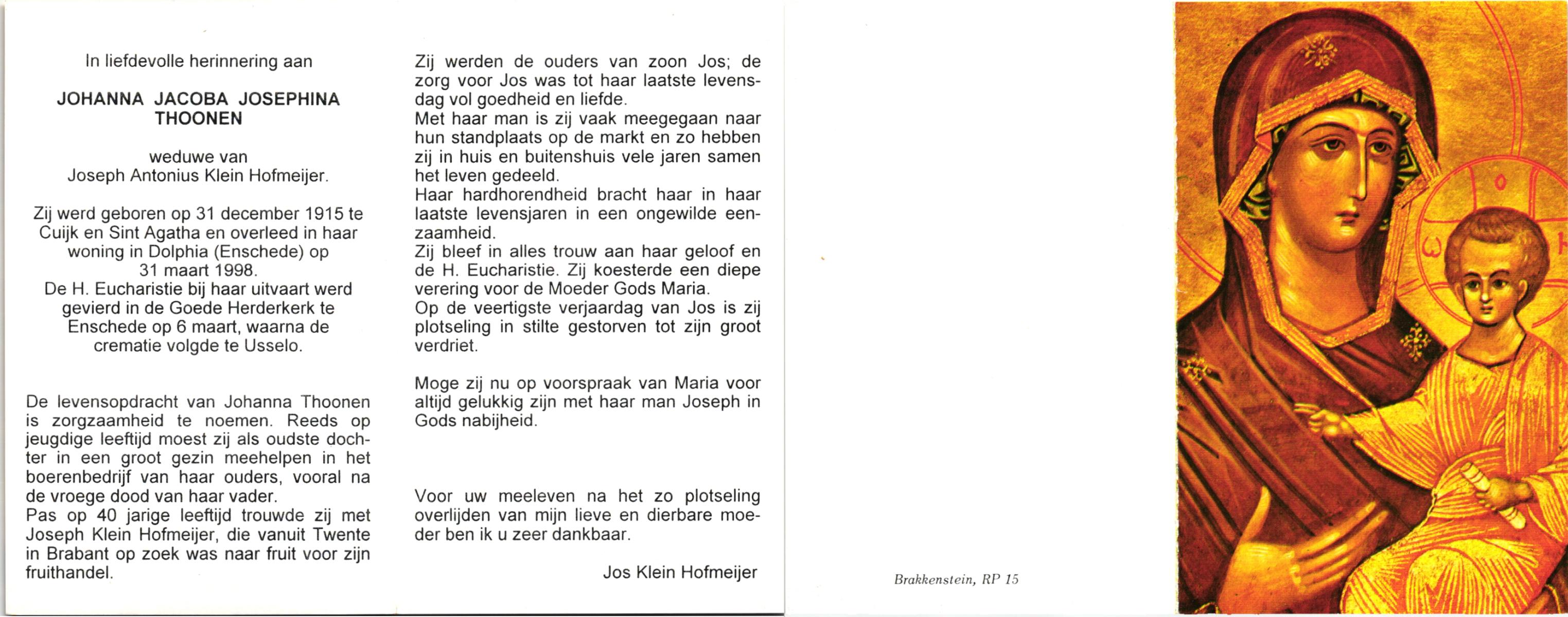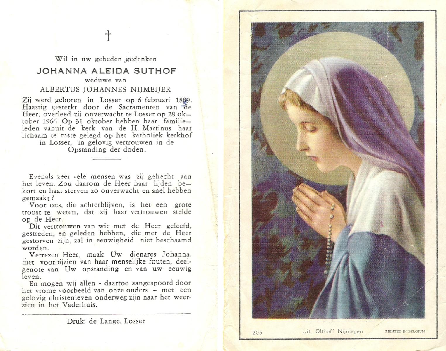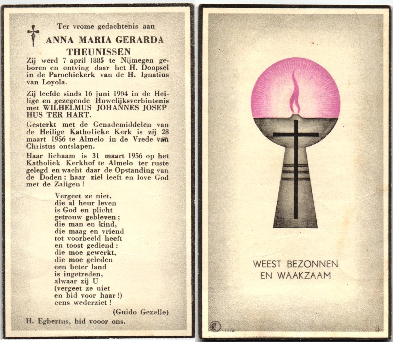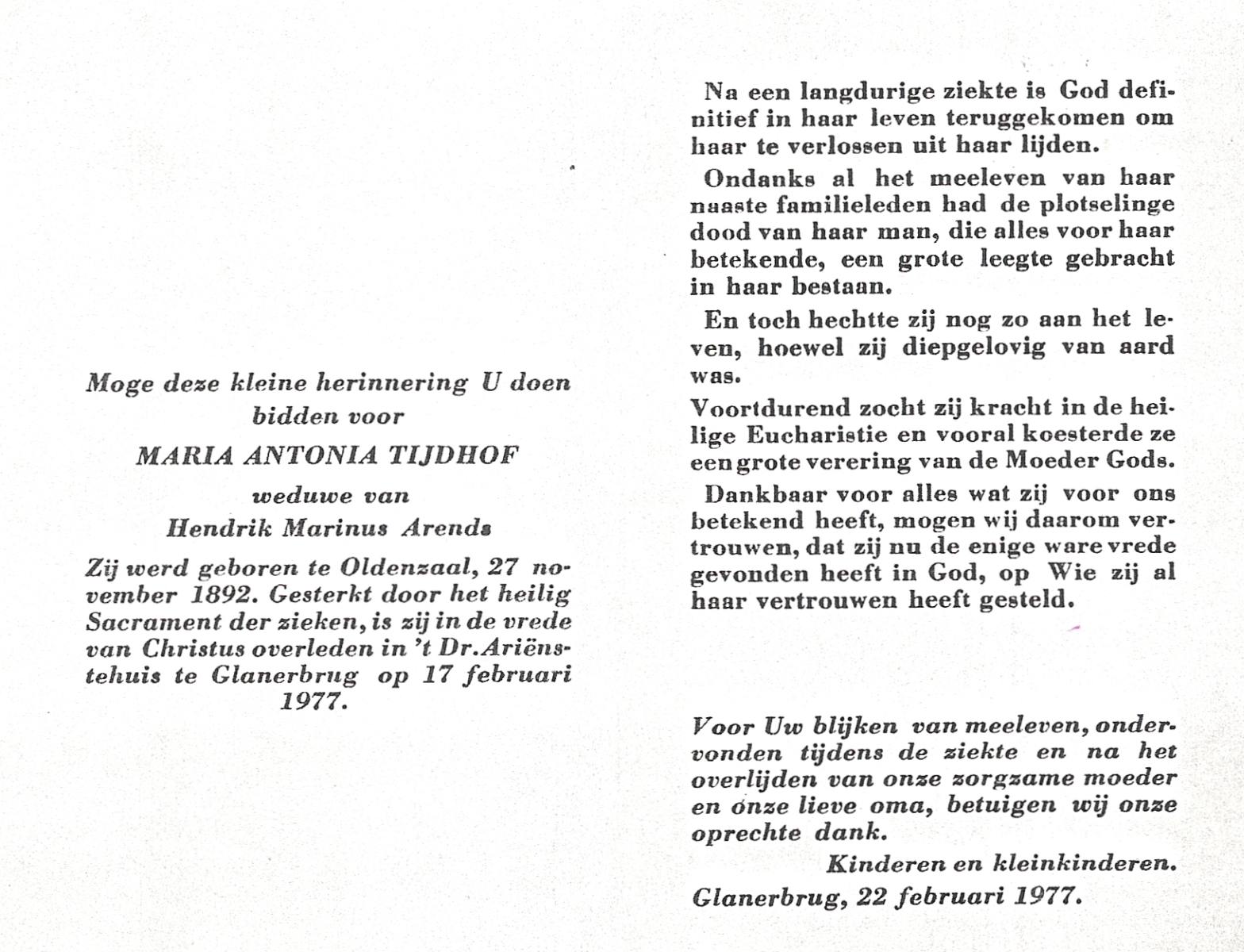 TIJDHOF, Maria Antonia, geboren op 27-11-1892 te Oldenzaal, overleden op 17-2-1977 te Glanerbrug op 84-jarige leeftijd.