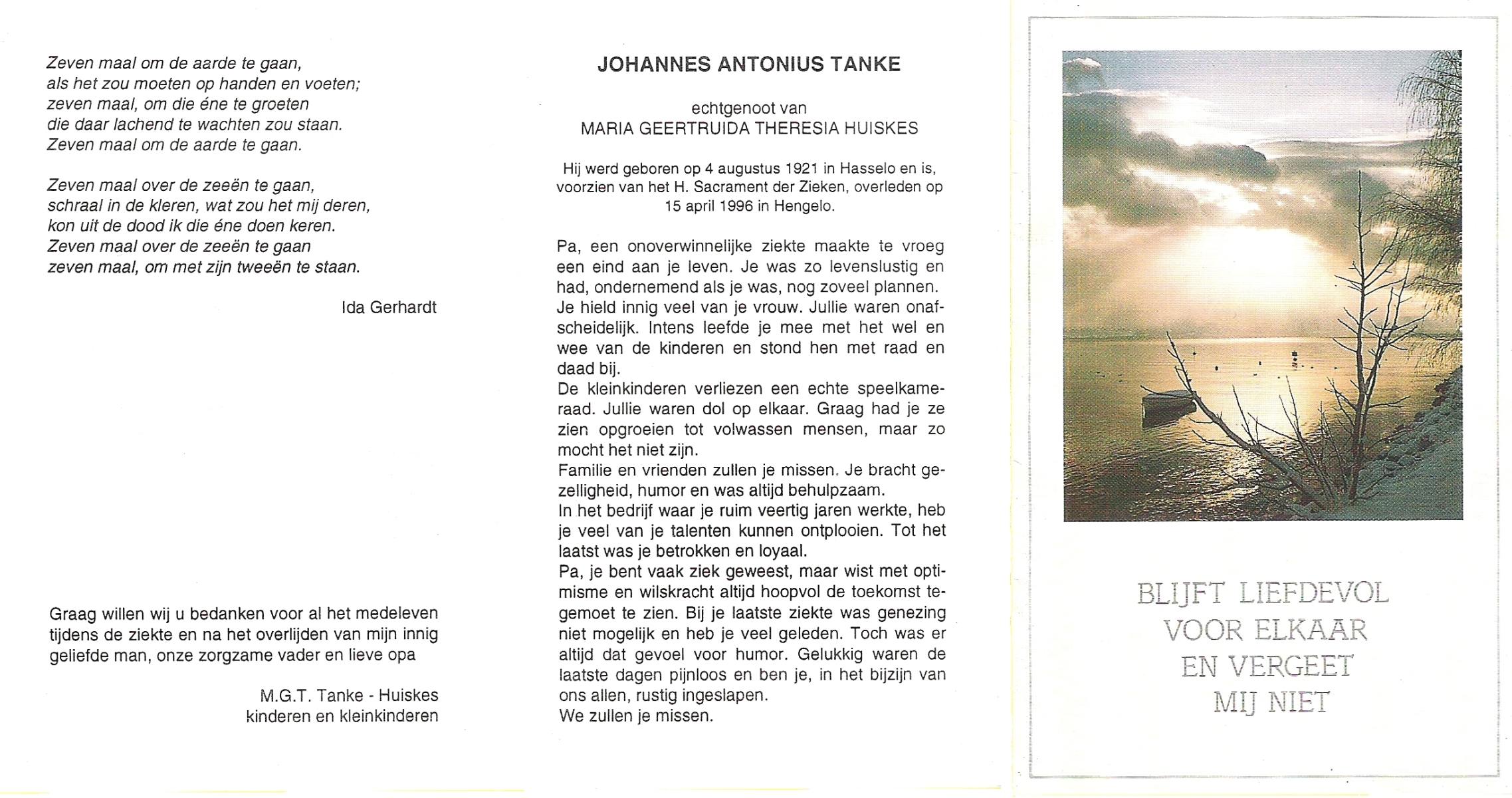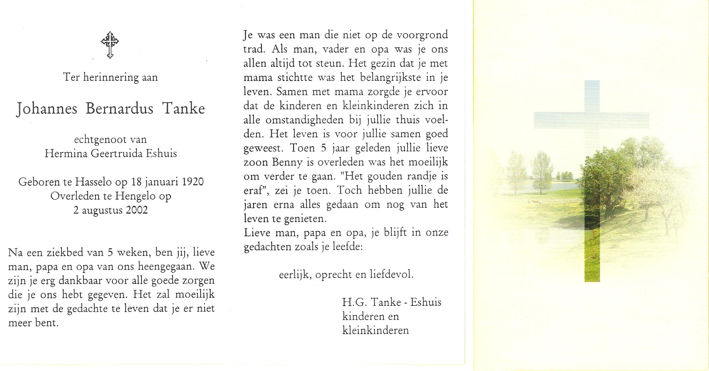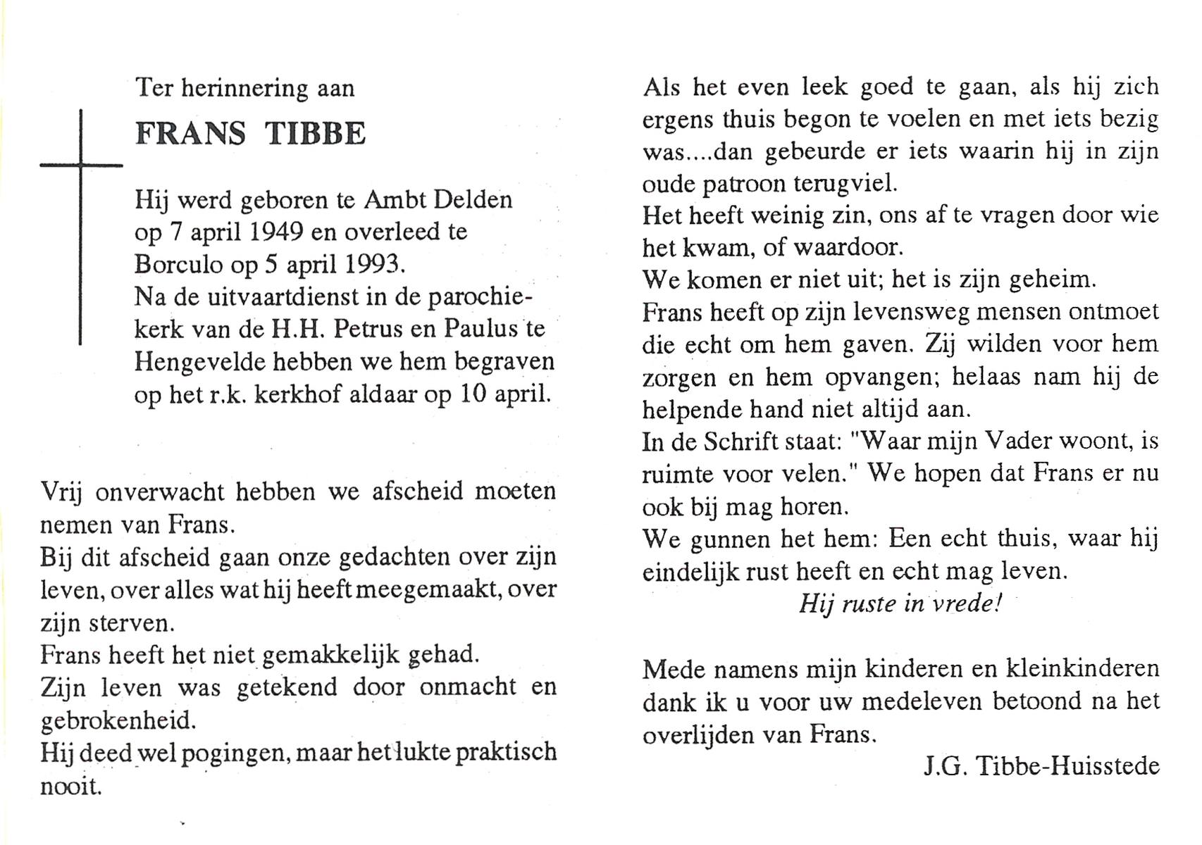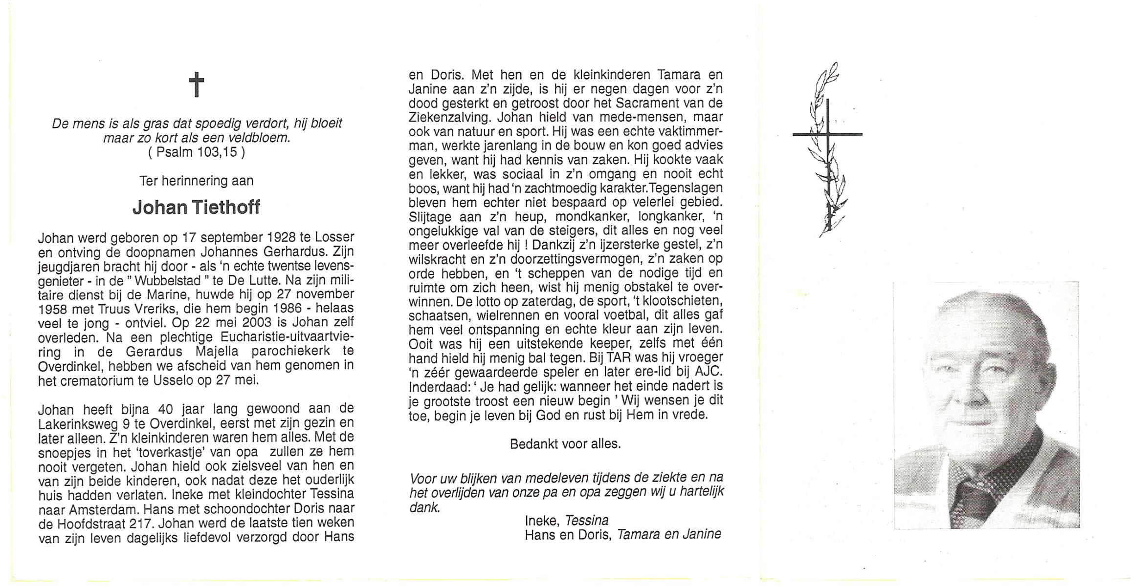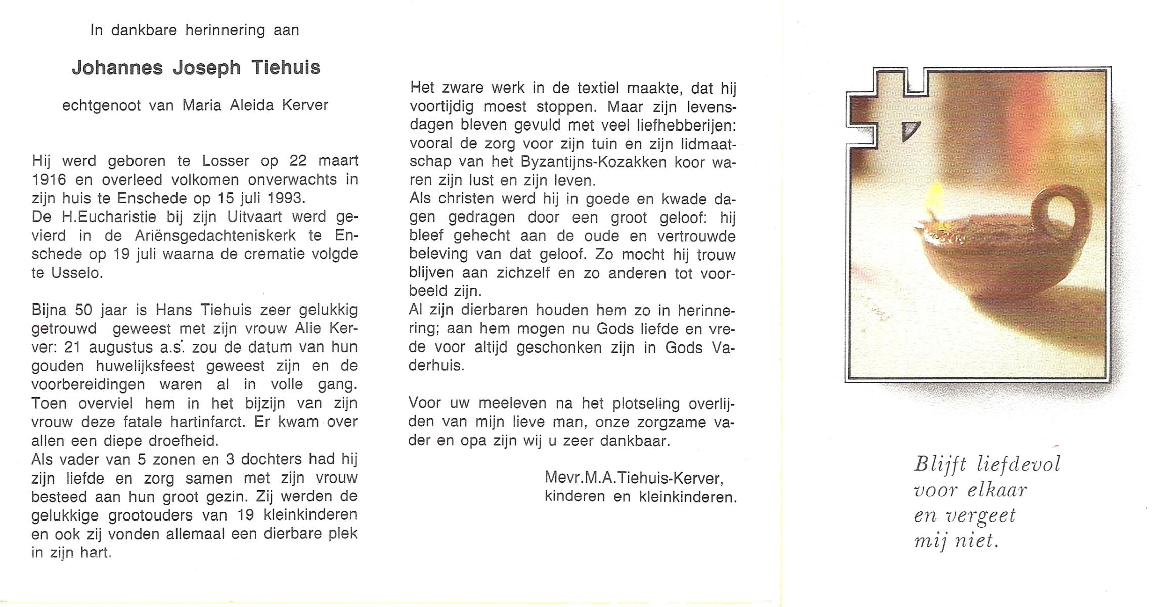 TIEHUIS, Johannes Joseph, geboren op 22-3-1916 te Losser, overleden op 15-7-1993 te Enschede op 77-jarige leeftijd, gecremeerd op 19-7-1993 te Usselo.