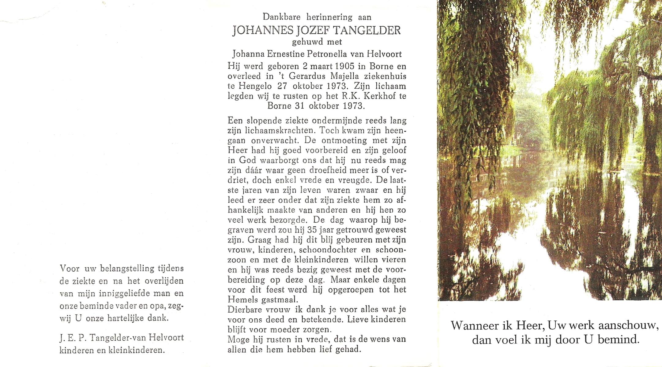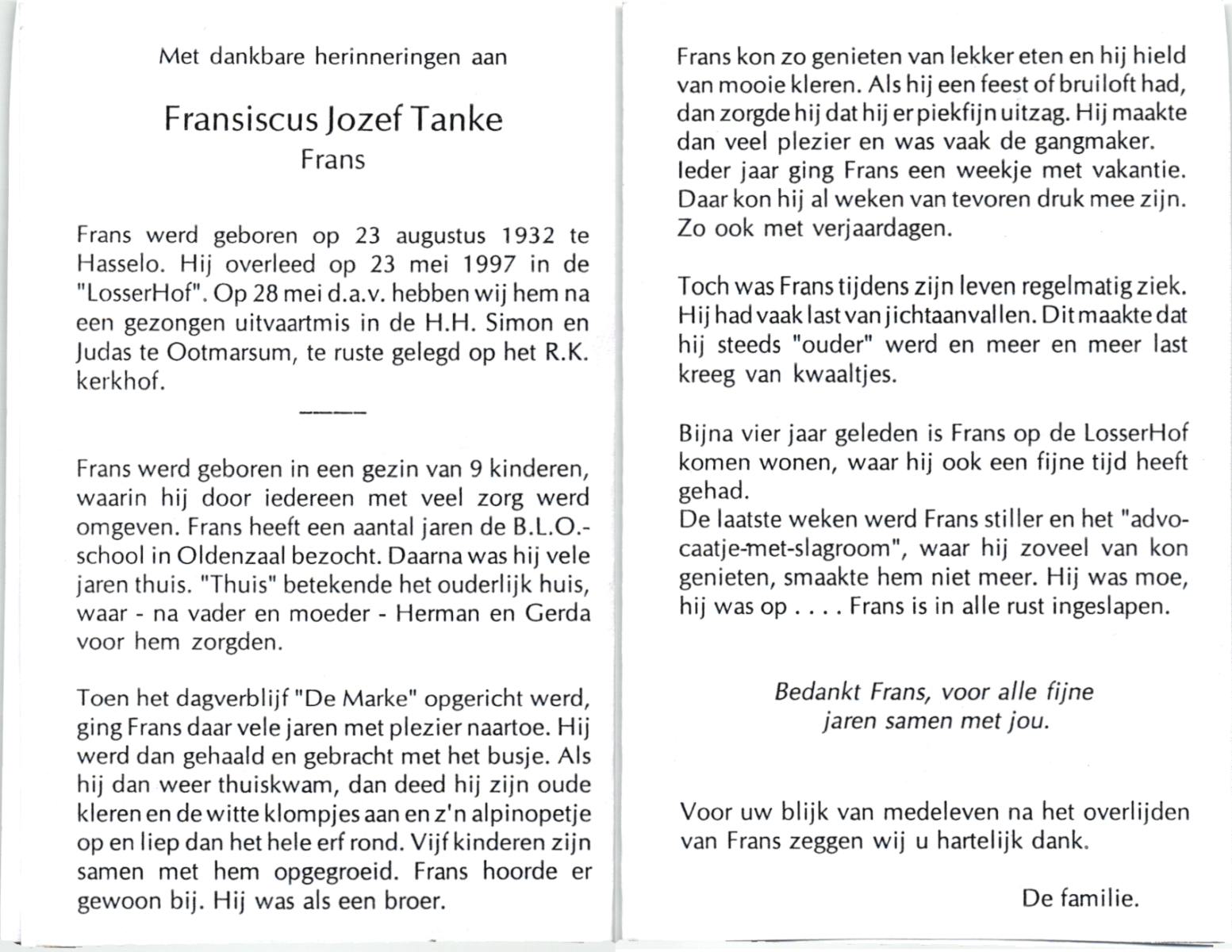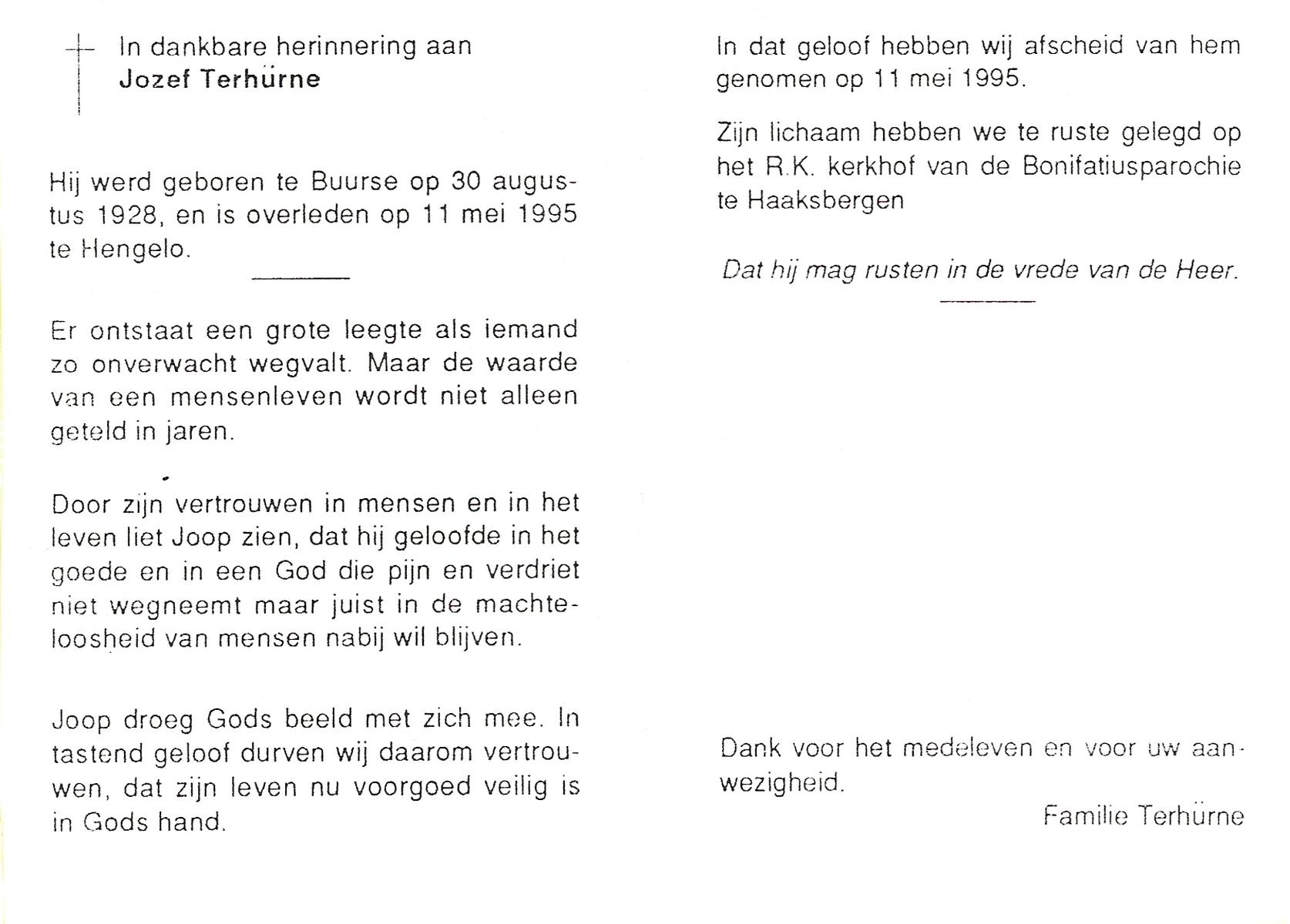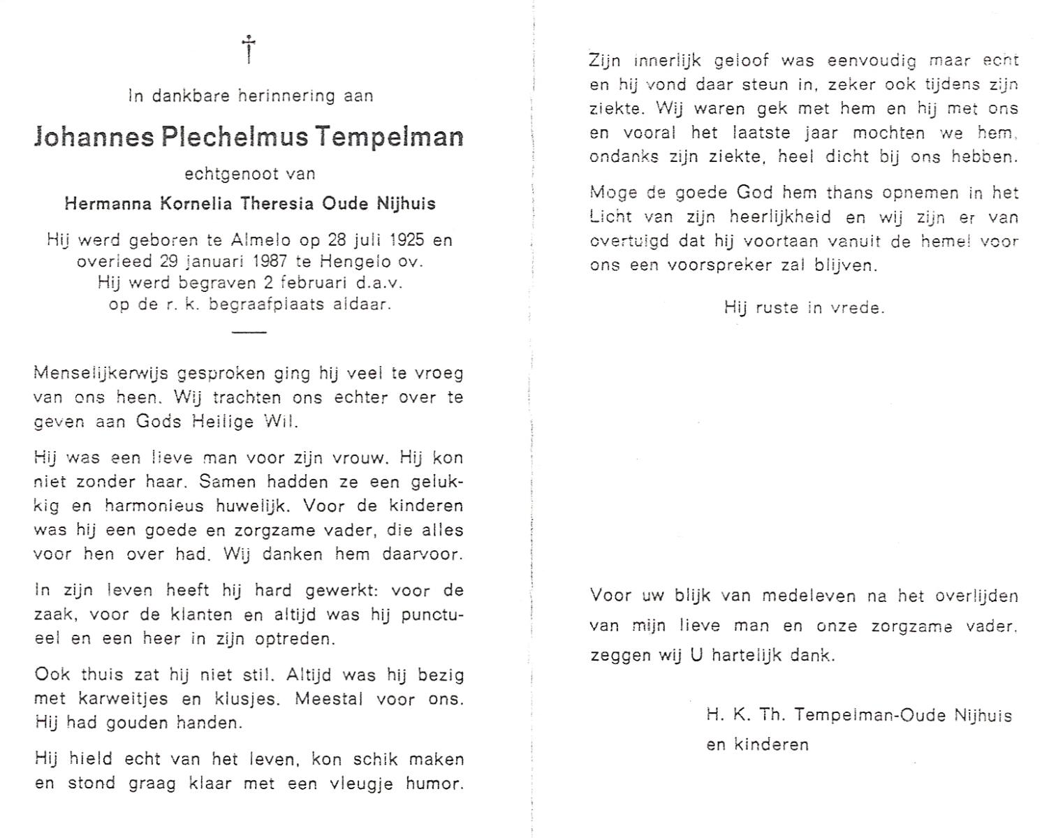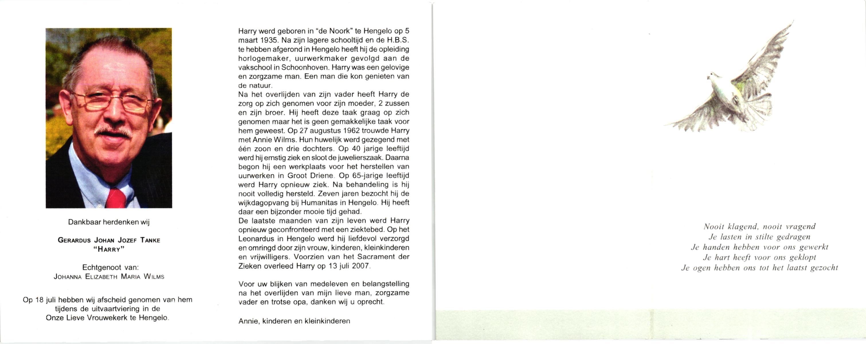 TIEHUIS, Johannes Joseph, geboren op 22-3-1916 te Losser, overleden op 15-7-1993 te Enschede op 77-jarige leeftijd, gecremeerd op 19-7-1993 te Usselo.