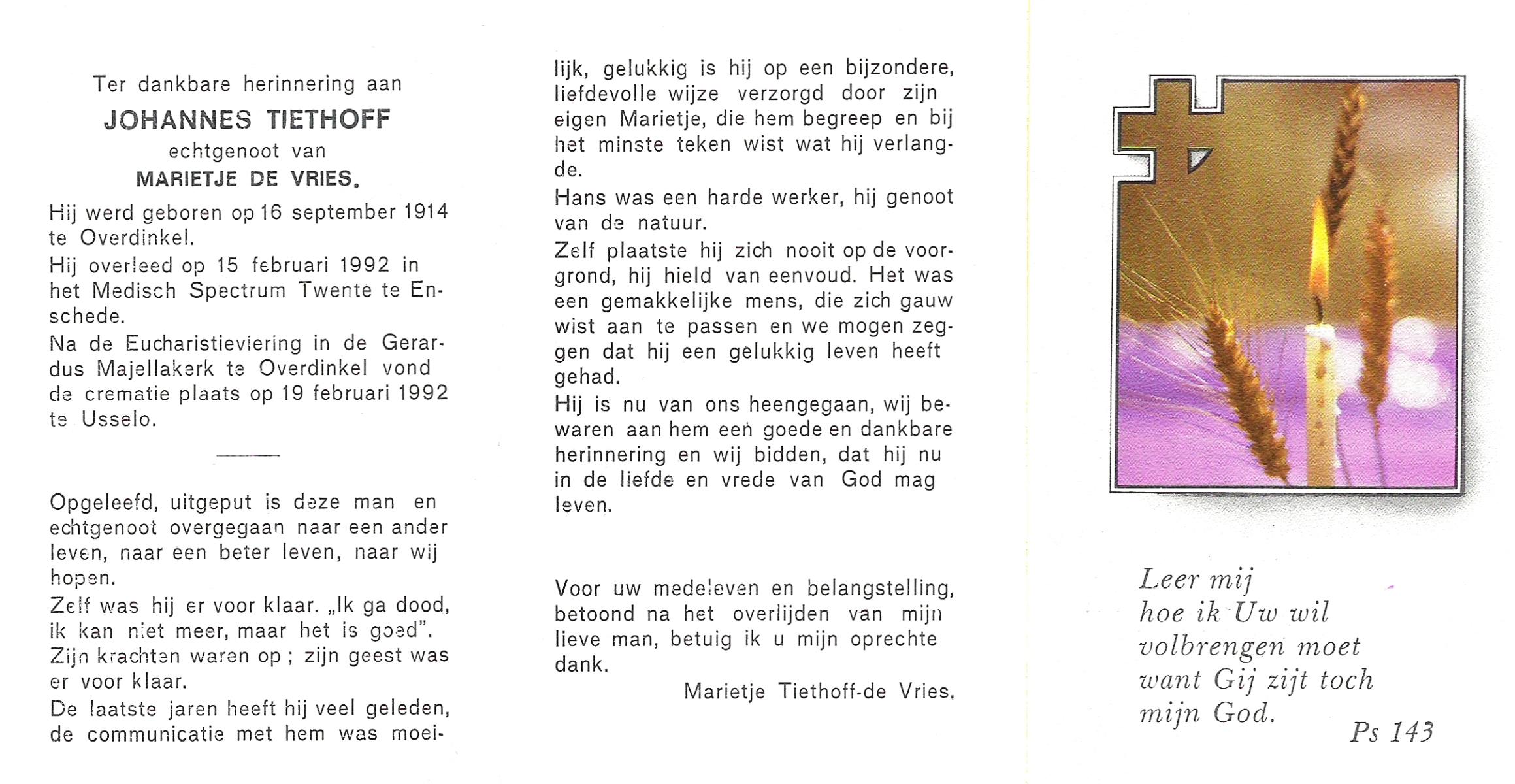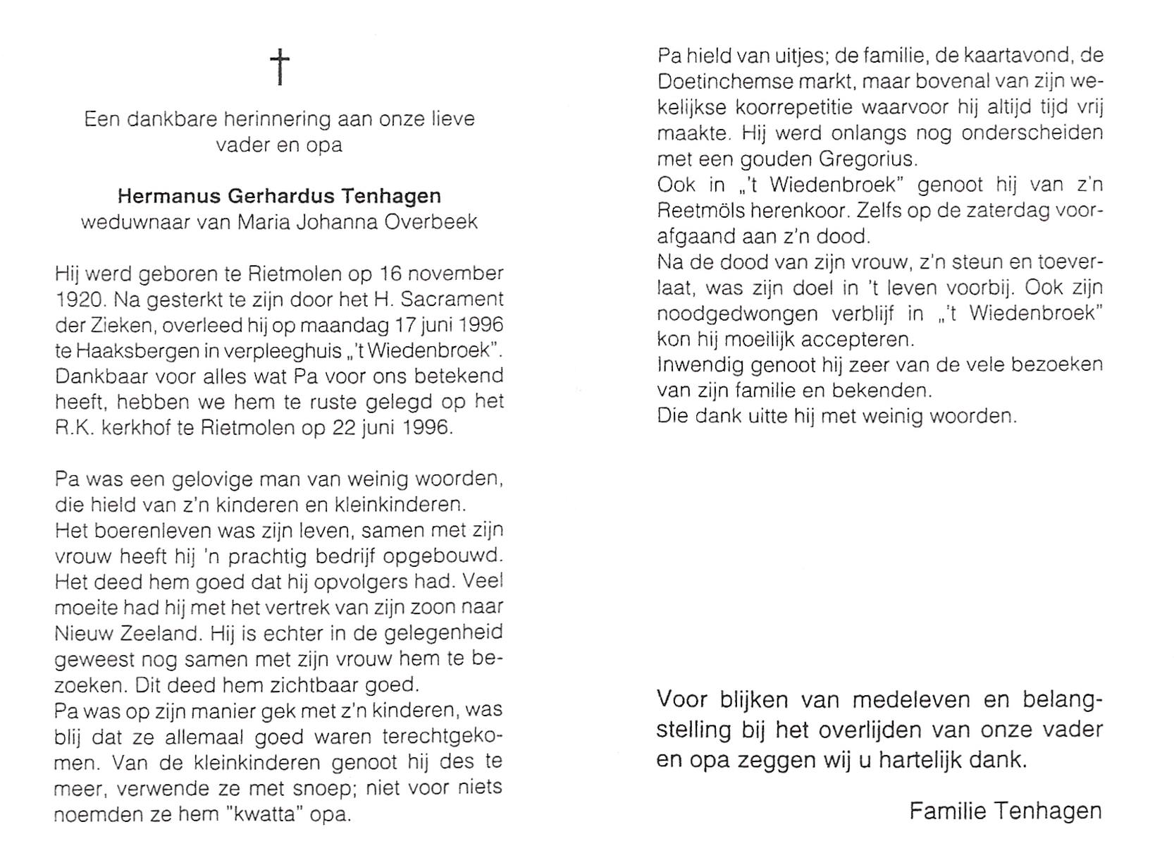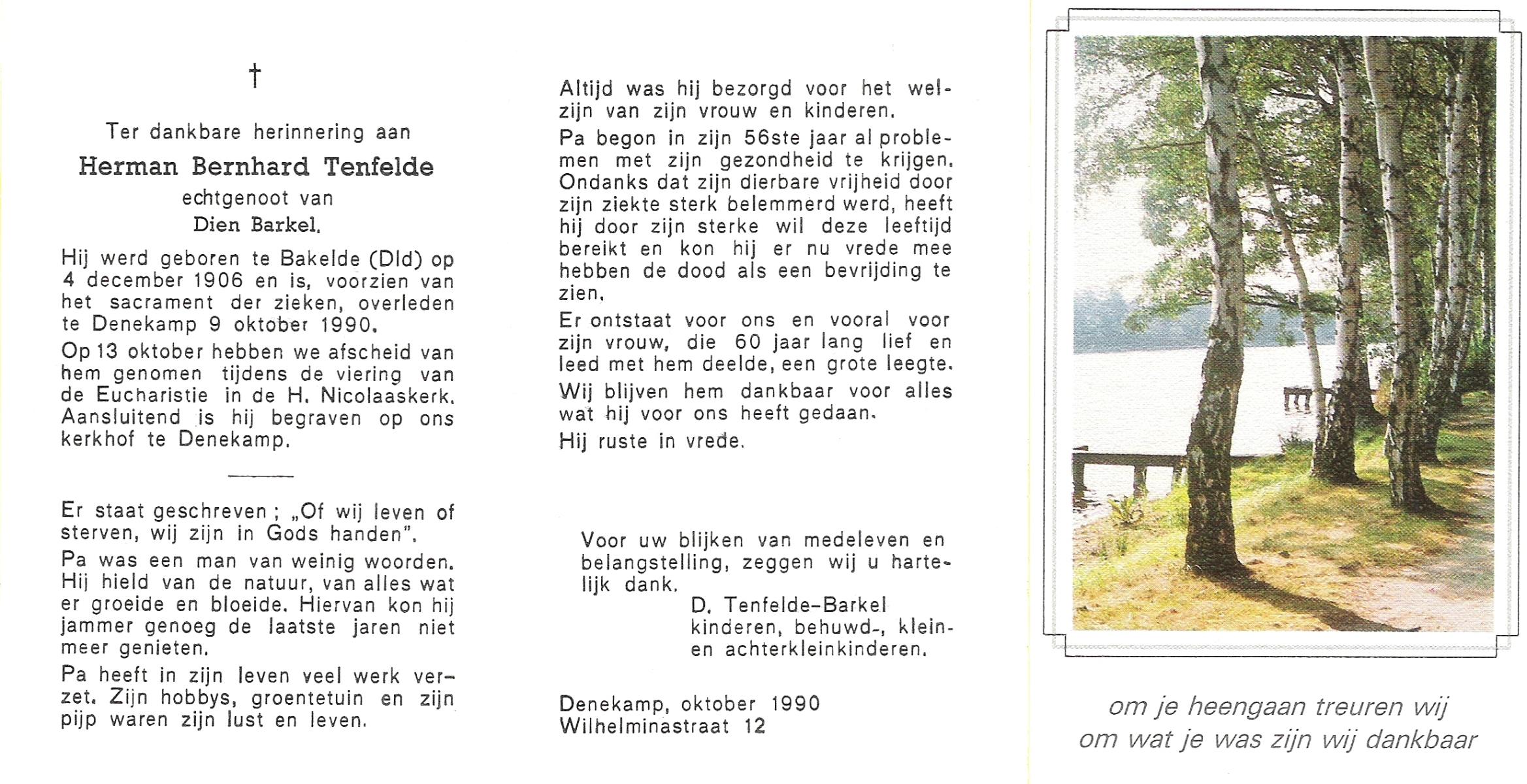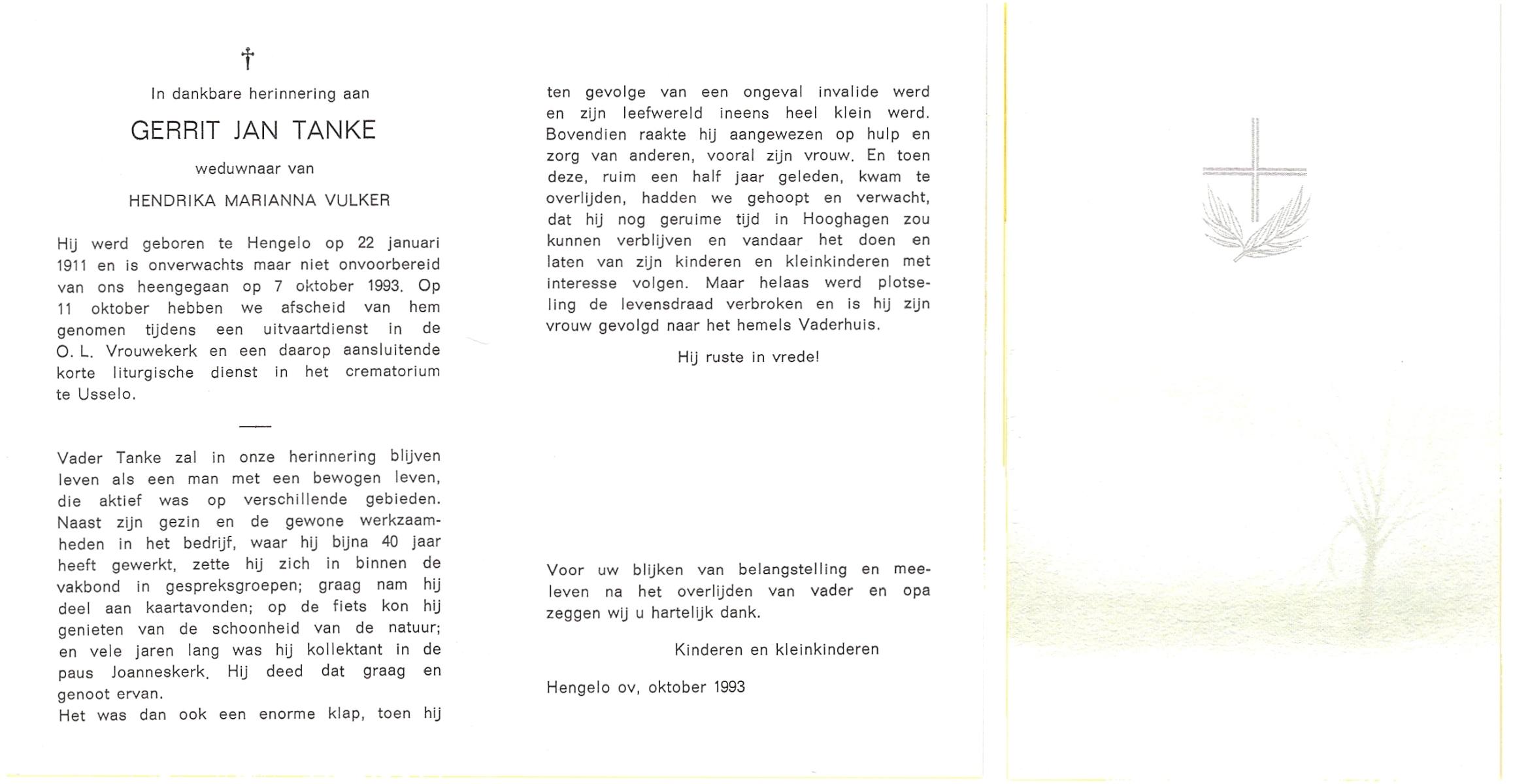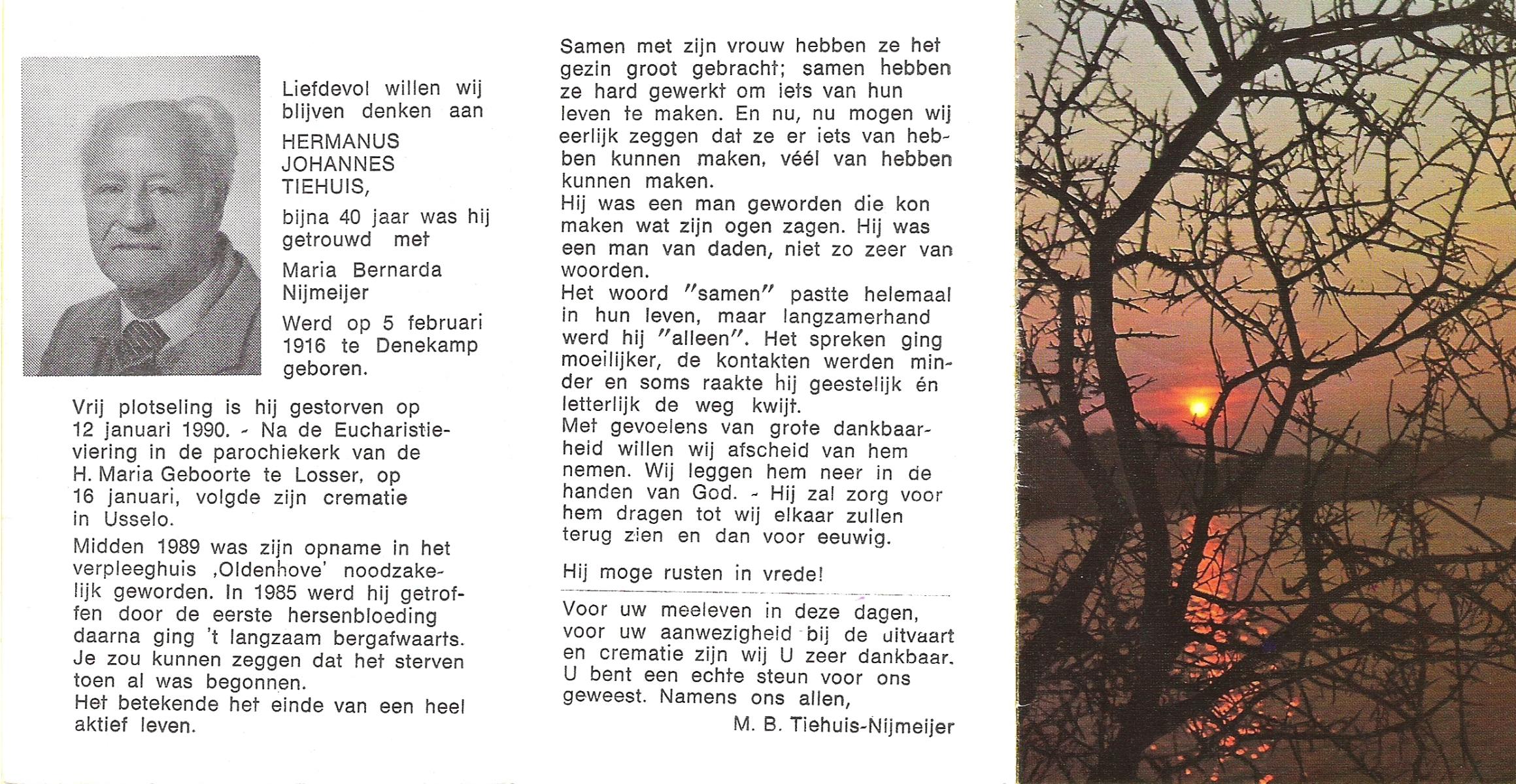 TIEHUIS, Hermanus Johannes, geboren op 5-2-1916 te Denekamp, overleden op 12-1-1990 op 73-jarige leeftijd, gecremeerd op 16-1-1990 te Usselo.