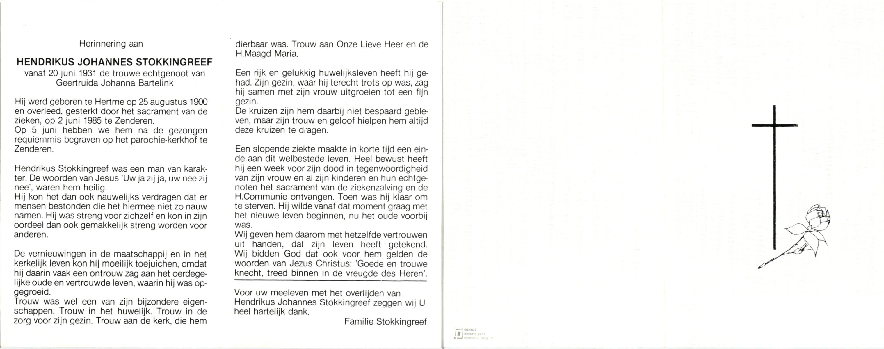 STOKKINGREEF, , Hendrikus Johannes, geboren op 25-8-1900 te Hertme, overleden op 2-6-1985 te Zenderen op 84-jarige leeftijd, begraven op 5-6-1985 te Zenderen.