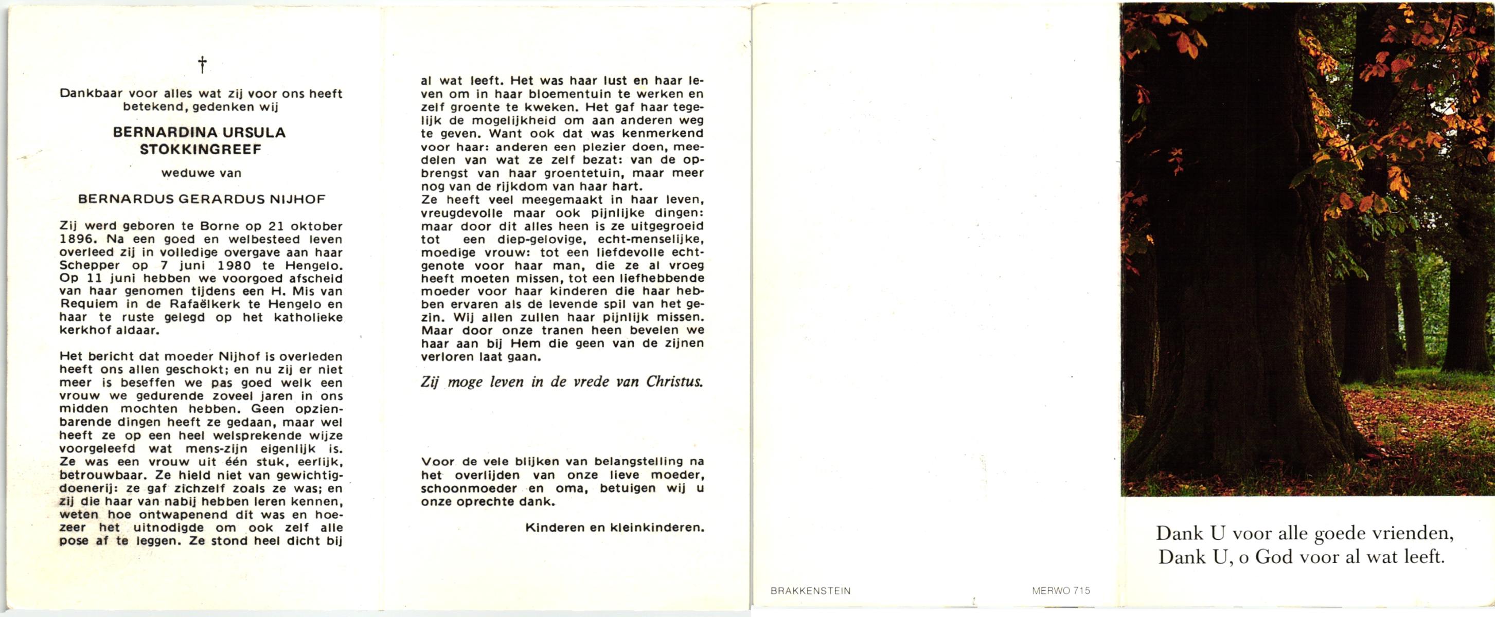 STOKKINGREEF, , Bernardina Ursula, geboren op 21-10-1896 te Borne, overleden op 7-6-1980 te Hengelo (O) op 83-jarige leeftijd, begraven op 11-6-1980 te Hengelo.