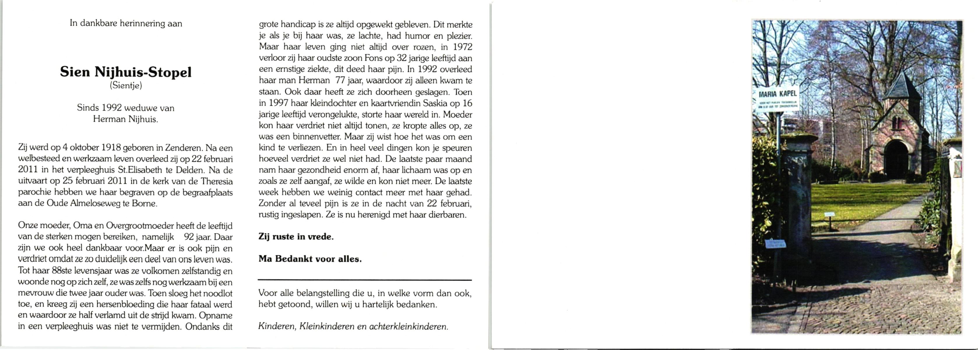 STOPEL, , Sien, geboren op 4-10-1918 te Zenderen, overleden op 22-2-2011 te Delden op 92-jarige leeftijd, begraven op 25-2-2011 te Borne.