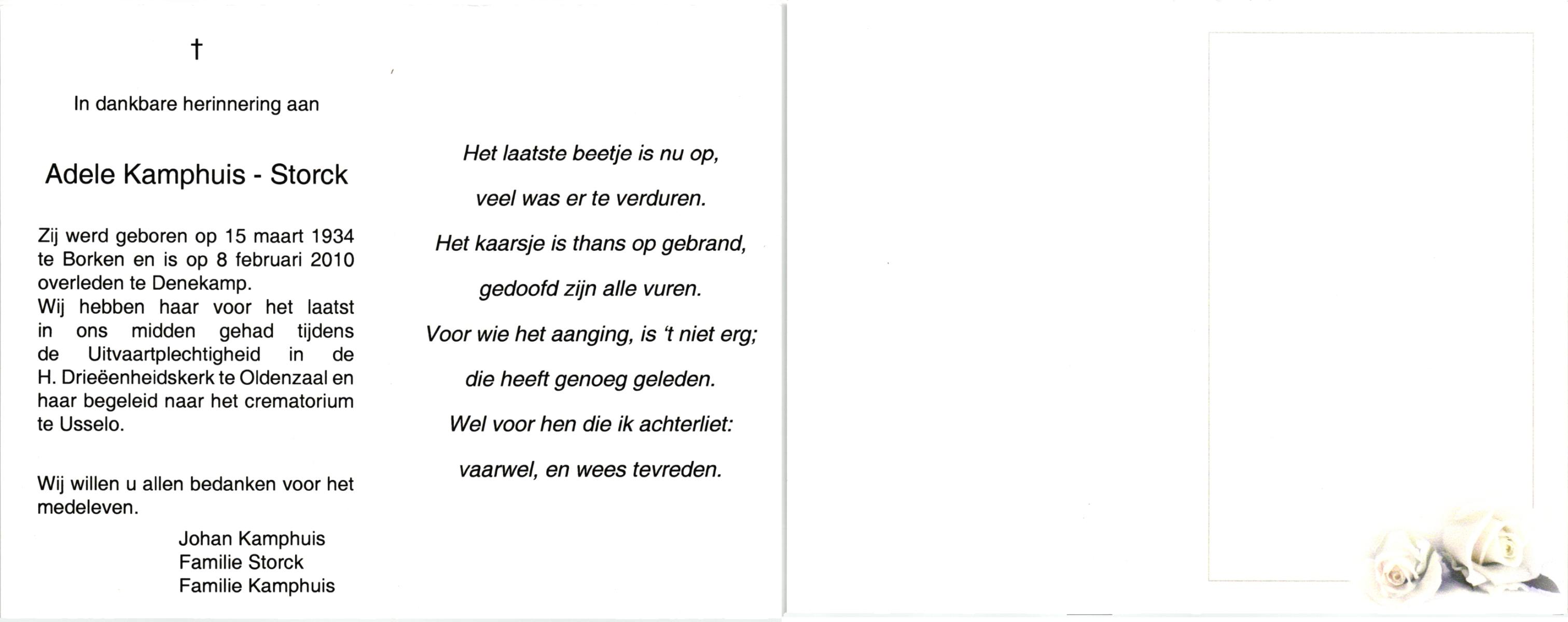 STORCK, , Adele, geboren op 15-3-1934 te Borken, overleden op 8-2-2010 te Denekamp op 75-jarige leeftijd, gecremeerd te Usselo.