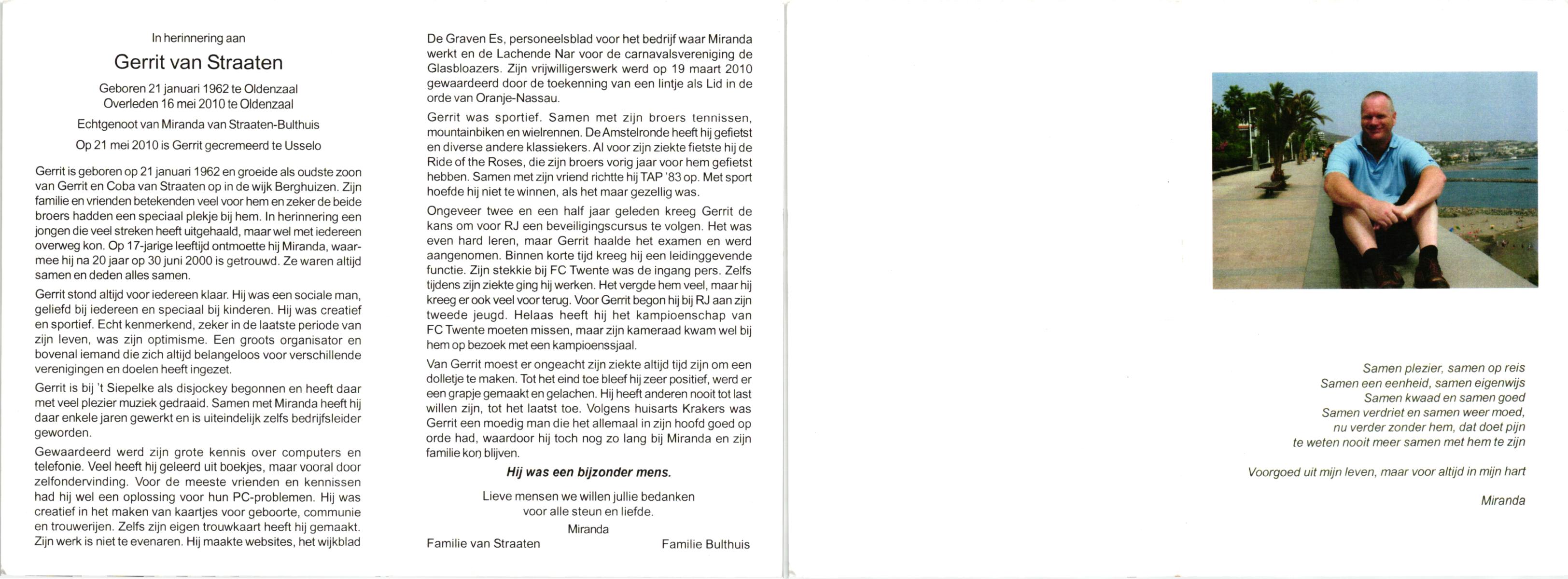 STRAATEN, van, Gerrit, geboren op 21-1-1962 te Oldenzaal, overleden op 16-5-2010 te Oldenzaal op 48-jarige leeftijd, gecremeerd op 21-5-2010 te Usselo.
