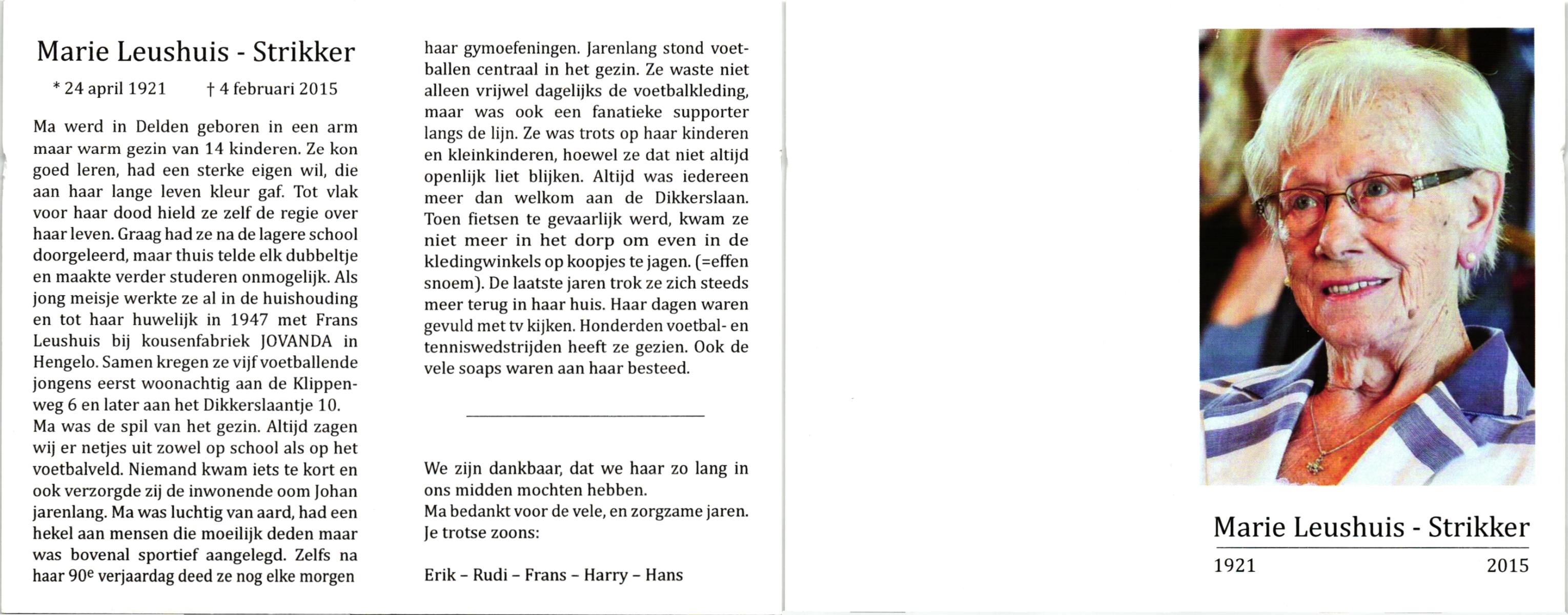 STRIKKER, , Marie, geboren op 24-4-1921 te Delden, overleden op 4-2-2015 op 93-jarige leeftijd.