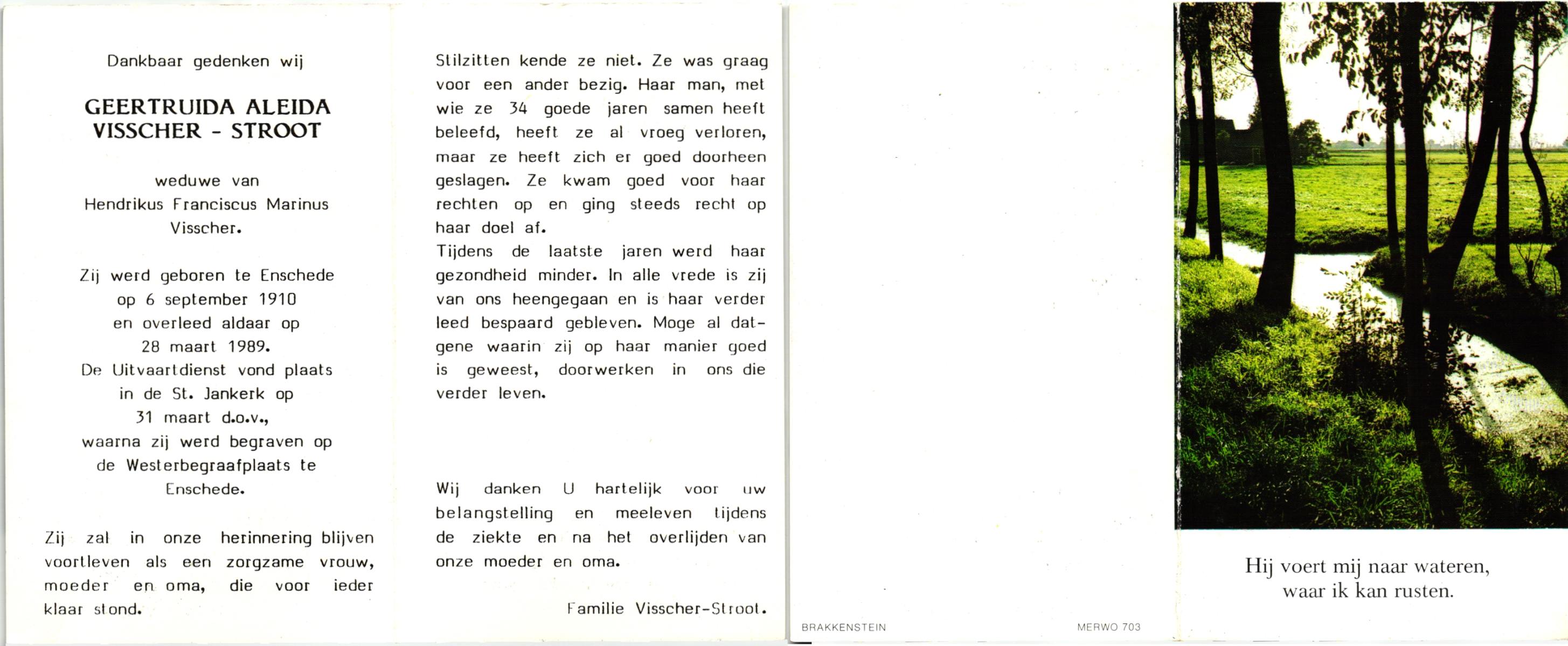 STROOT, , Geertruida Aleida, geboren op 6-9-1910 te Enschede, overleden op 28-3-1989 te Enschede op 78-jarige leeftijd, begraven op 31-3-1989 te Enschede.