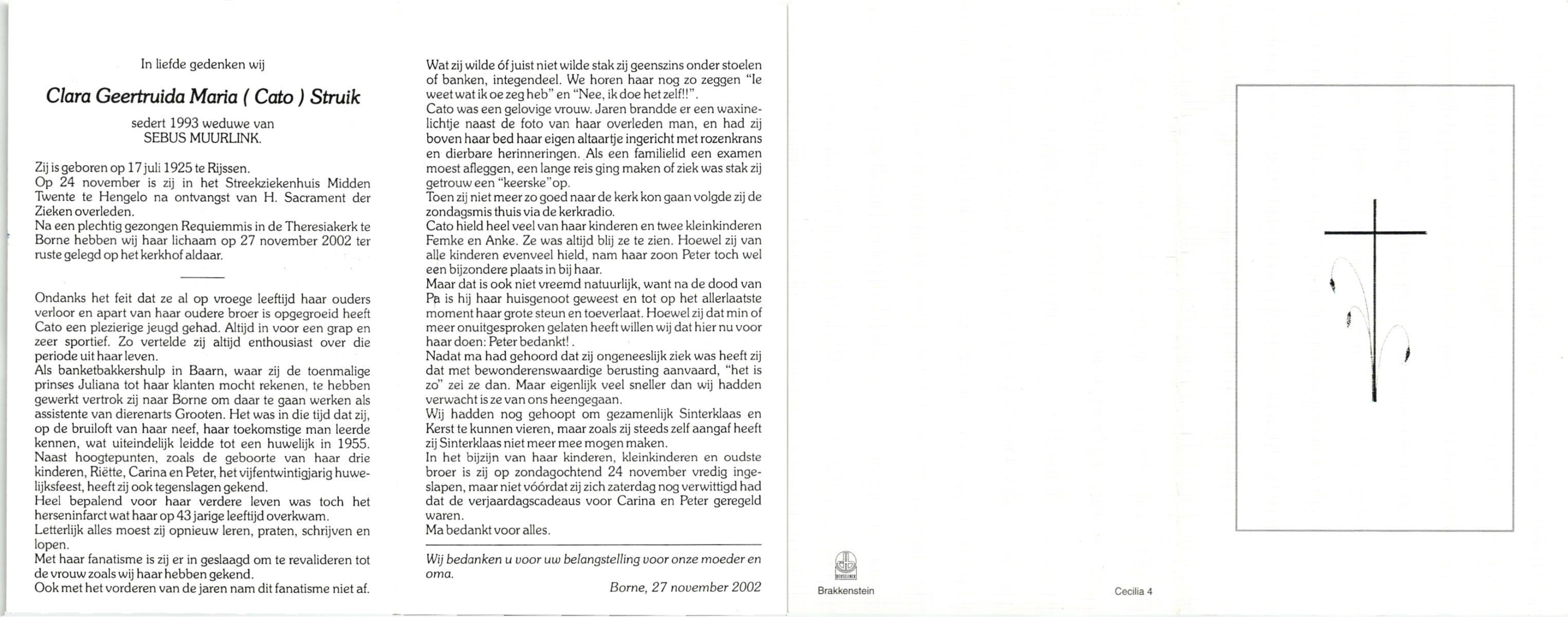 STRUIK, Anna Gerarda Maria, geboren op 22-5-1917 te Rijssen, overleden op 12-10-1993 te Rijssen op 76-jarige leeftijd, begraven op 16-10-1993 te Rijssen.