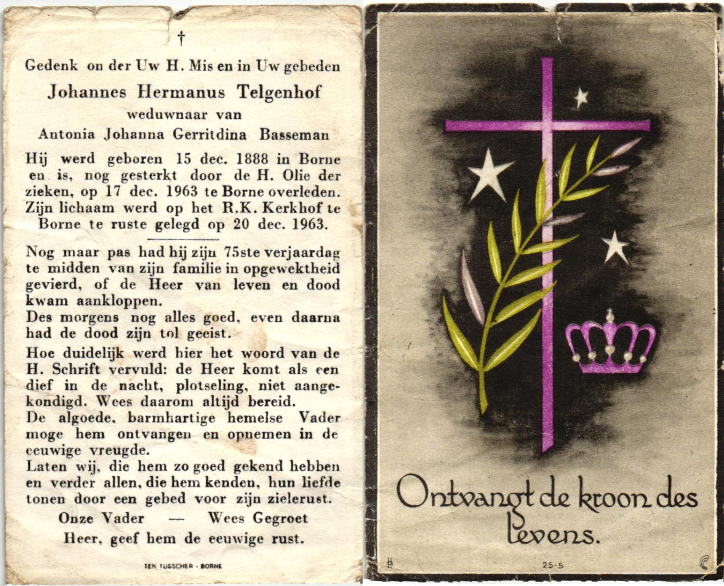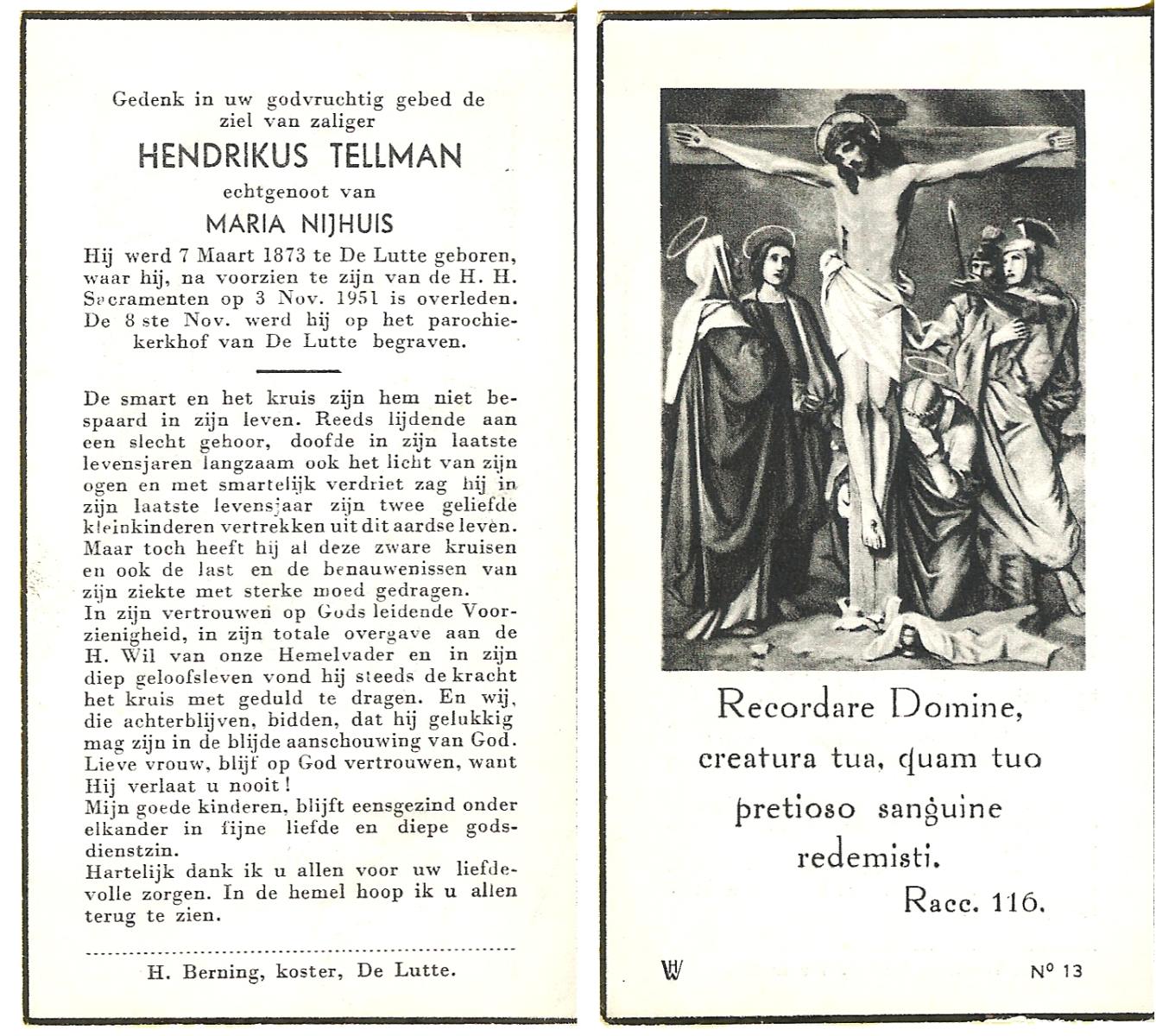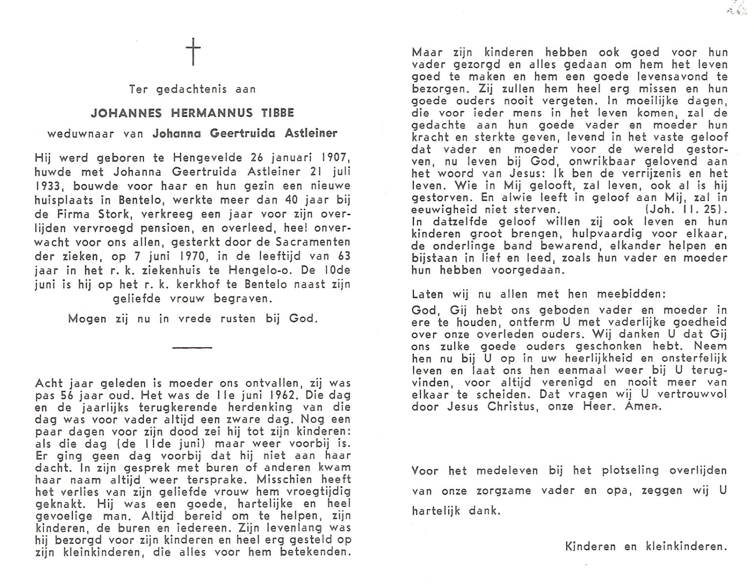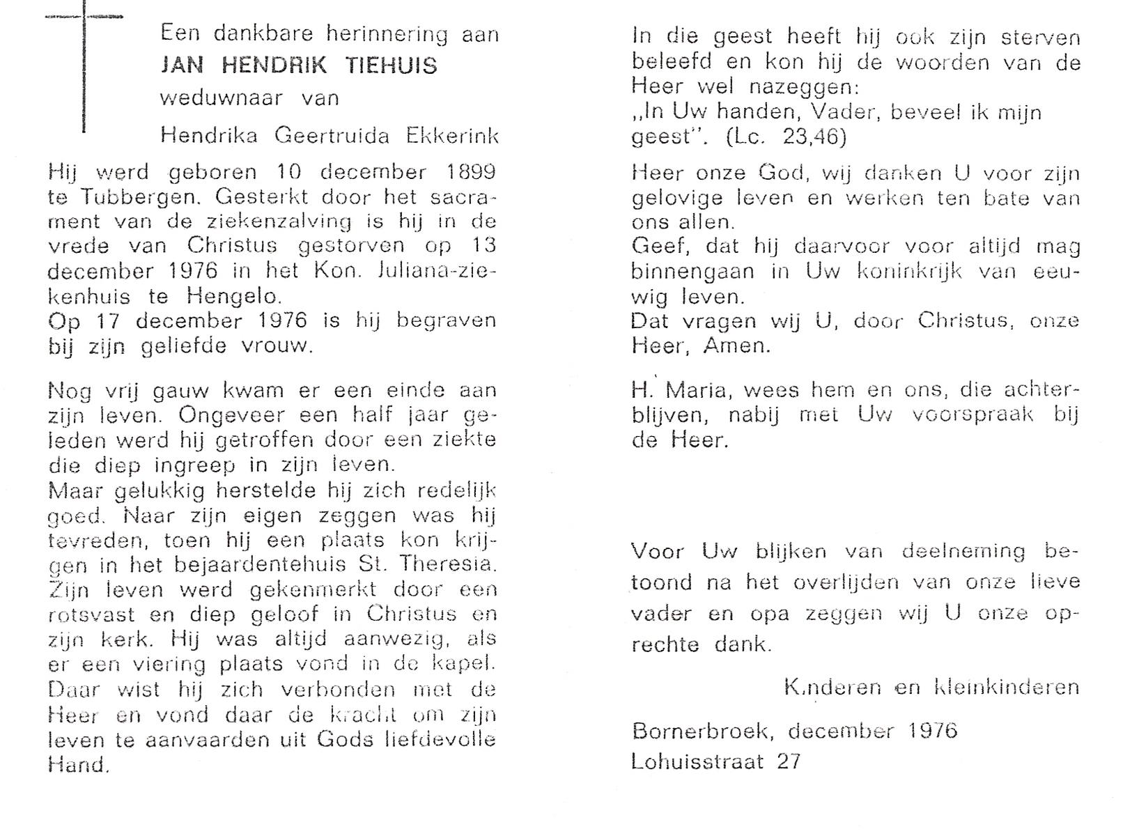 TIEHUIS, Jan Hendrik, geboren op 10-12-1899 te Tubbergen, overleden op 13-12-1976 te Hengelo (Ov.) op 77-jarige leeftijd, begraven op 17-12-1976 te Hengelo (Ov.).