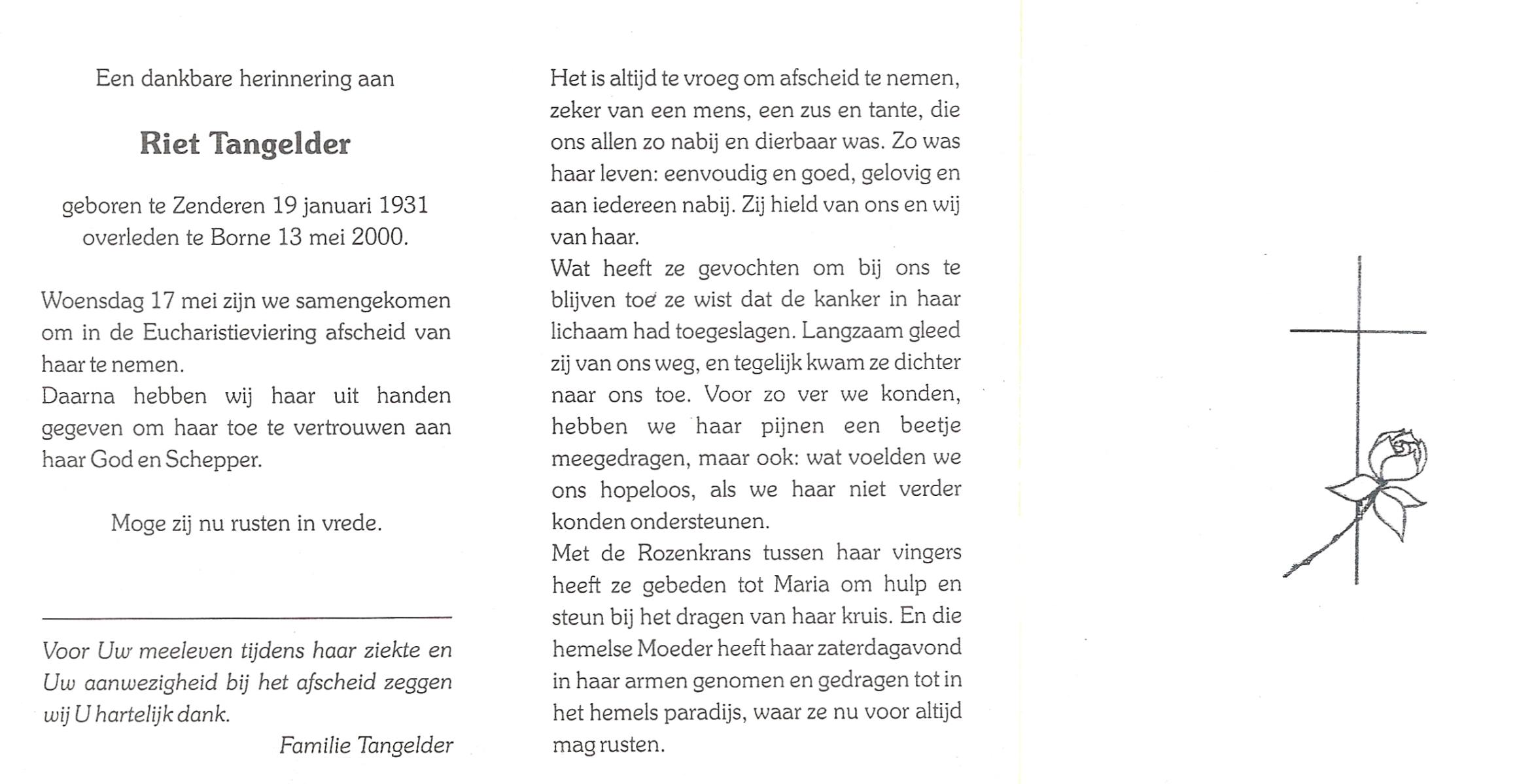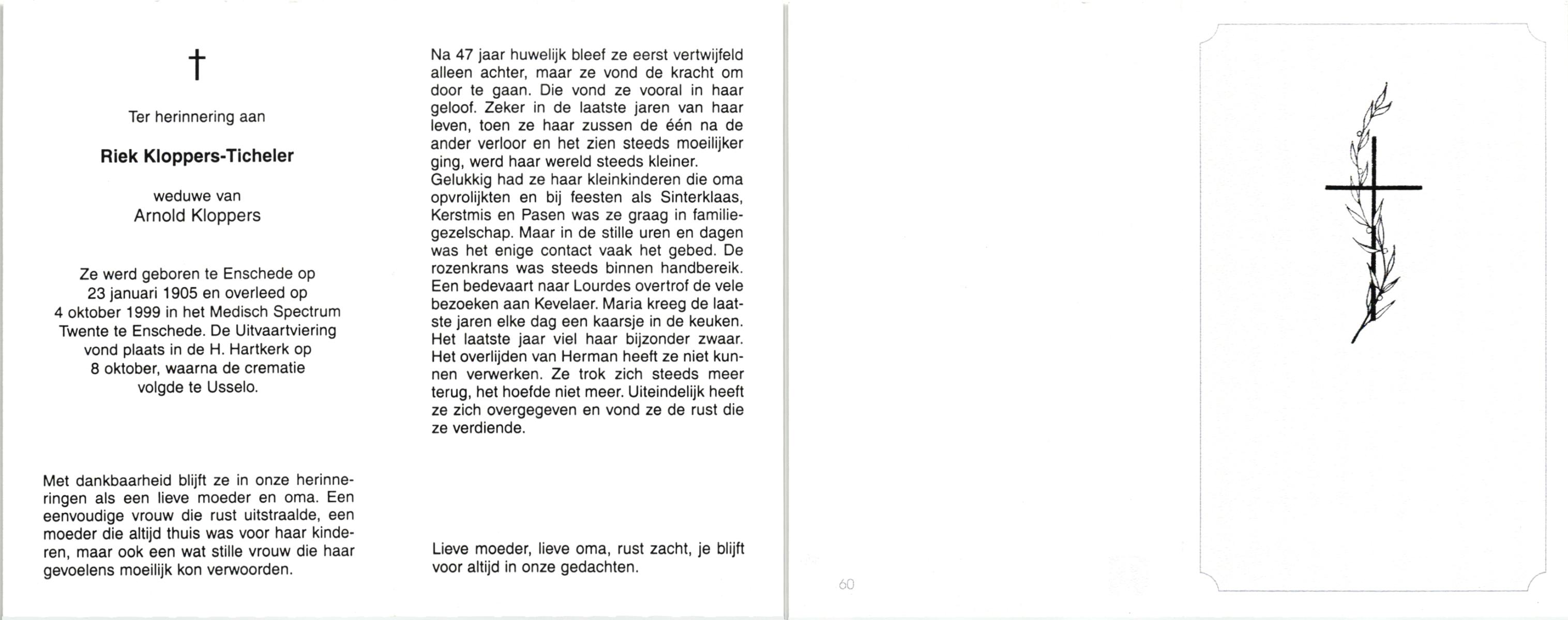 TICHELER, , Riek, geboren op 23-1-1905 te Enschede, overleden op 4-10-1999 te Enschede op 94-jarige leeftijd, gecremeerd op 8-10-1999 te Usselo.