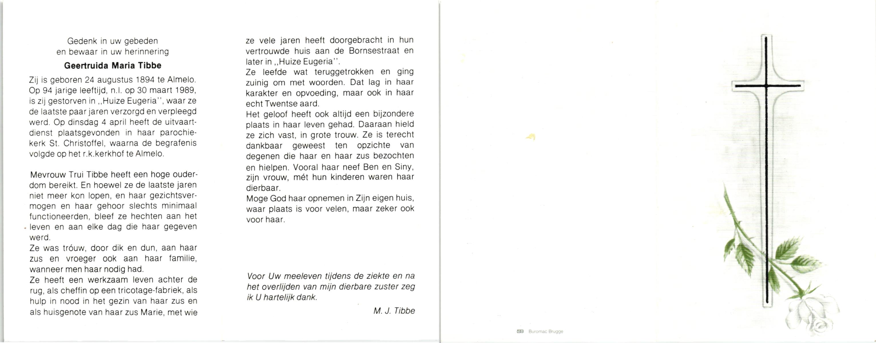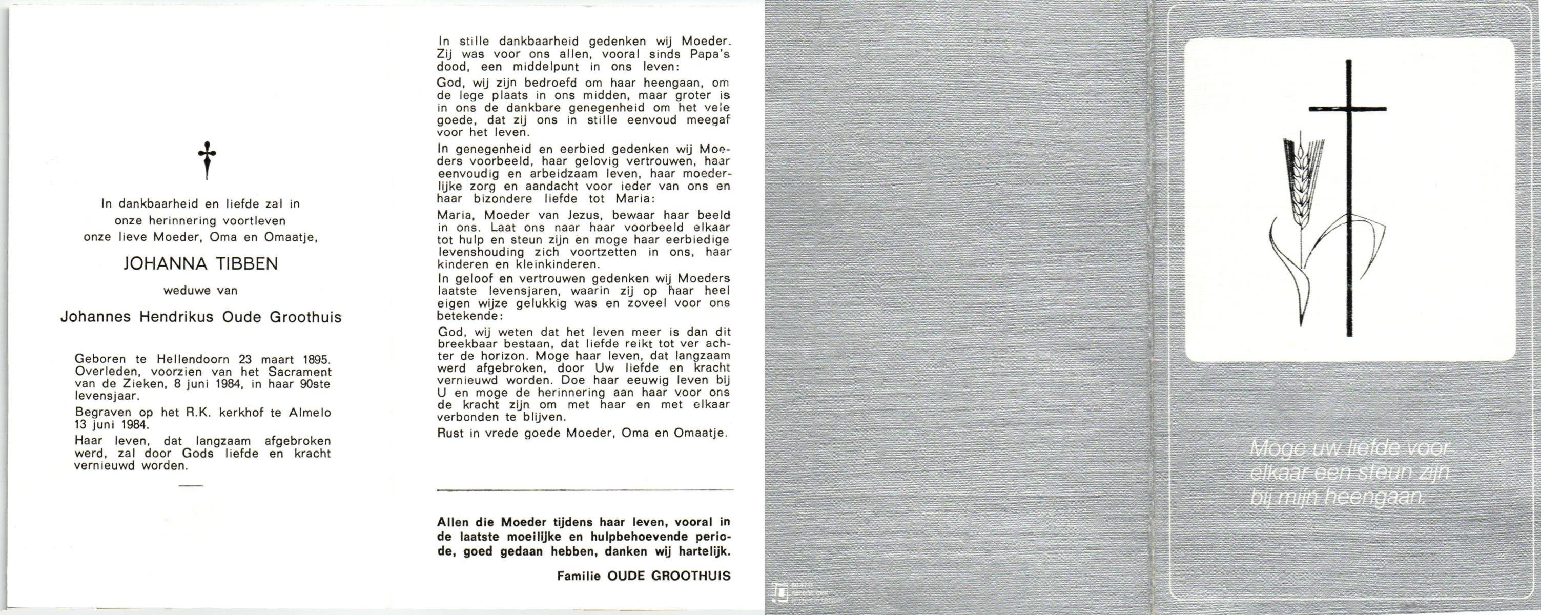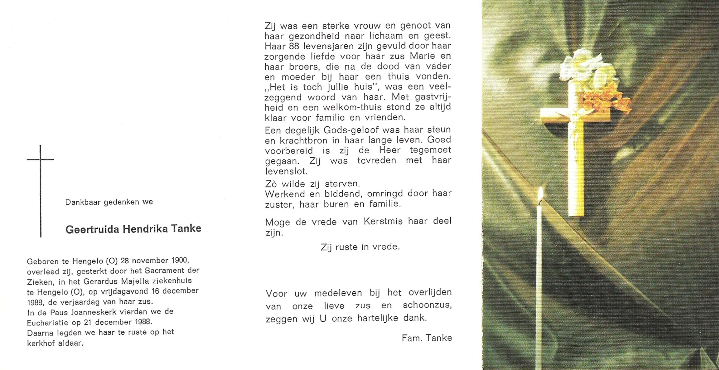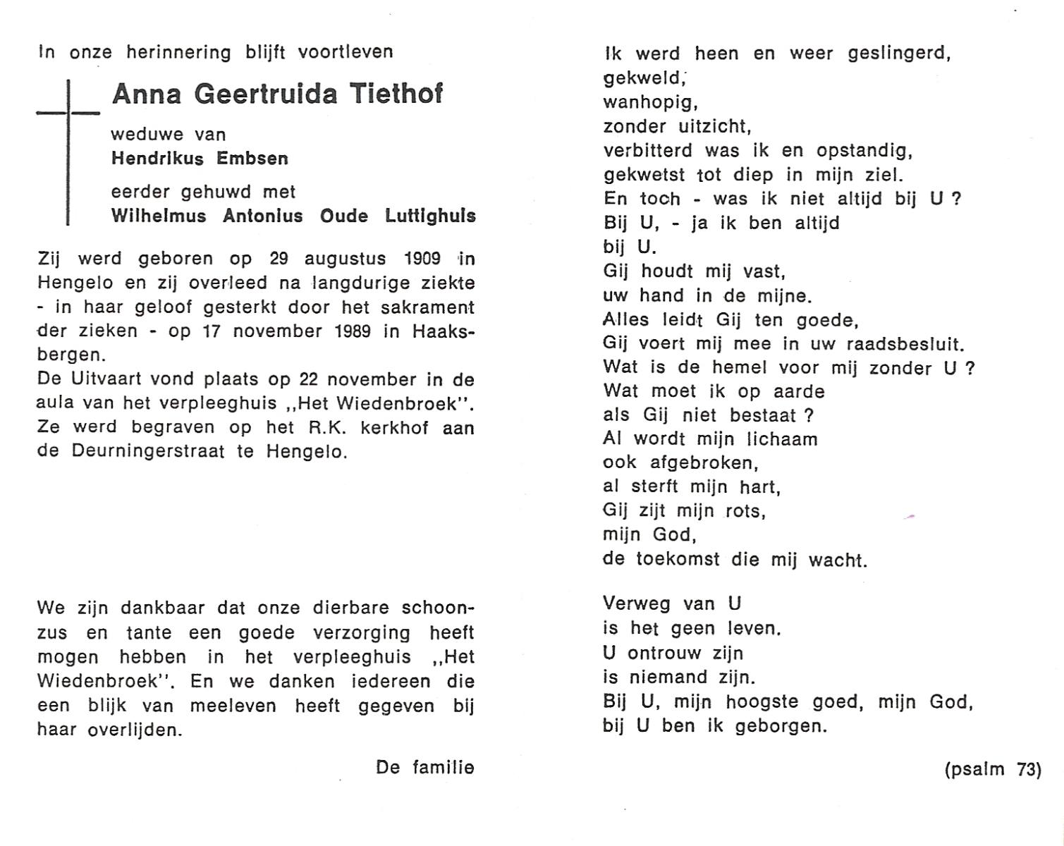 TIETHOF, Anna Geertruida, geboren op 29-8-1909 te Hengelo (O), overleden op 17-11-1989 te Haaksbergen op 80-jarige leeftijd, begraven op 22-11-1989 te Hengelo (Ov.).