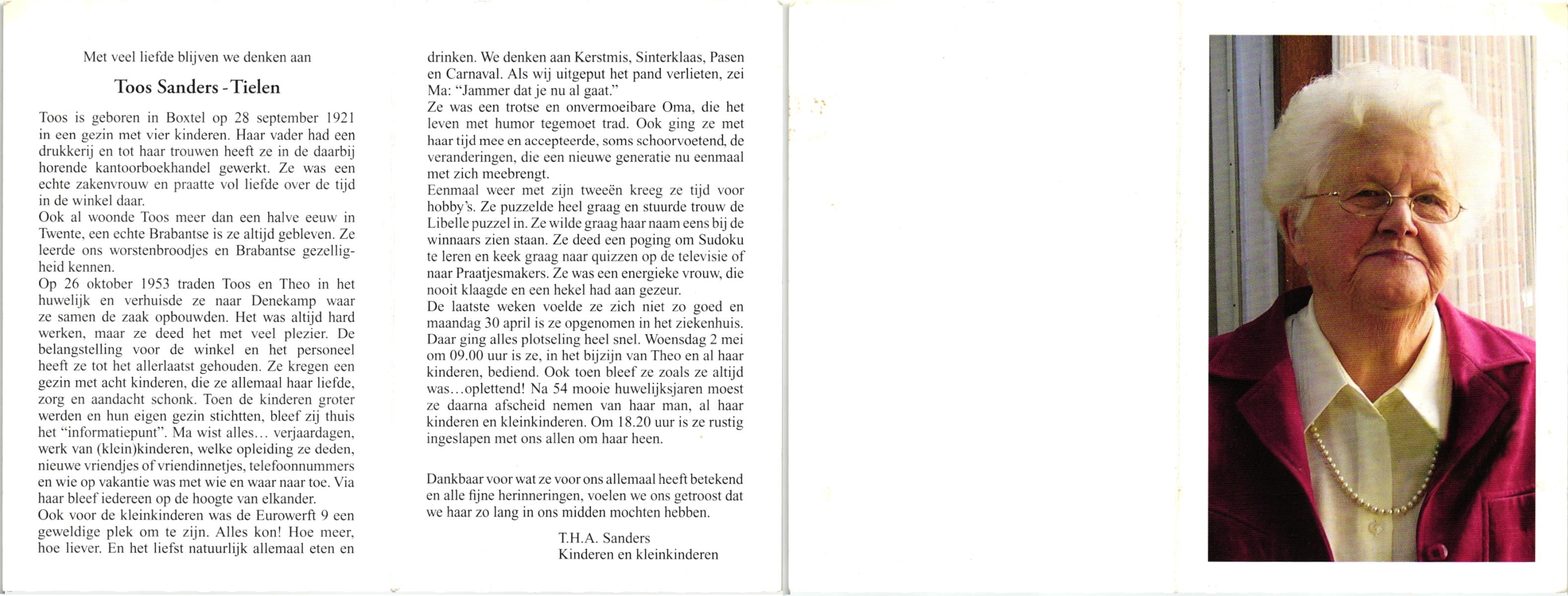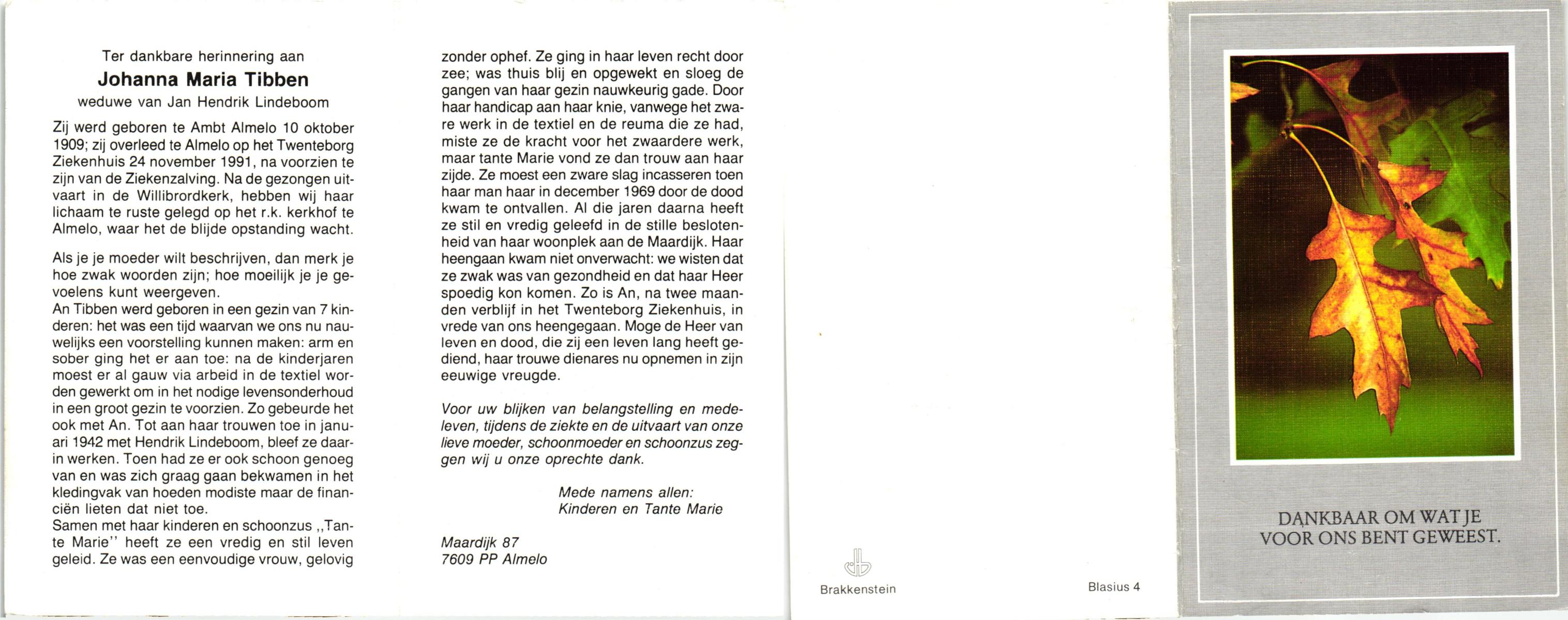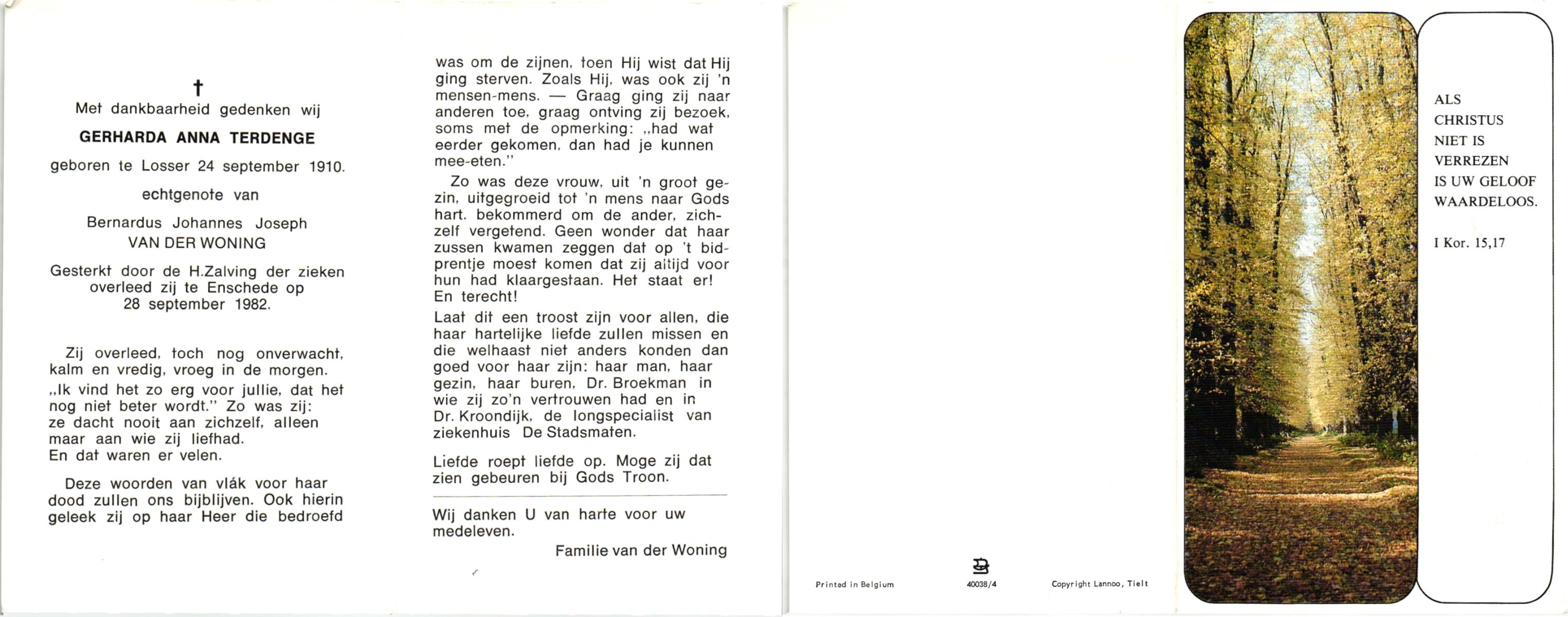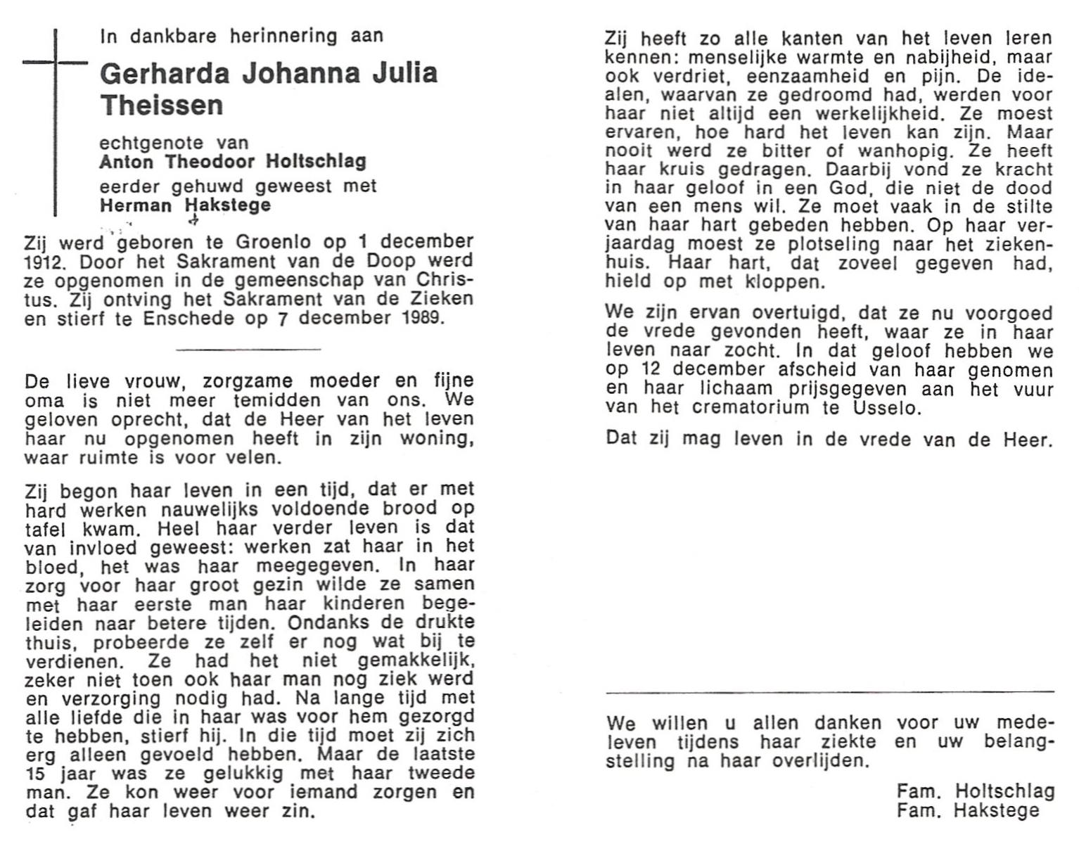 TIETHOF, Anna Geertruida, geboren op 29-8-1909 te Hengelo (O), overleden op 17-11-1989 te Haaksbergen op 80-jarige leeftijd, begraven op 22-11-1989 te Hengelo (Ov.).